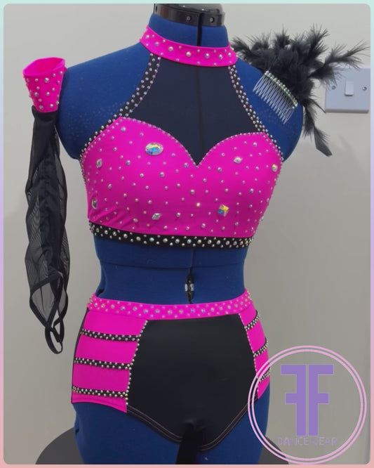 BESPOKE Neon Pink & Black Stoned Modern / Tap / Acro Dance Costume (AS)