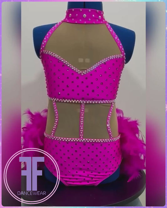 BESPOKE Cerise Pink Feather Bustle Stoned Modern / Tap Dance Costume (9/10 yrs)