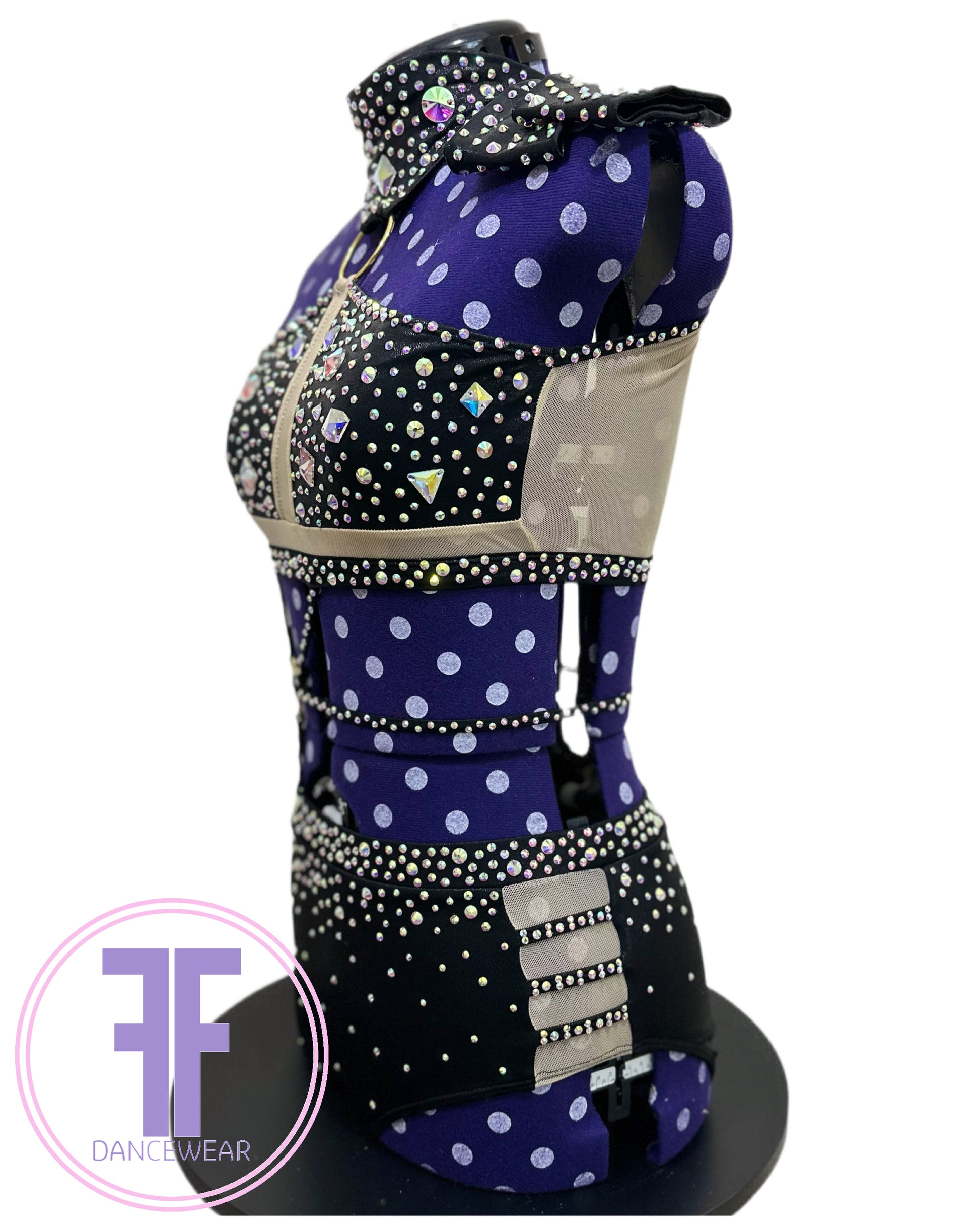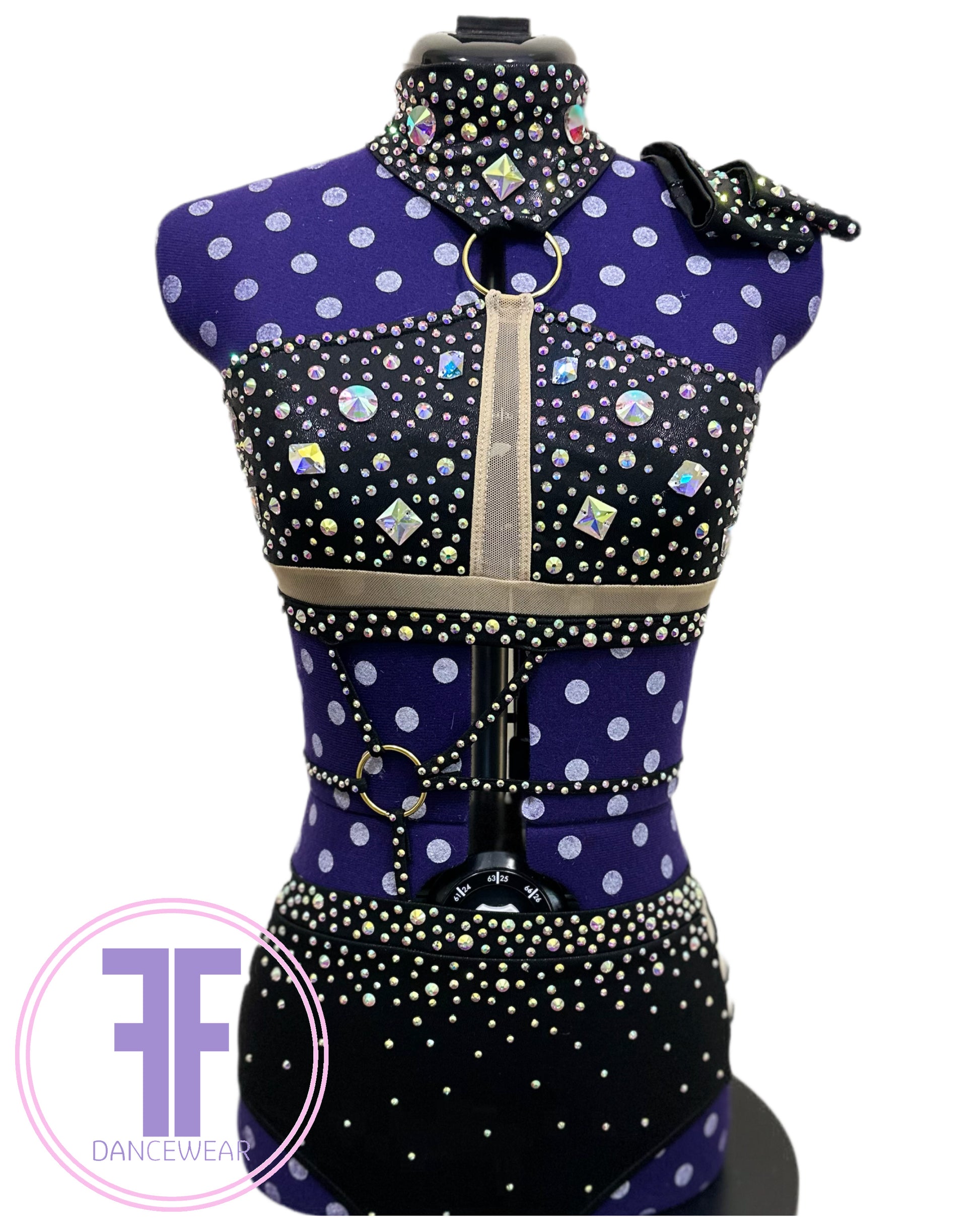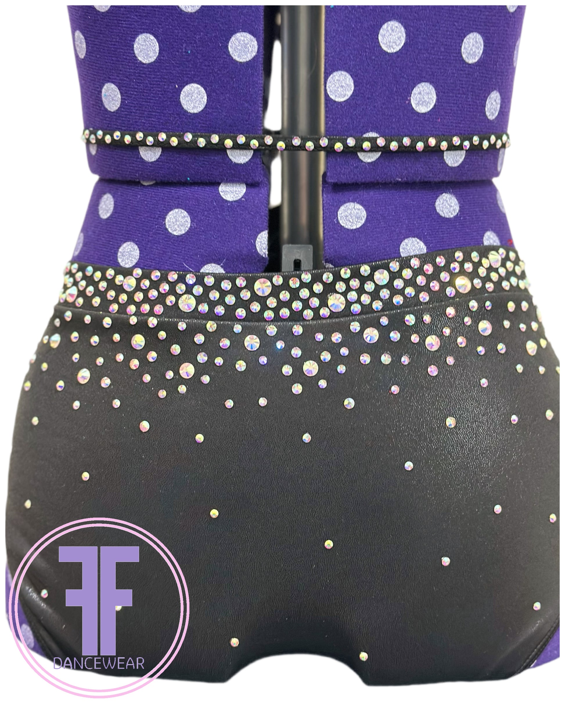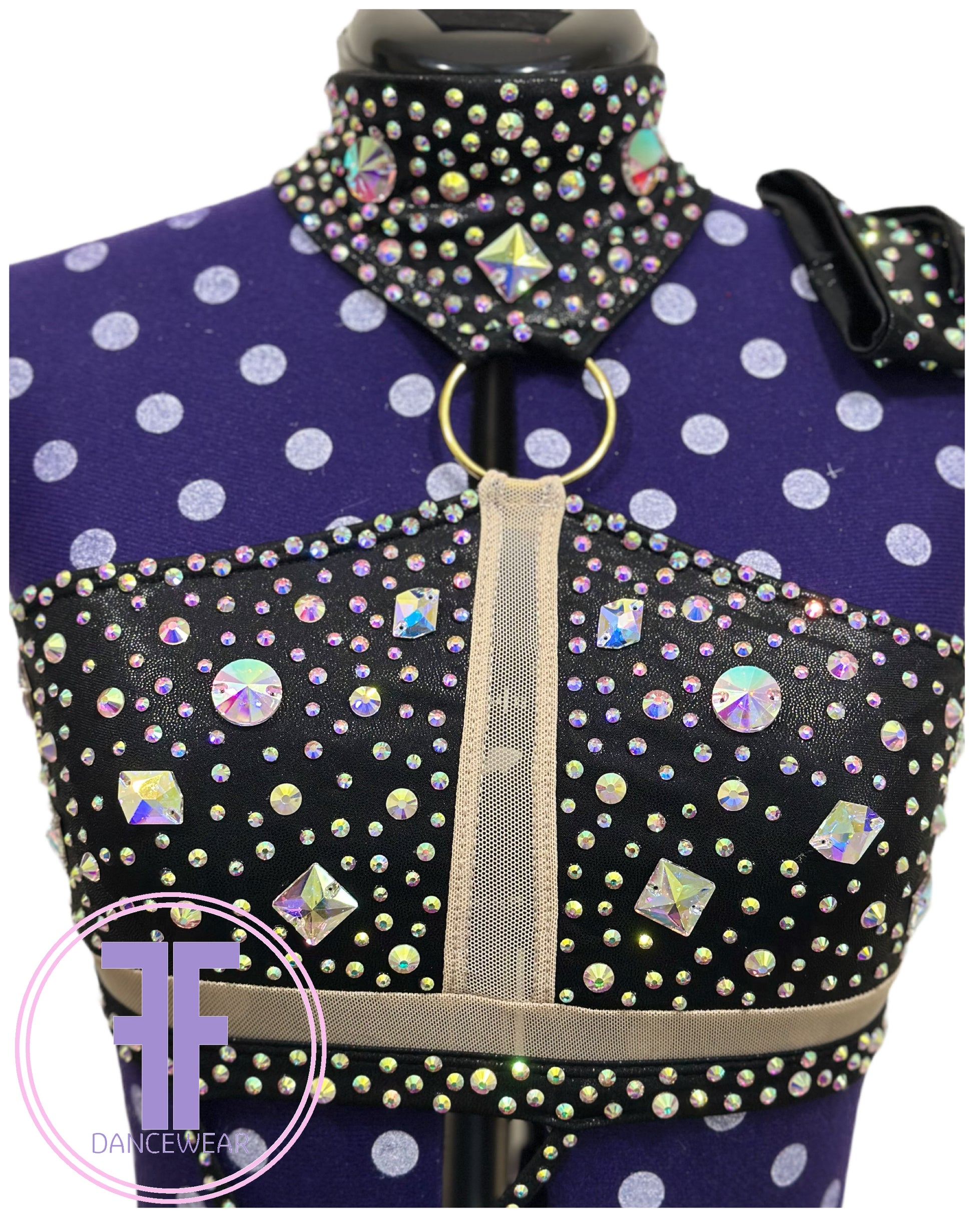 Black Mystique Metallic Lycra with nude Powermesh panels crop top and pants attached by straps with gold hoop at waist and below neckline (Lycra is fully lined).