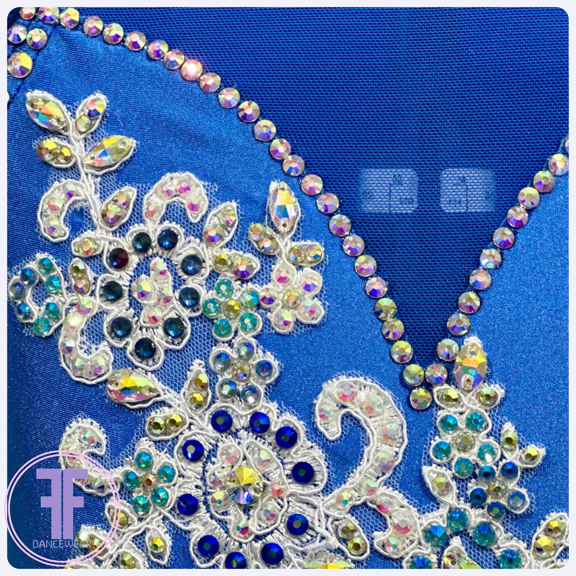 Decorated with white floral appliqué and superior quality crystals in AB, transparent AB, Blue Volcano, Sapphire AB and Aquamarine AB. Come with matching stoned hair piece.