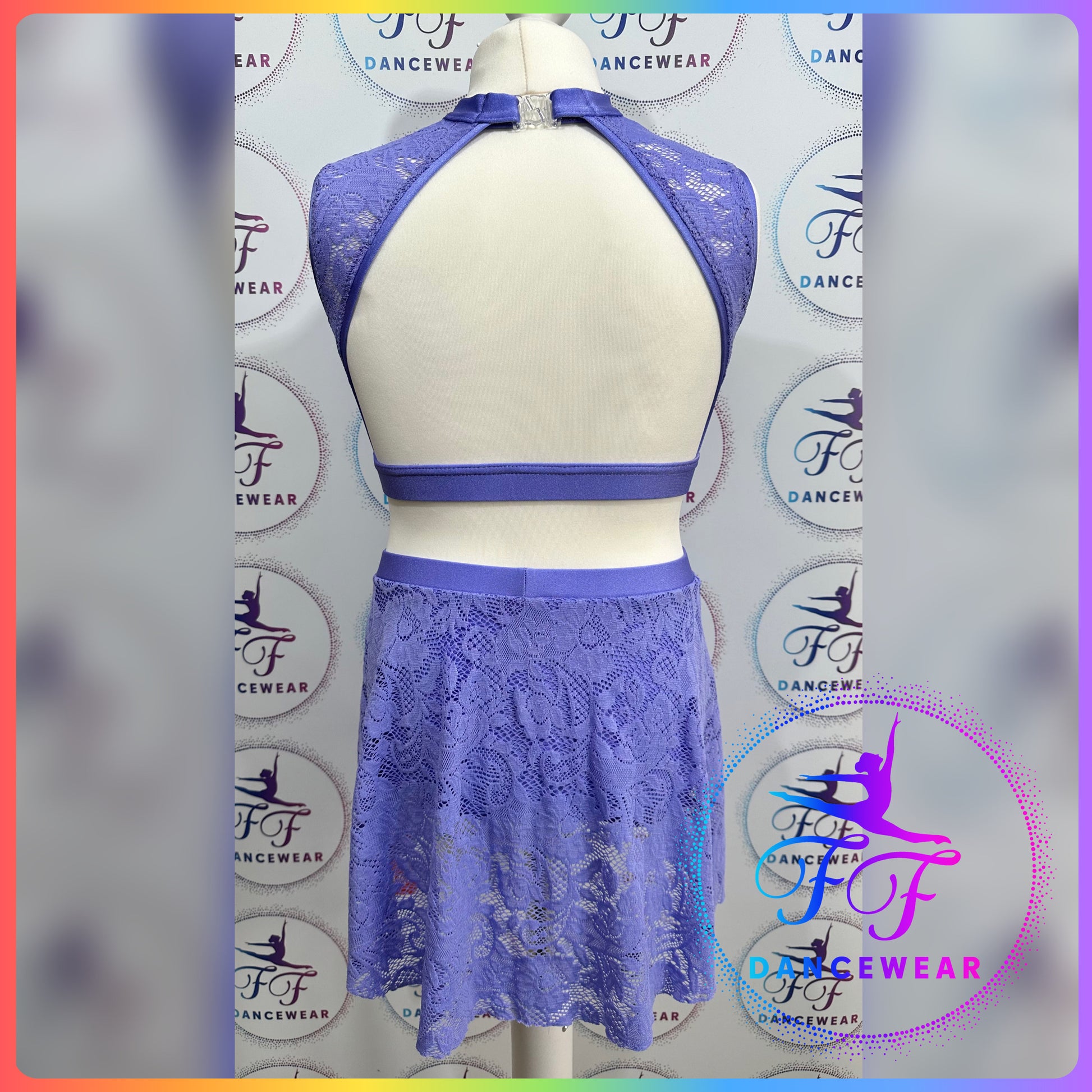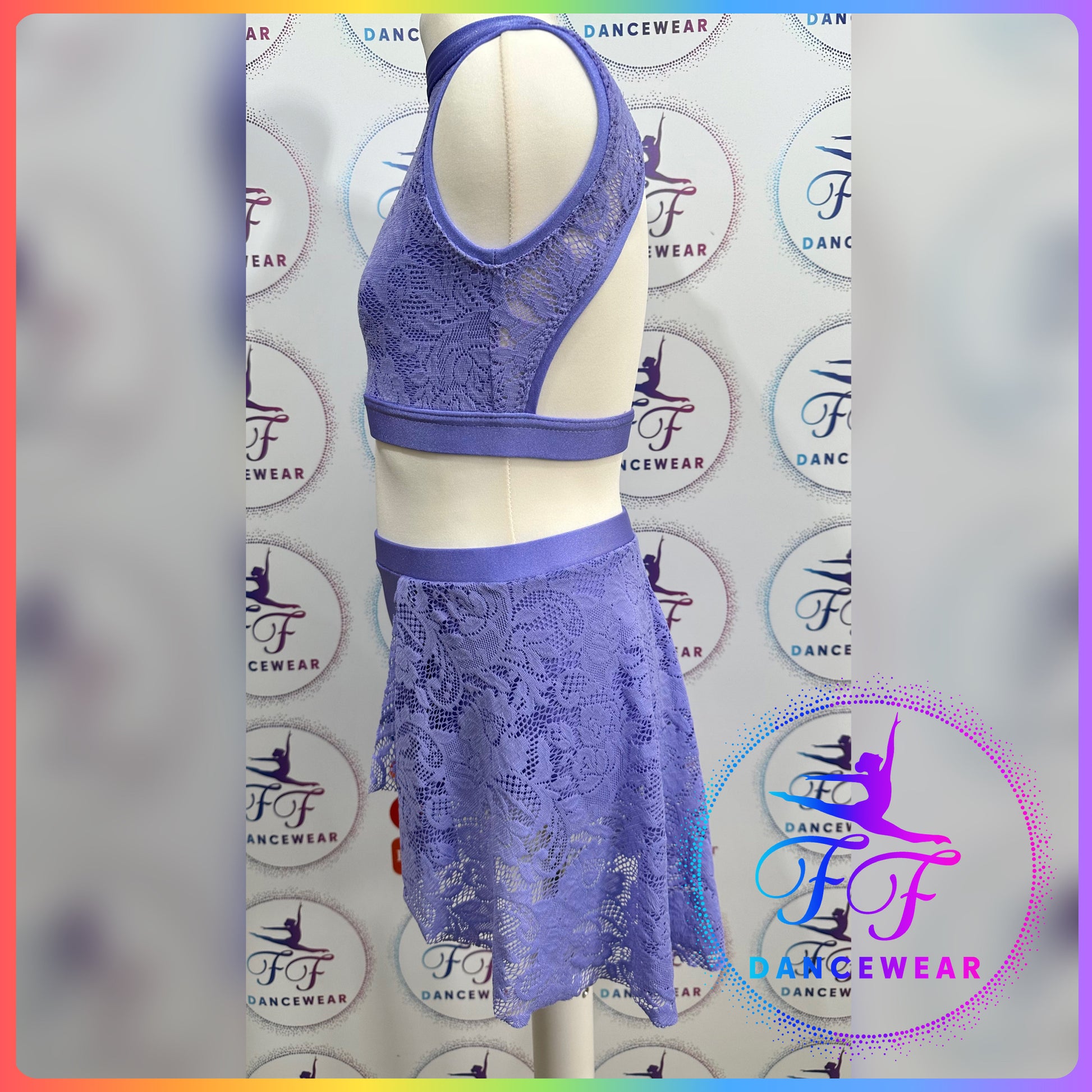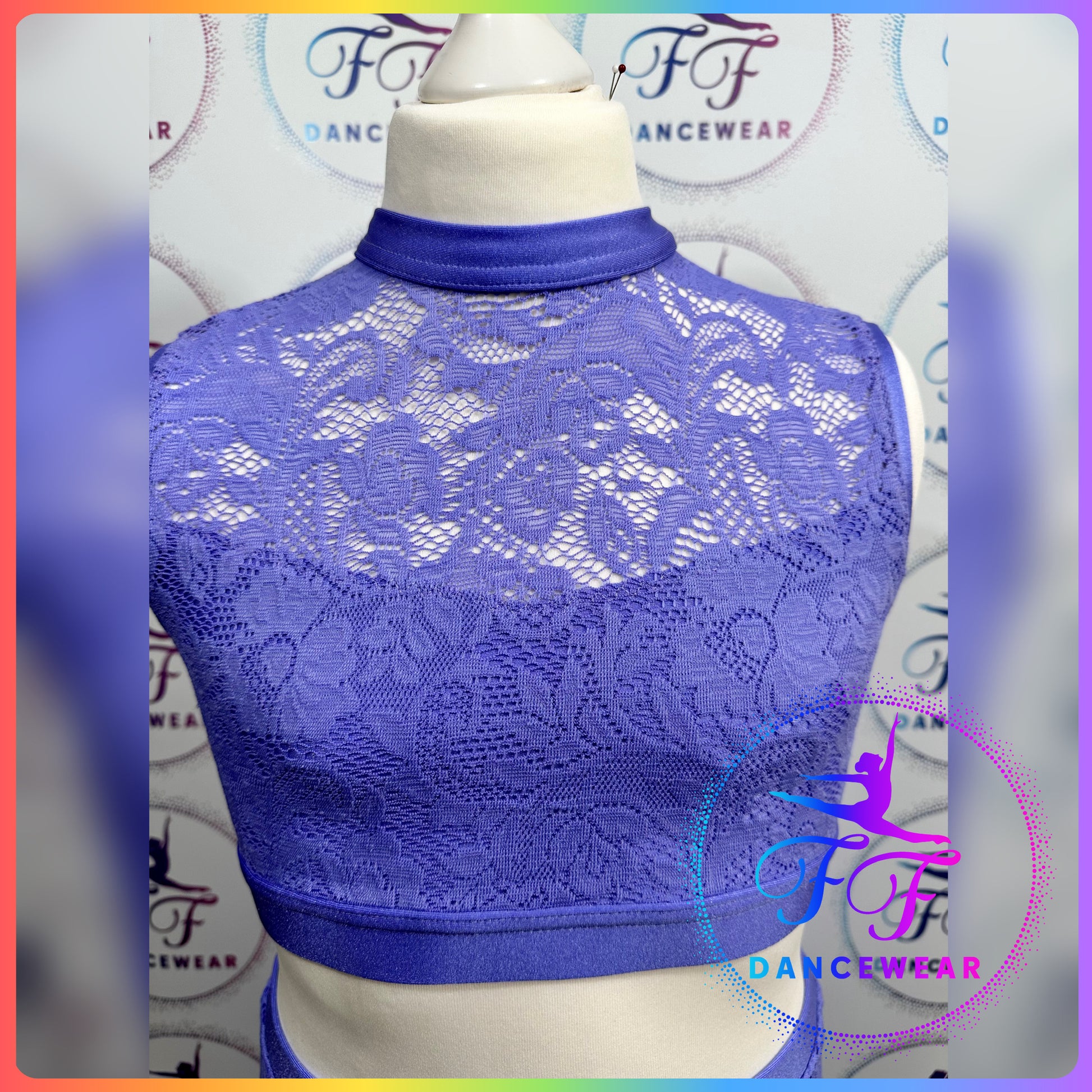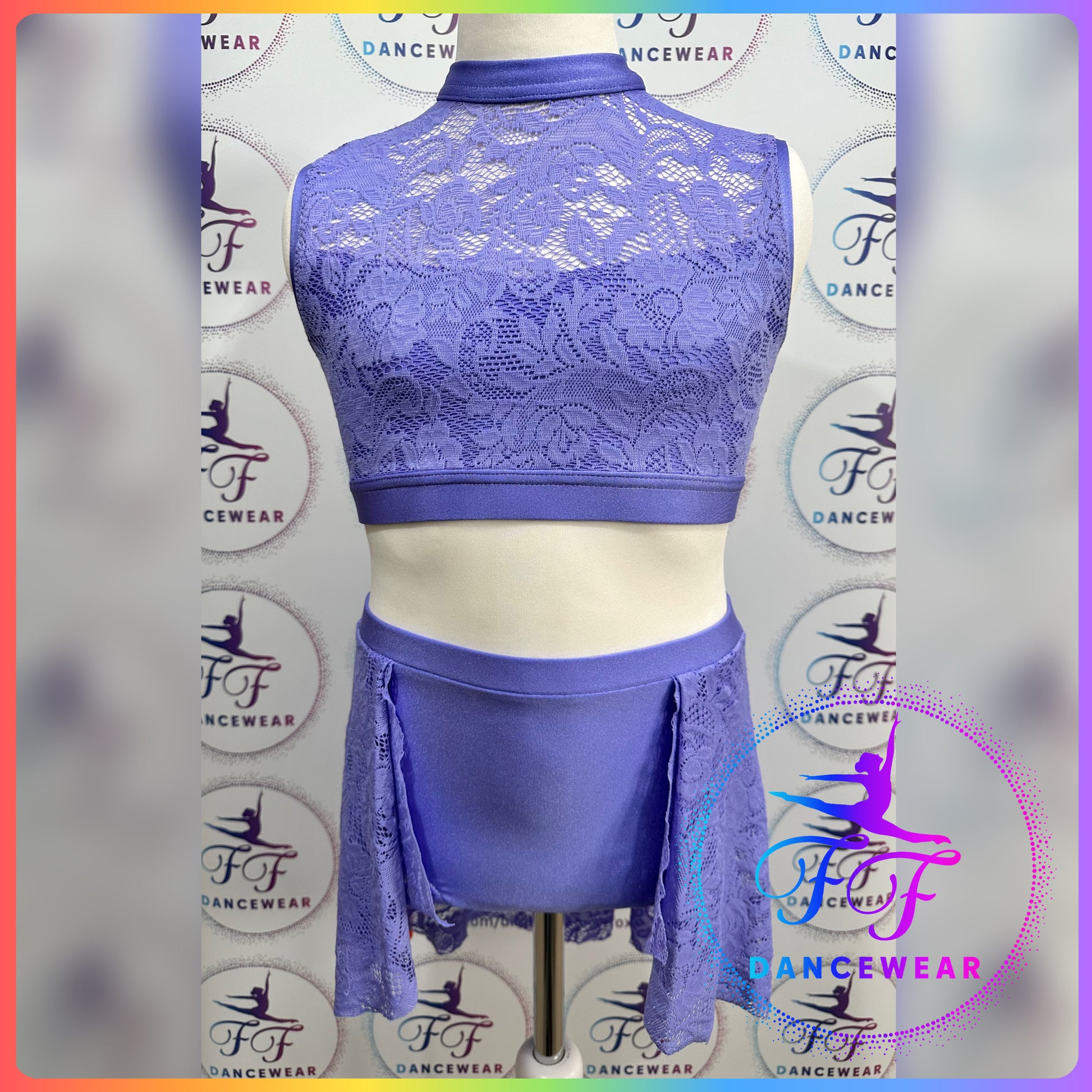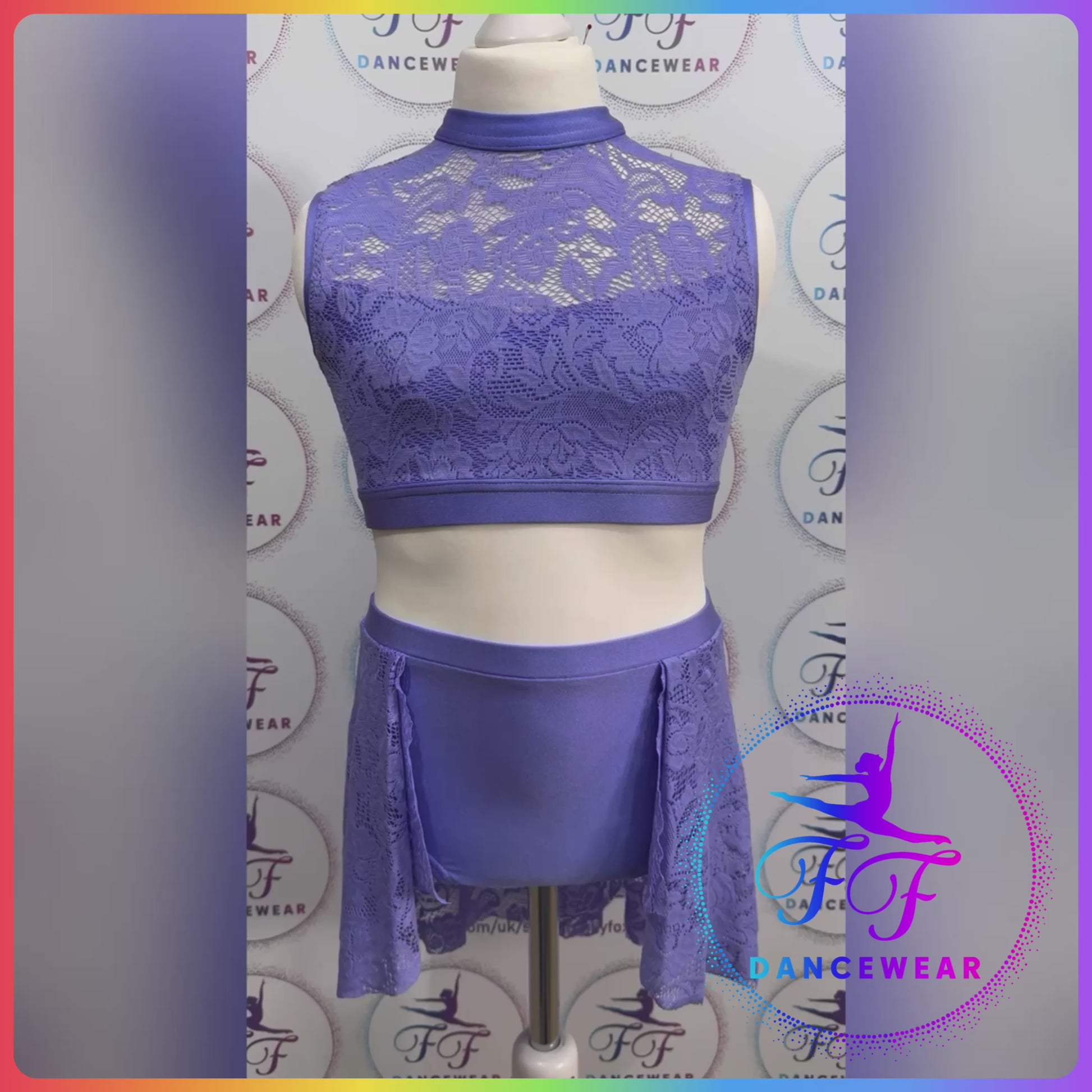 Lilac Lycra and matching stretch lace open back crop top. High waist pants with attached stretch lace half skirt.