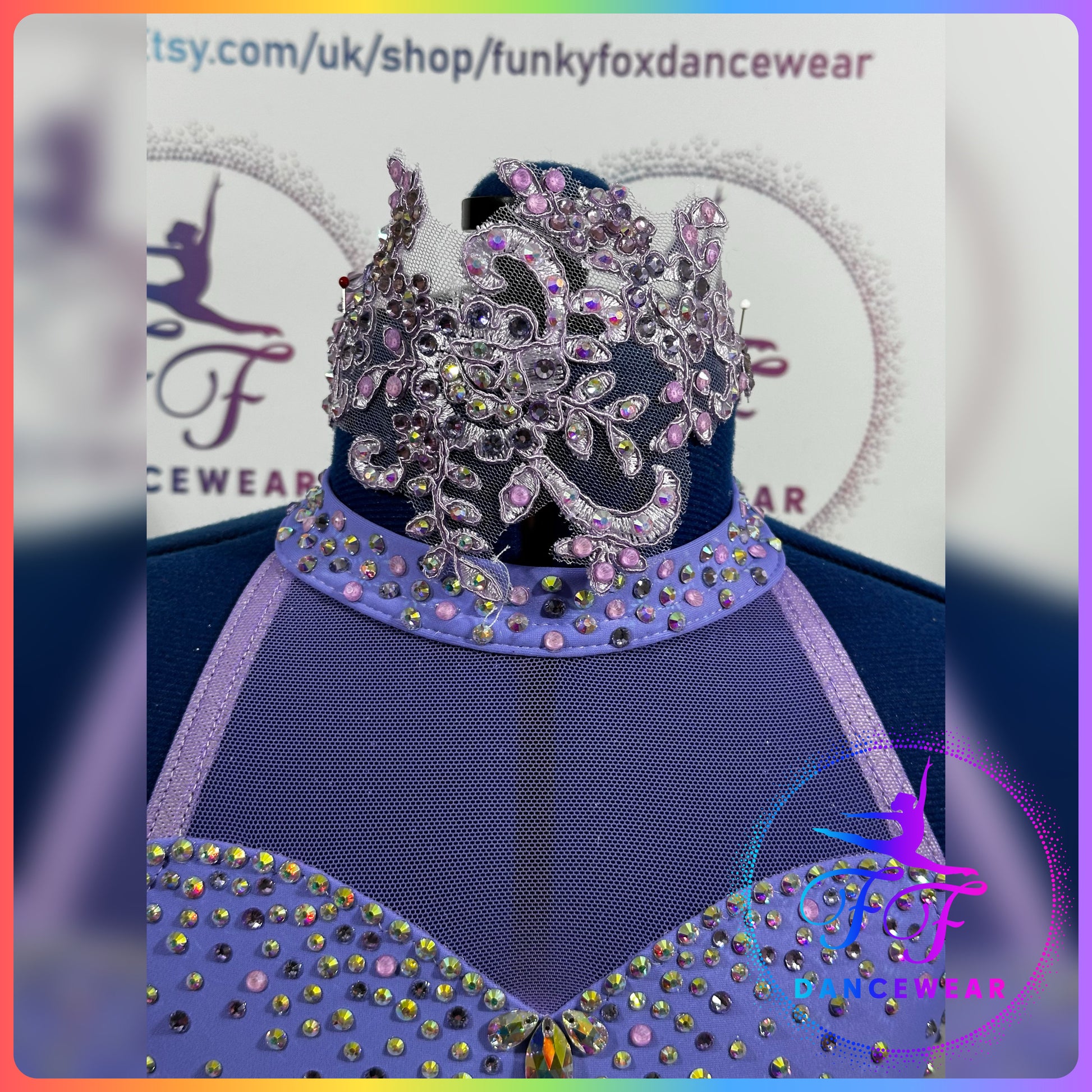 Lilac Matt Lycra halter style, mesh panel leotard with sweetheart bodice, attached skirt in matching mesh.
