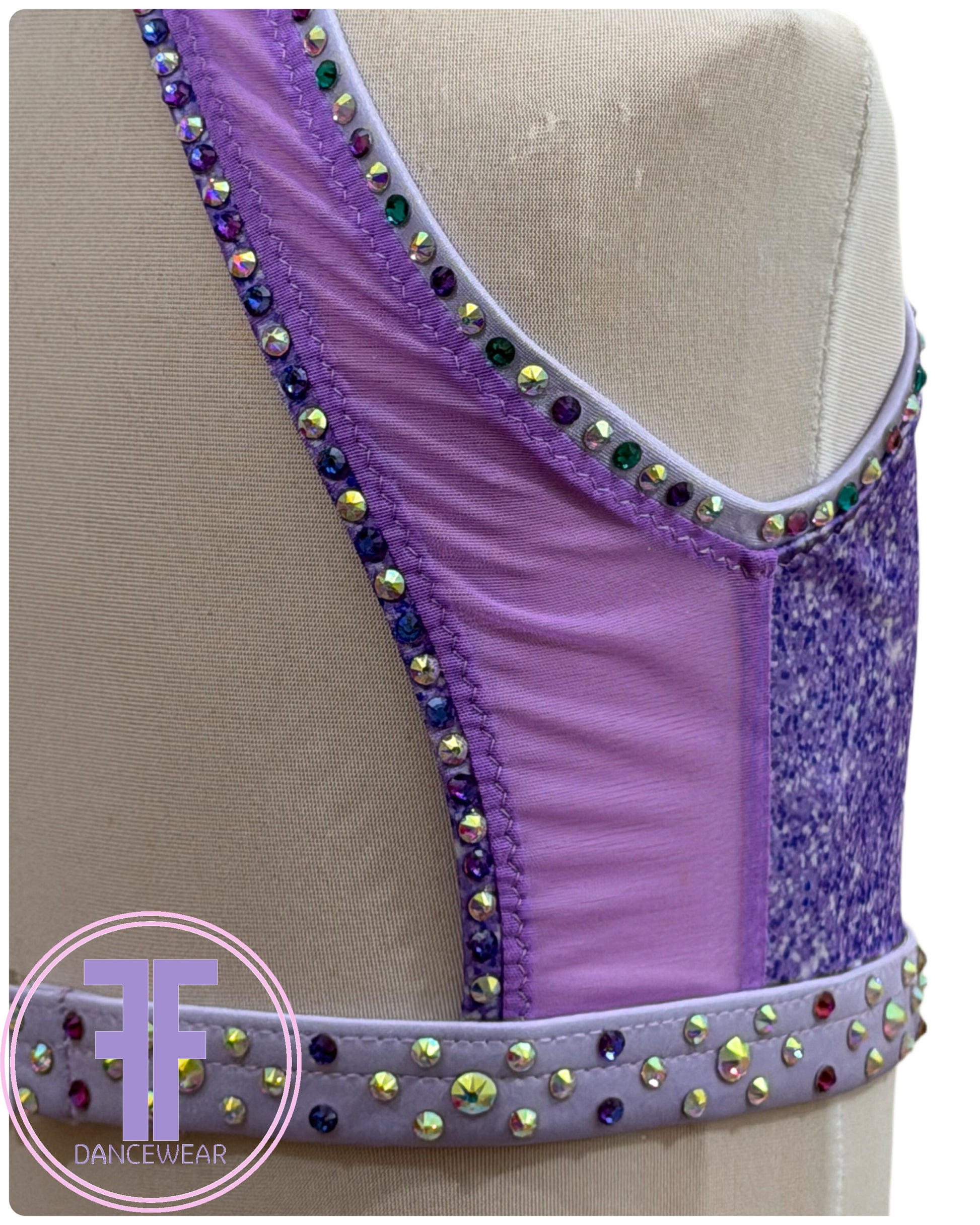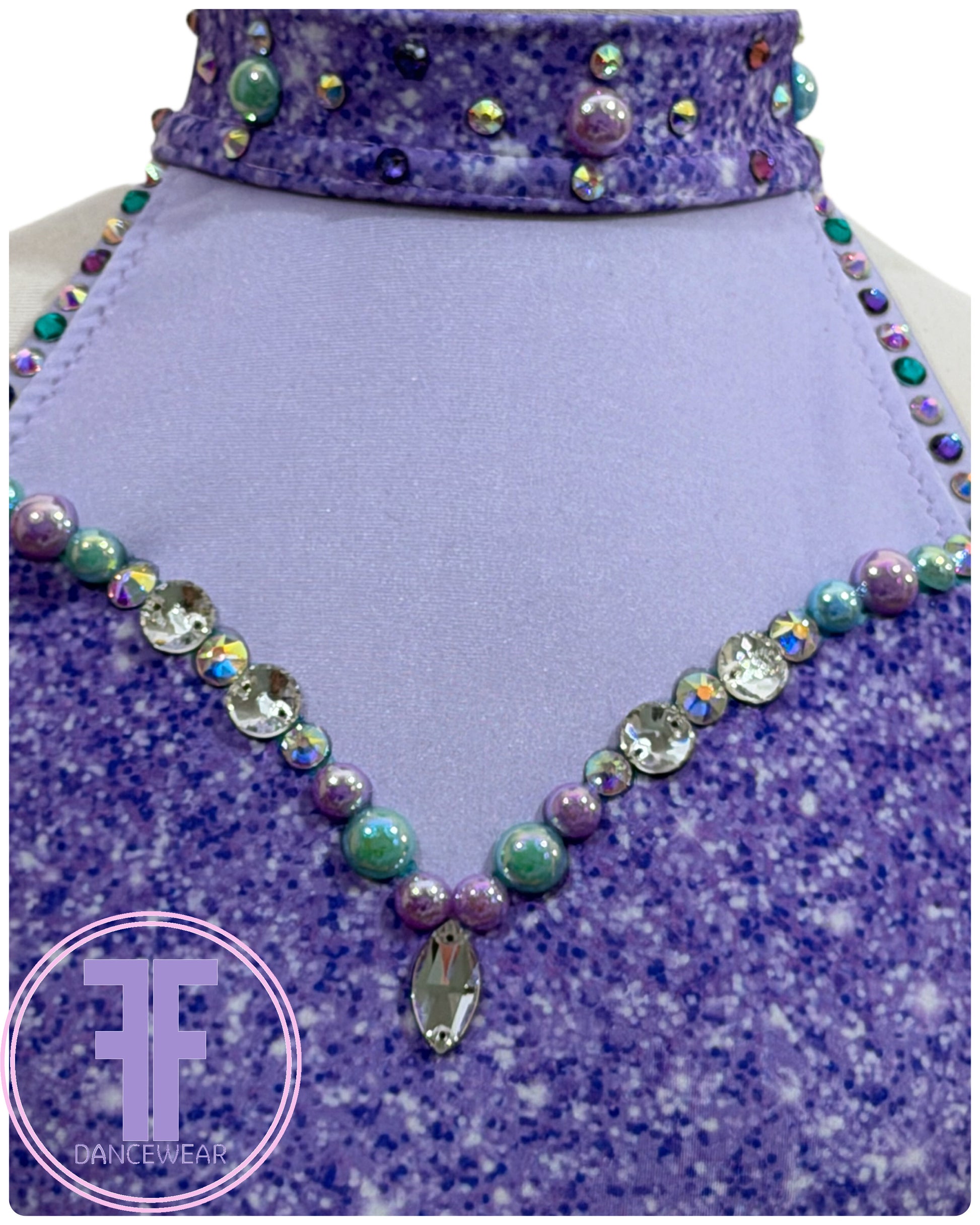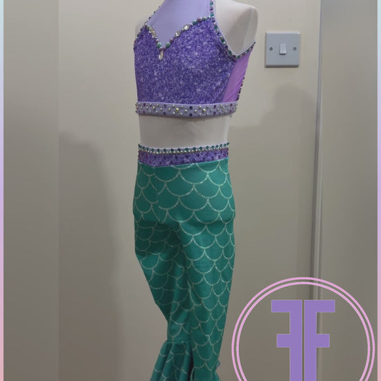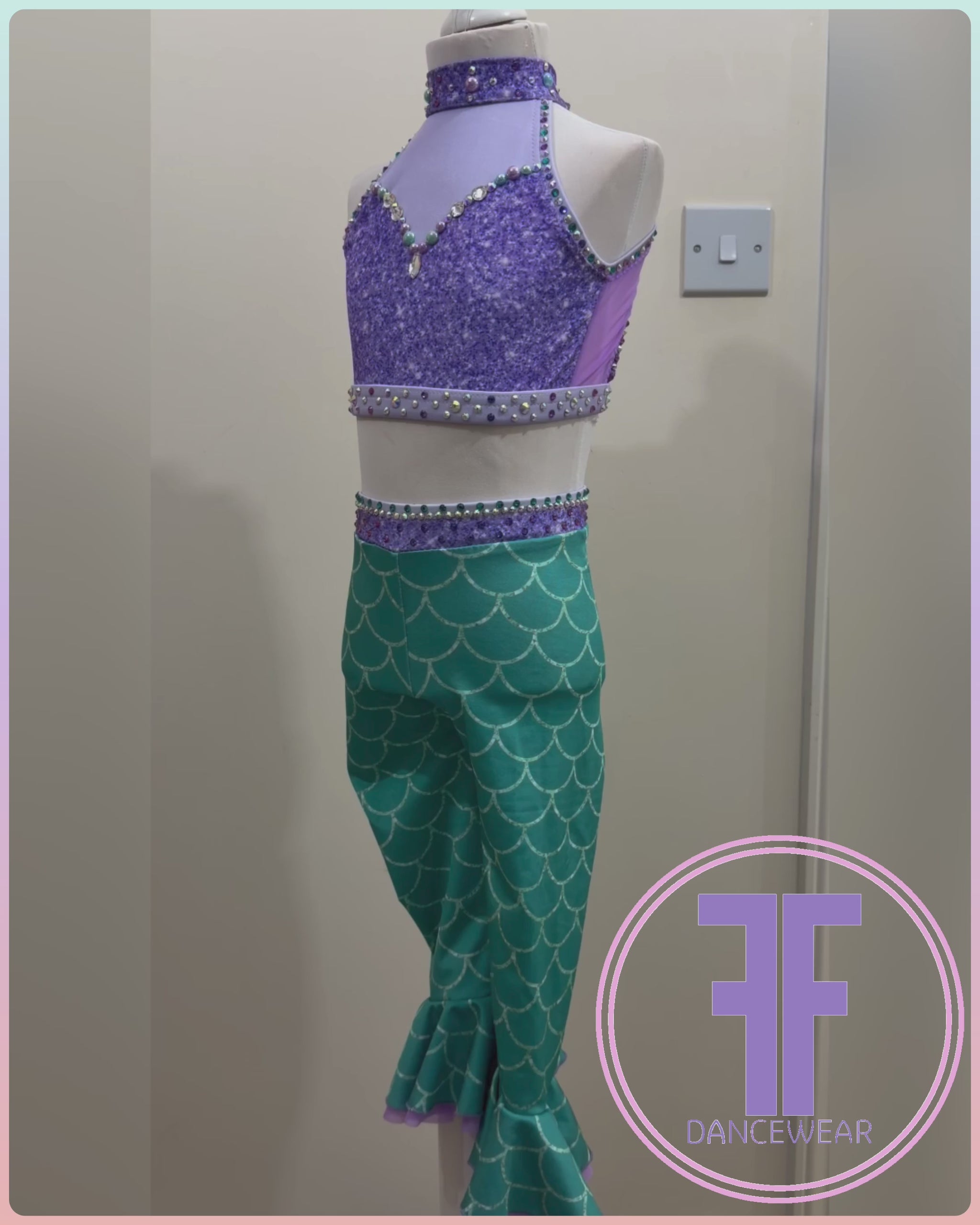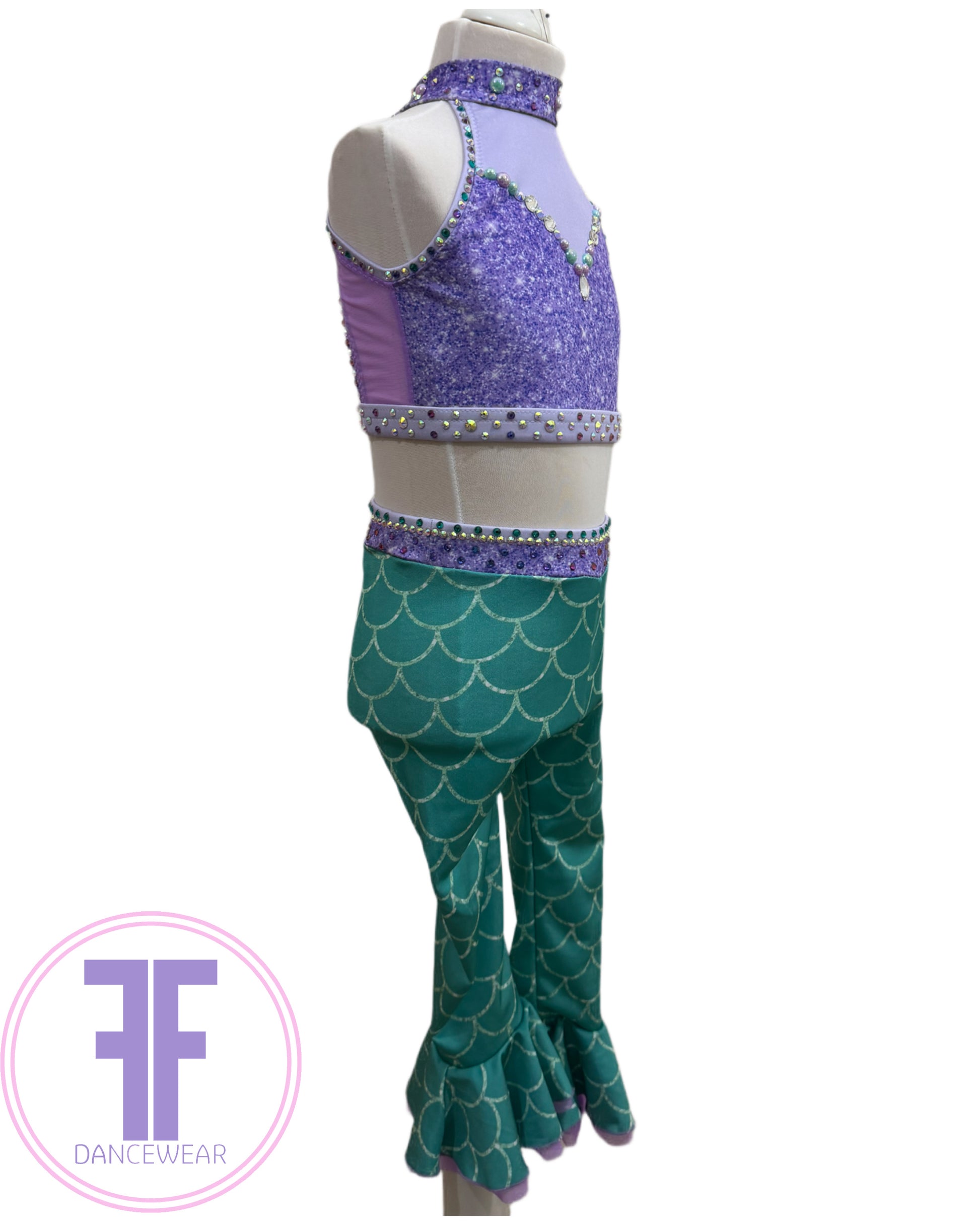 Get your little one ready to make a splash with our Bespoke Mermaid Inspired Dance Costume! The two-piece stoned modern/acro/tap outfit features opulent purple Lycra and matching Jade mermaid scale print leggings with flared bottoms. The open back crop top adds a touch of glam, decorated with half pearls and sparkling AB, Green Zircon, and Purple Velvet crystals. Plus, a hair bow included for extra charm!
