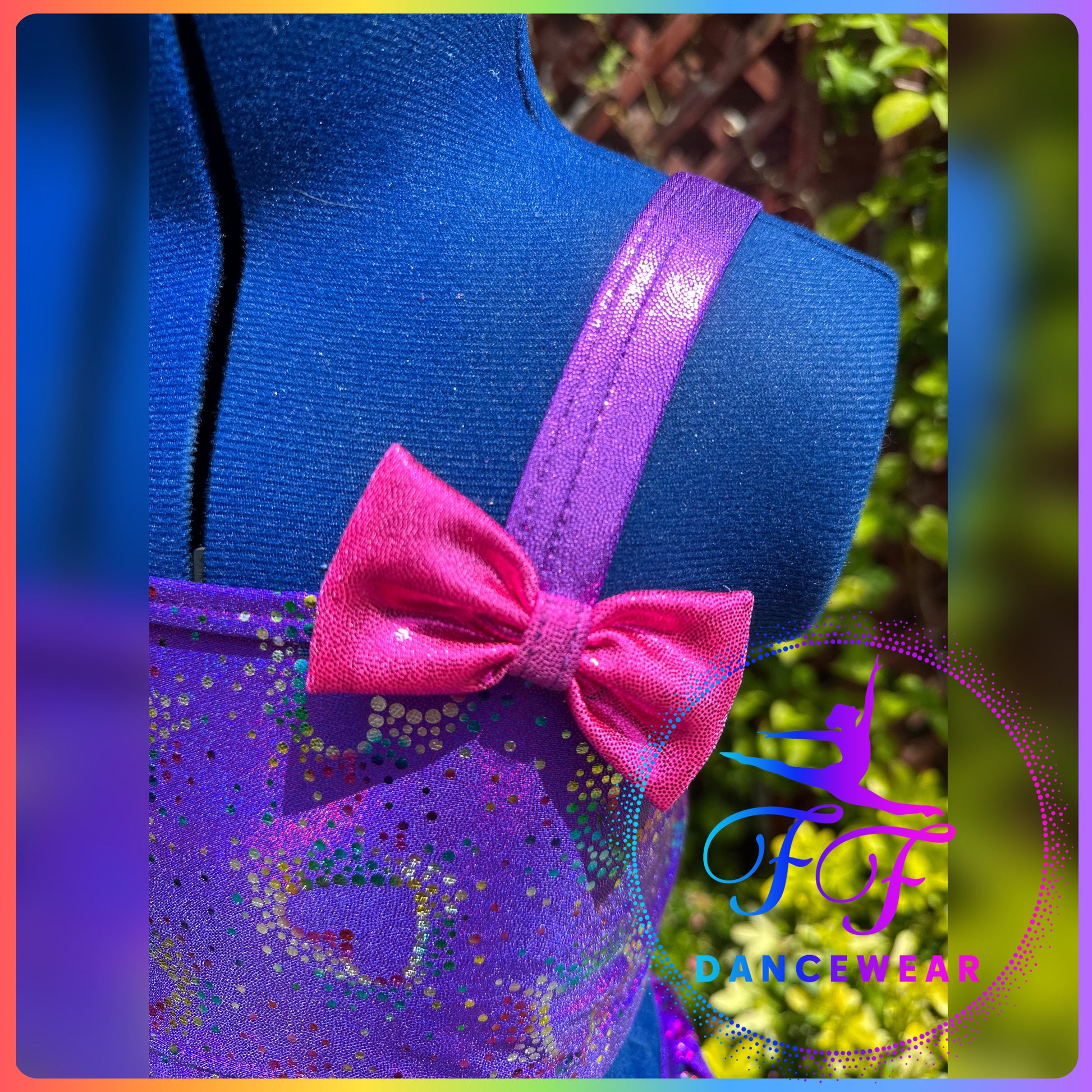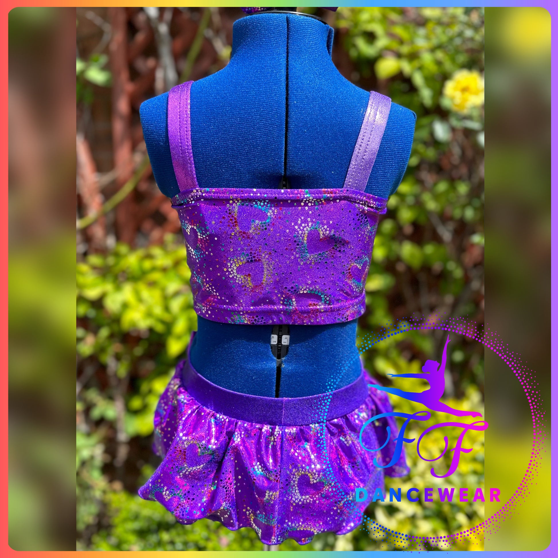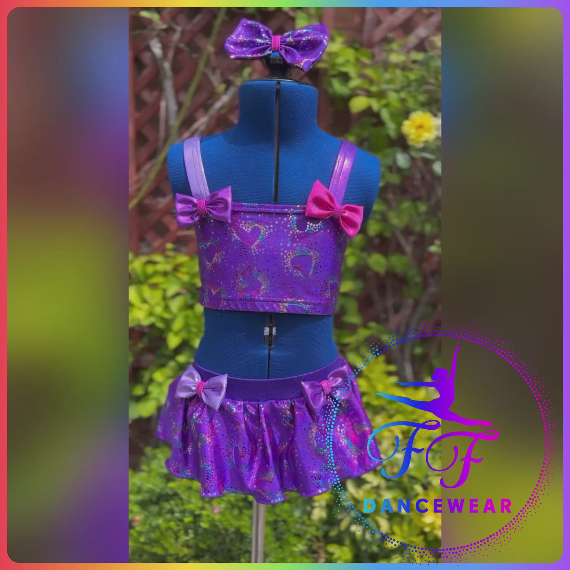 Mystique Metallic Purple and Rainbow Foil Hearts Lycra crop top with mini bow detail. Short ruffle skirted pants with attached mini bows (pants in dark purple and cerise mystique metallic Lycra). Comes with matching hair bow.