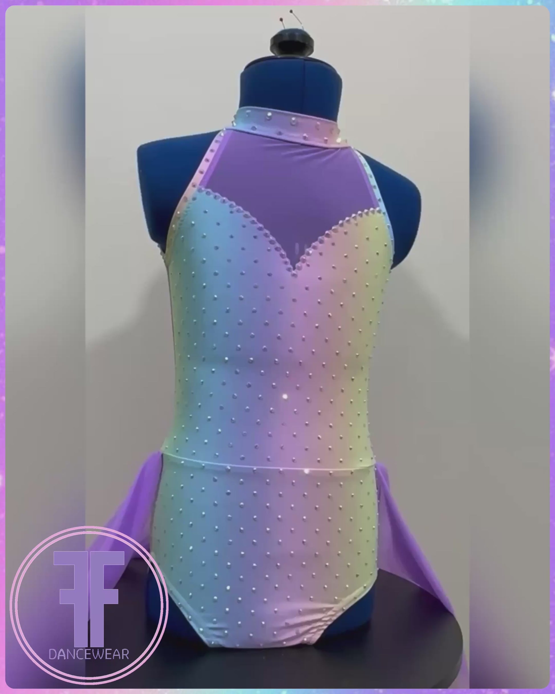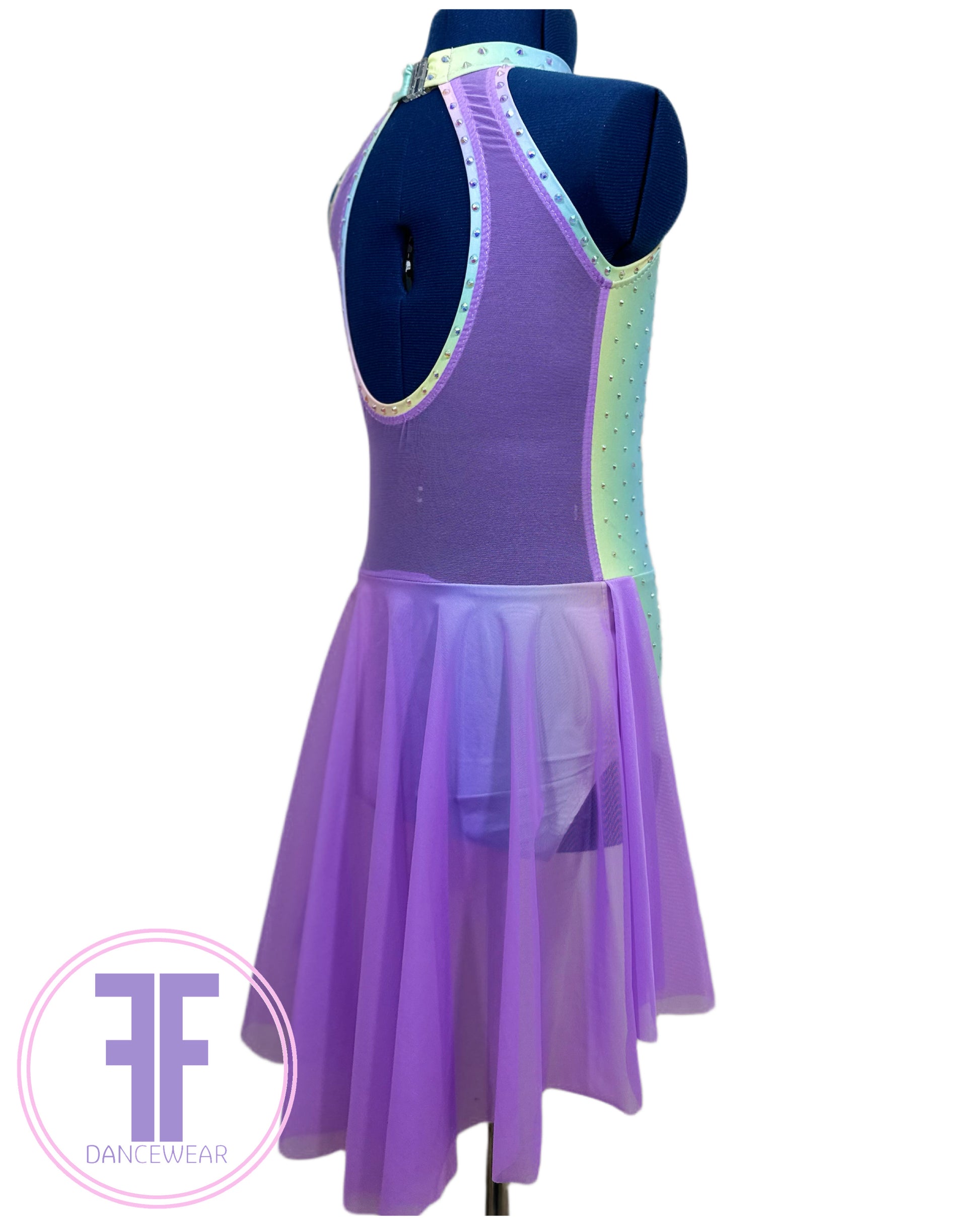 Pastel Rainbow print Lycra and Violet Powermesh sweetheart design leotard with keyhole back and Violet Powermesh half skirt.