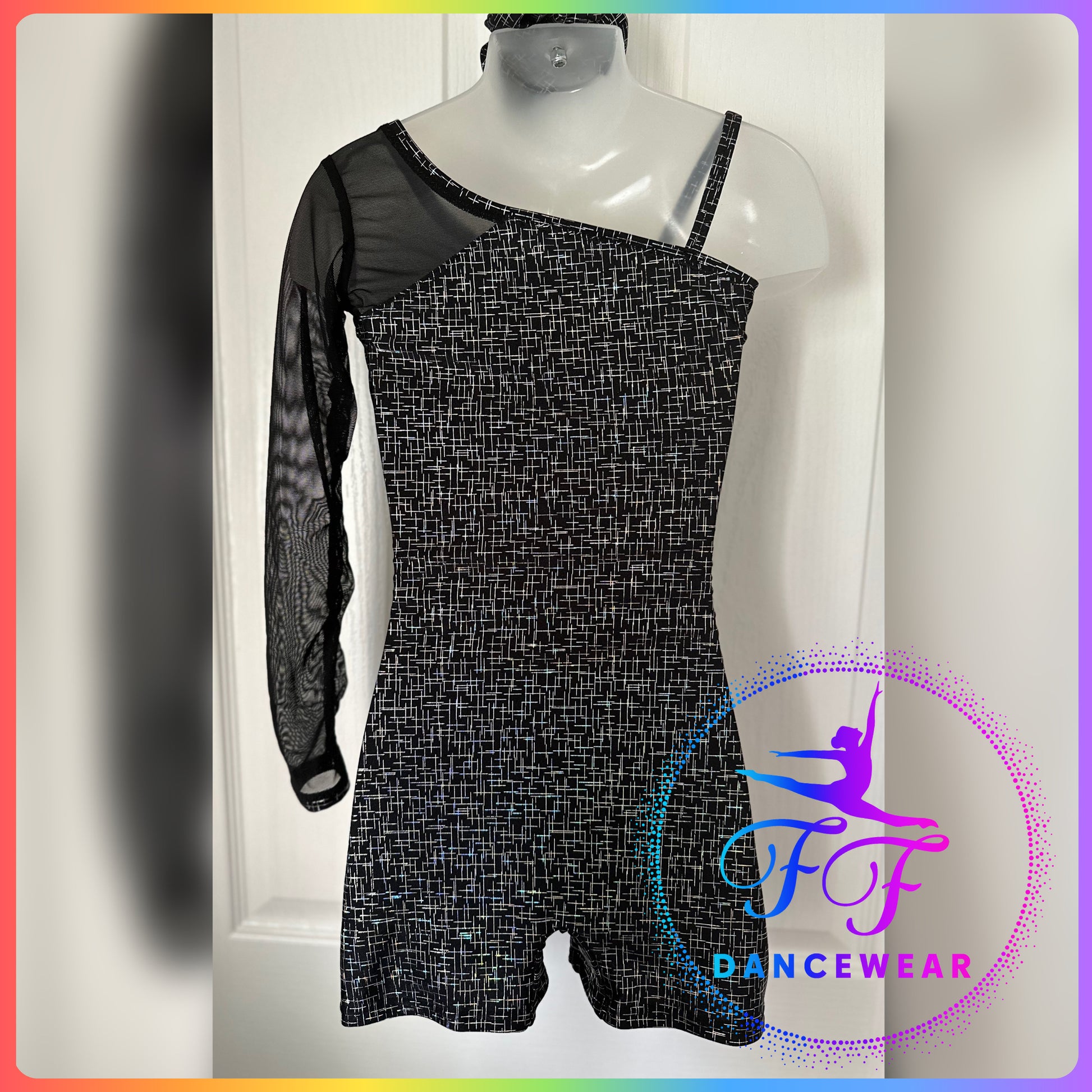 Black and Silver holographic Lycra short leg unitard, asymmetrical neckline with one long sleeve in black stretch mesh.