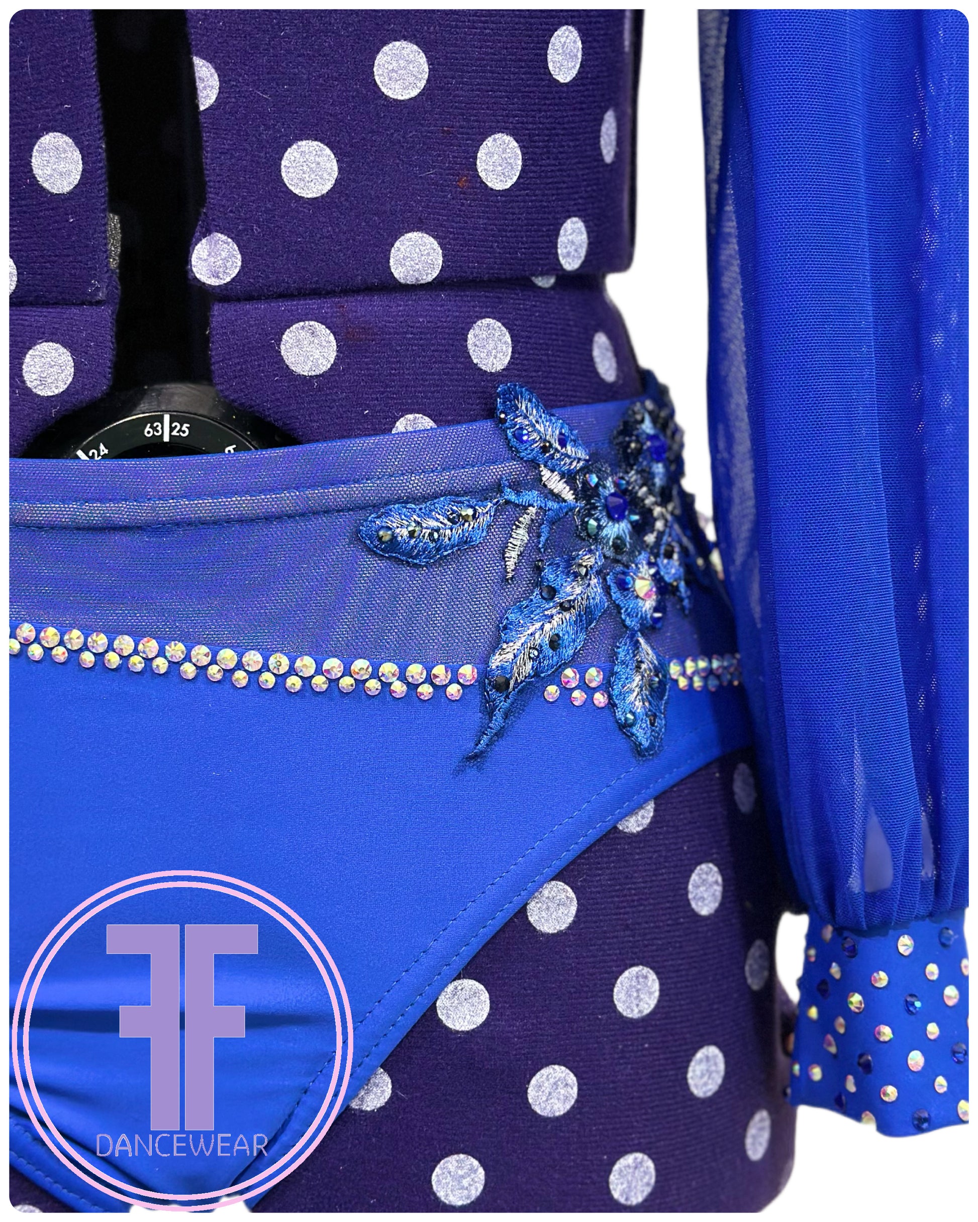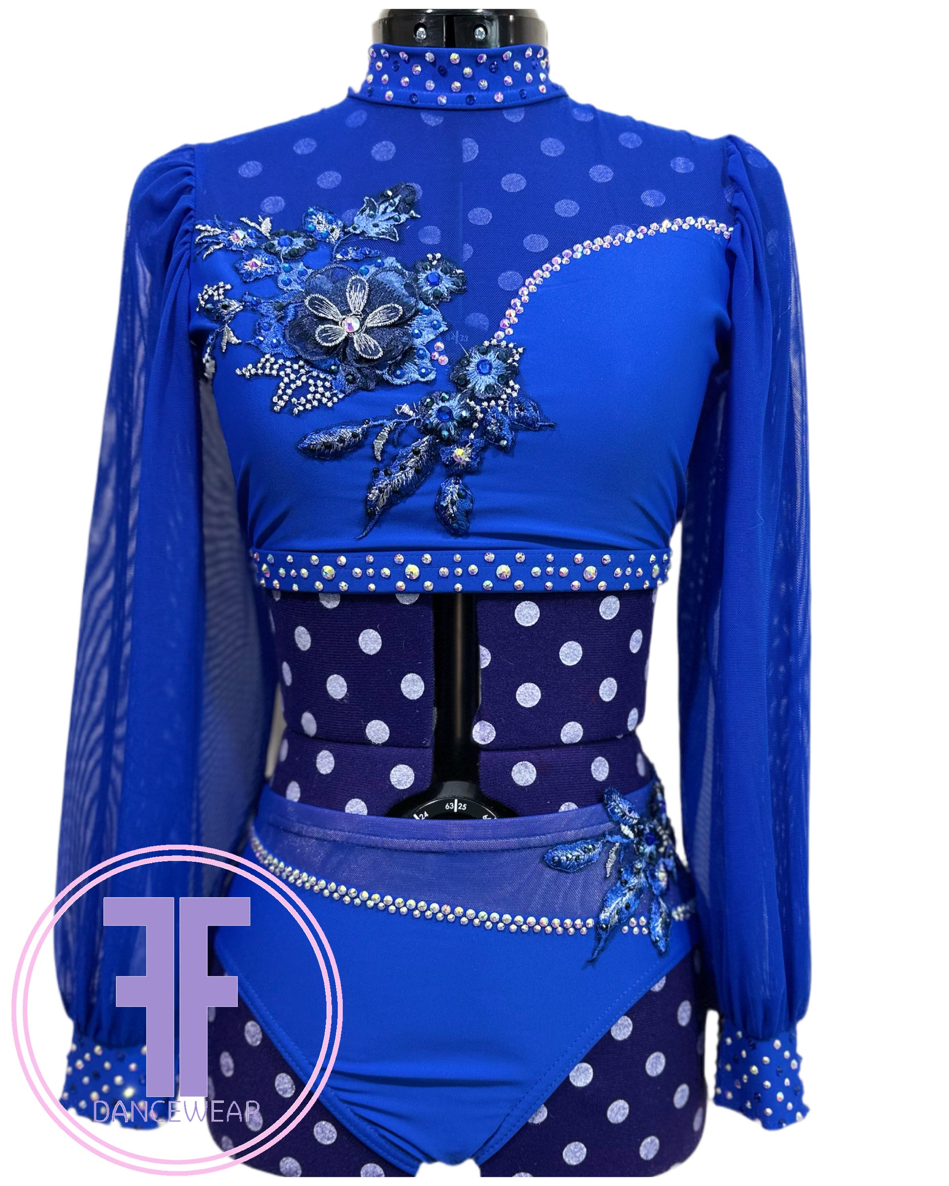 Royal Blue Matt Lycra and Powermesh open back crop top with oversize sleeves and matching pants (Lycra and the mesh on pants are fully lined).