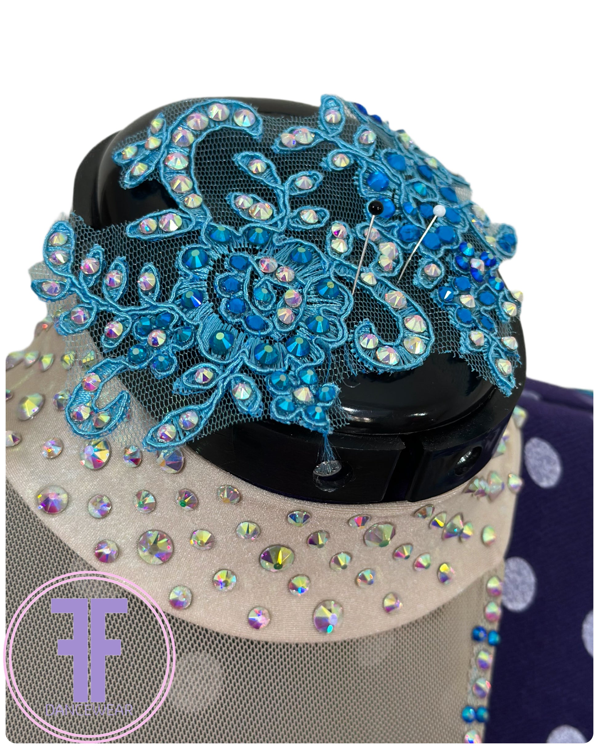 Adorned with intricate floral appliqués and premium crystals in AB, Sapphire, Sapphire AB, Light Sapphire, Capri Blue, and Peacock AB finishes, every detail catches the light beautifully. The included coordinating stoned hair piece completes the look.