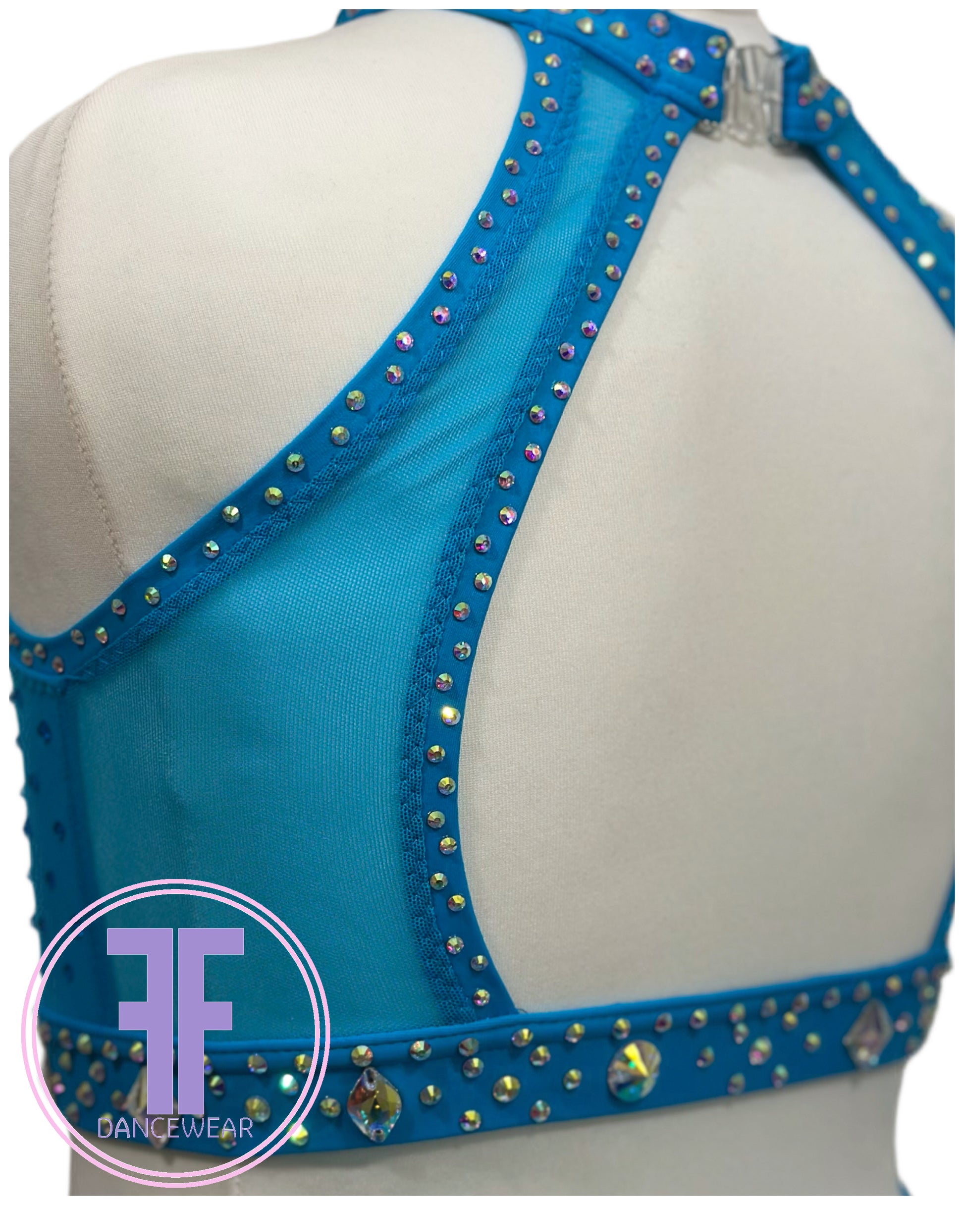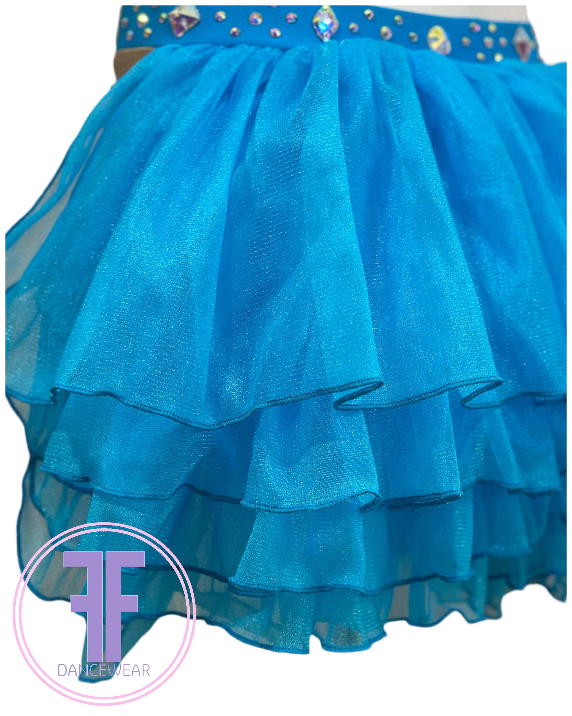 Turquoise Matt lycra and Powermesh sweetheart design crop top and matching pants with nude side panels and back skirt of 5 layers of shimmer stretch net.
