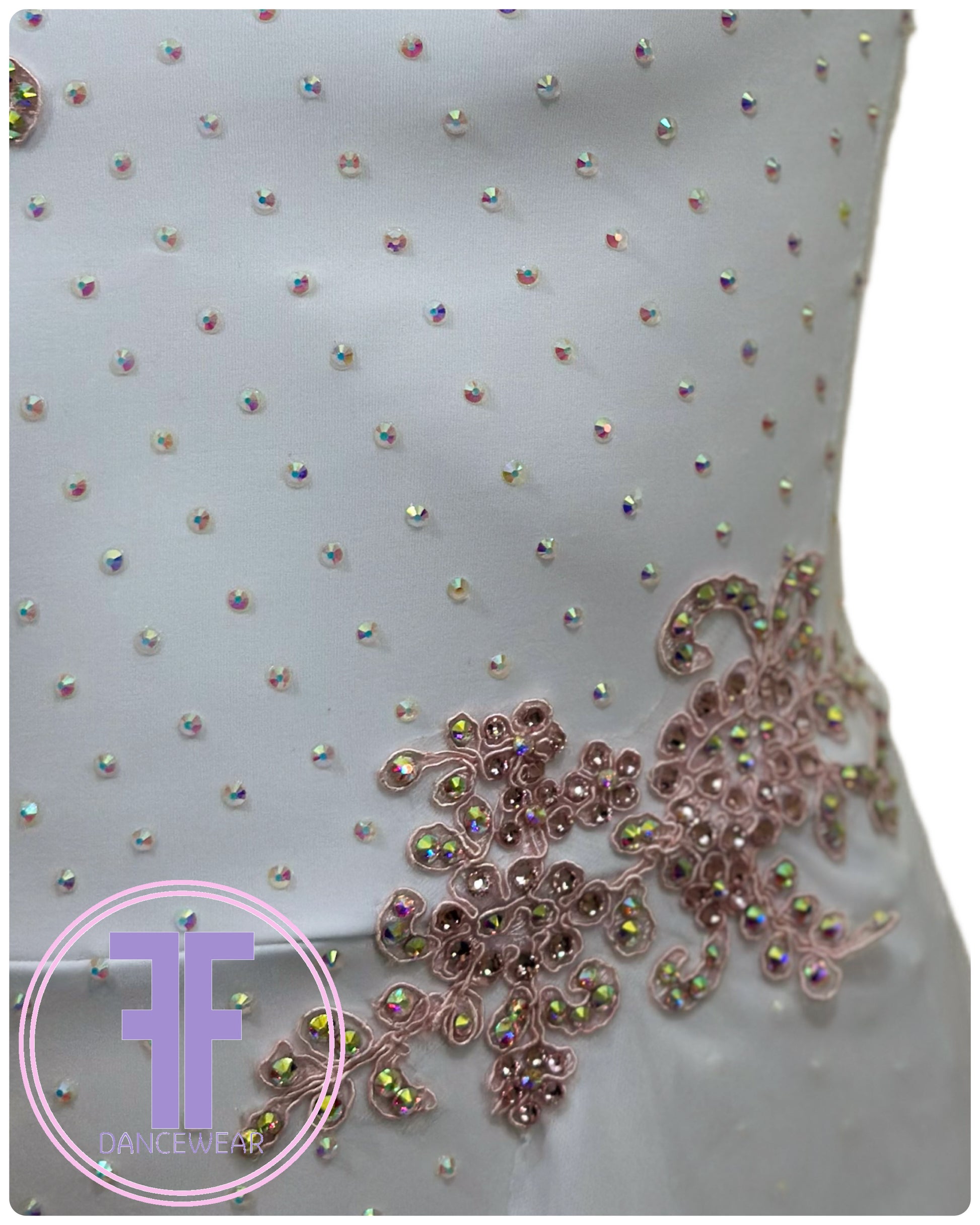 White Matt Lycra and matching Powermesh cut sweetheart bustline leotard with Powermesh half skirt.