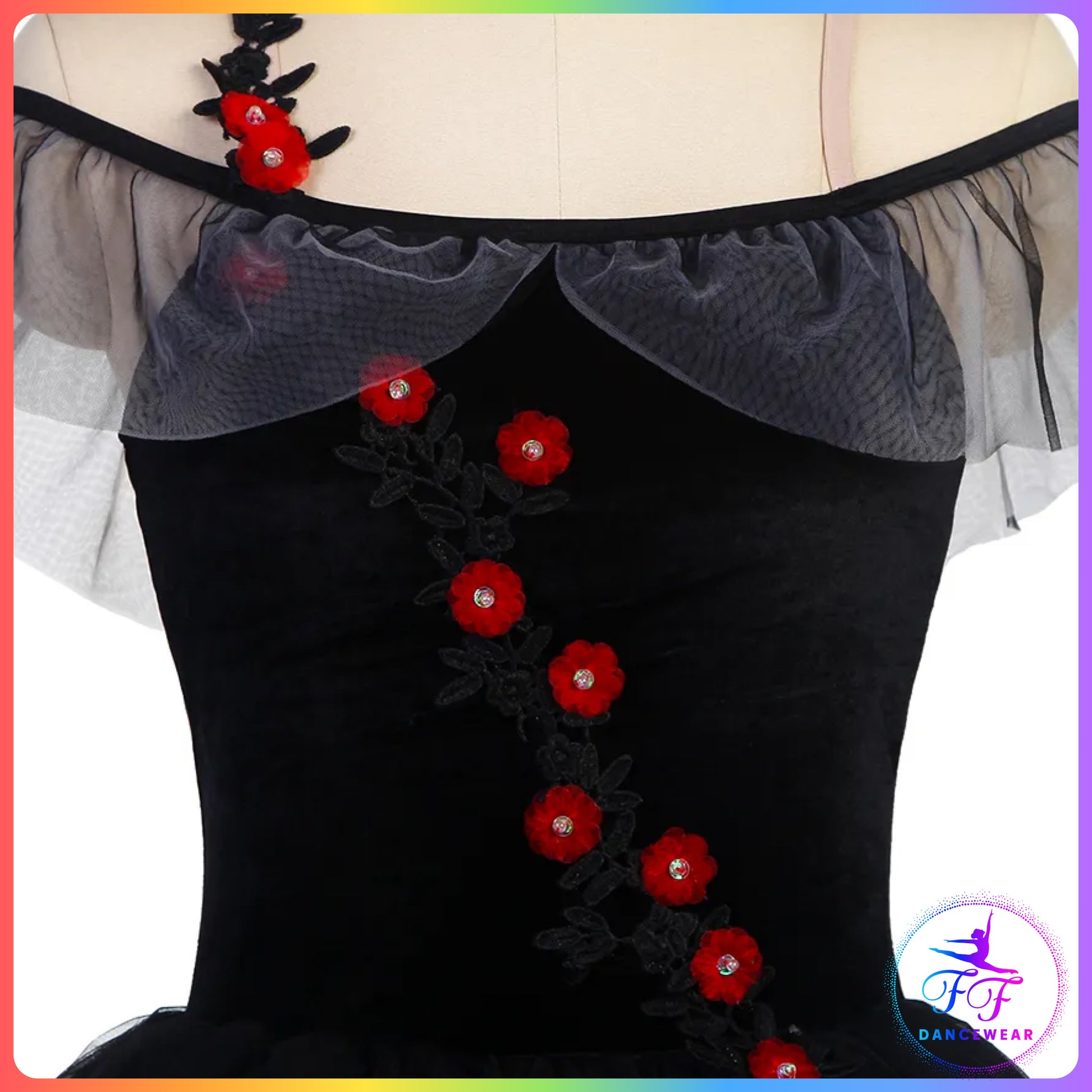 Black stretch velvet off the shoulder bodice with red flowers, and attached layers of soft tulle romantic tutu skirt.