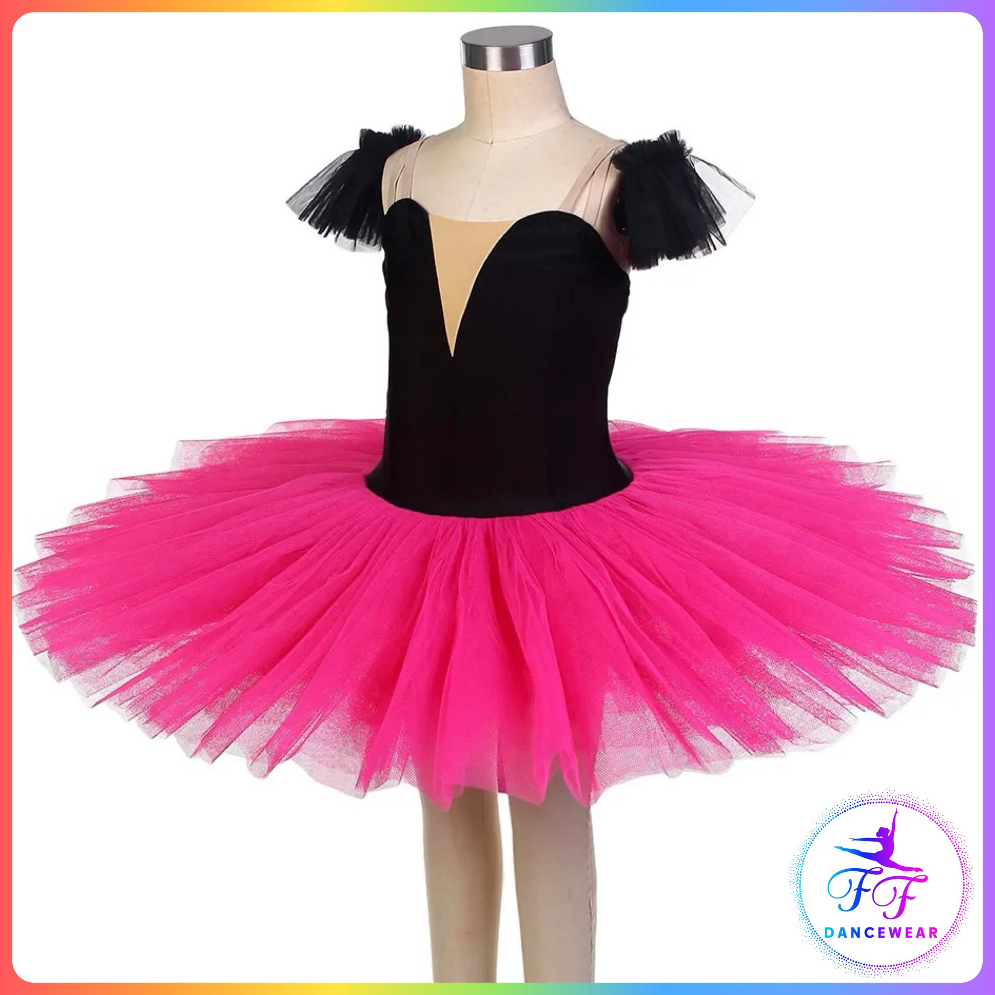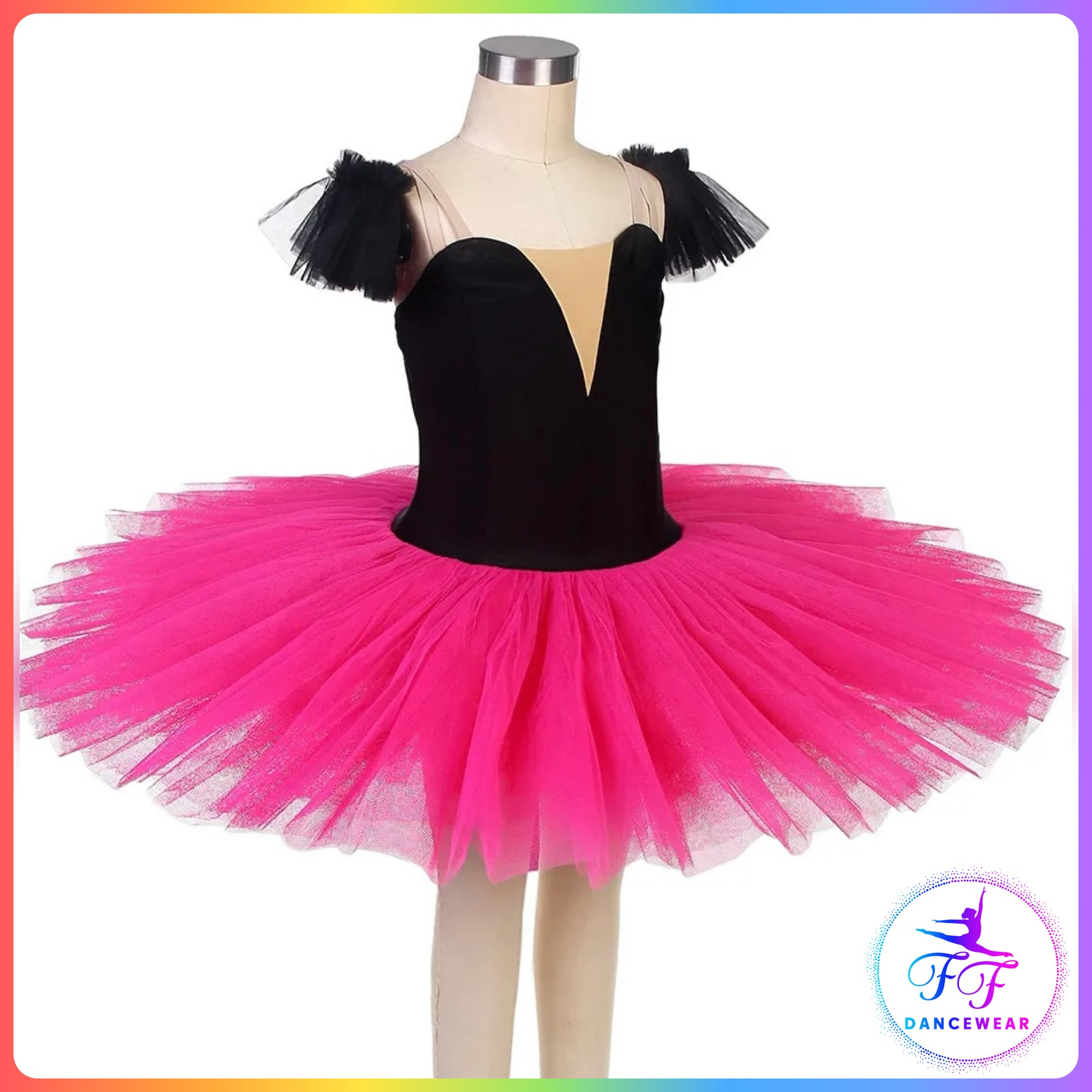 Stretch Black Velvet bodice with nude 'v' insert and pink pleated net.