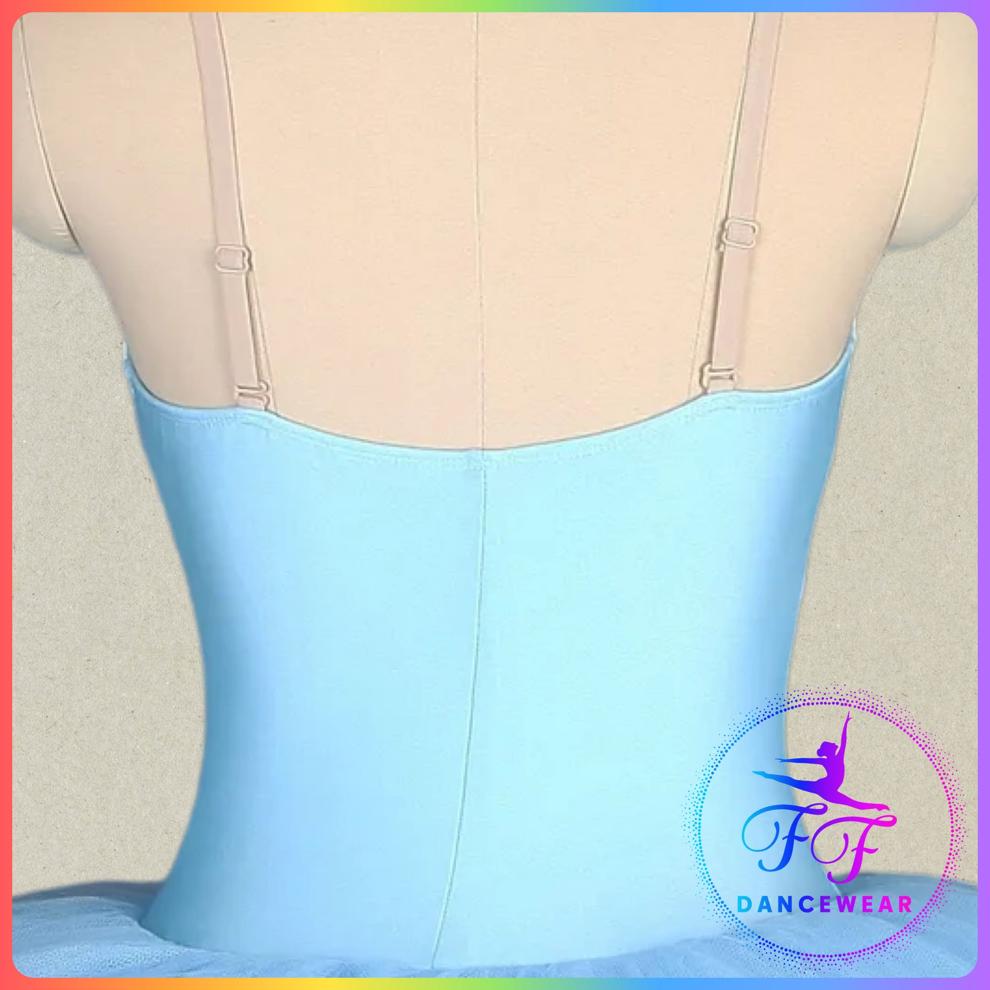 Stretch bodice with floral trim and nude ‘v’ panel, graduated layers of pleated ballet net to create a stunning pancake tutu with decorated top plate.
