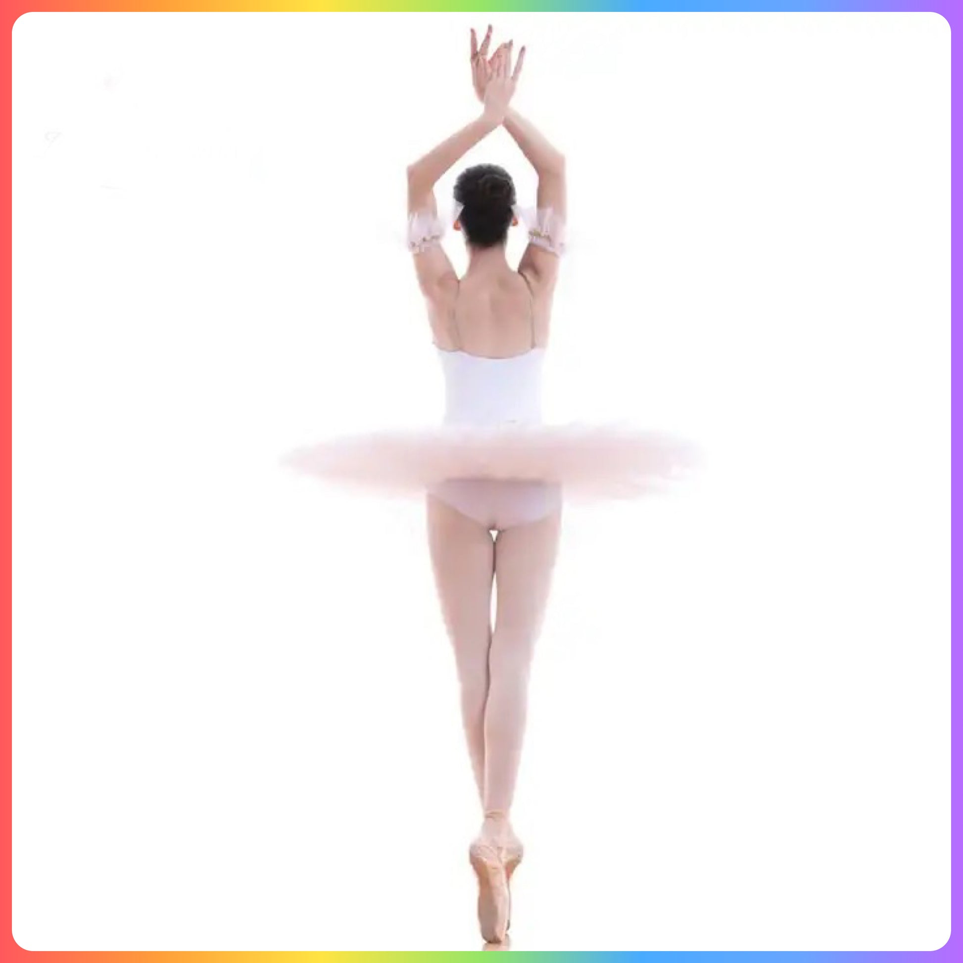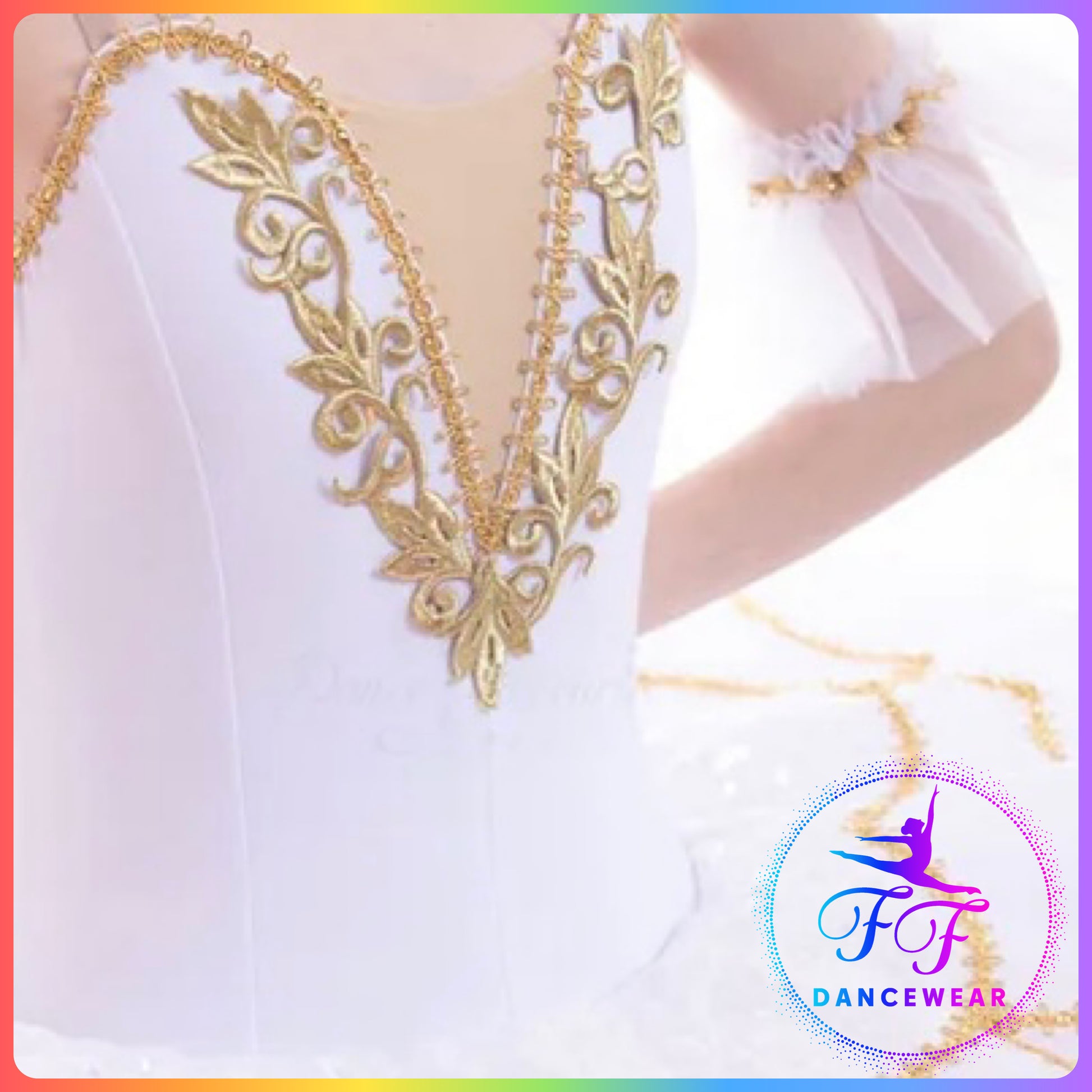 Stretch bodice with gold trim and nude ‘v’ panel, graduated layers of pleated ballet net to create a stunning pancake tutu with decorated top plate.