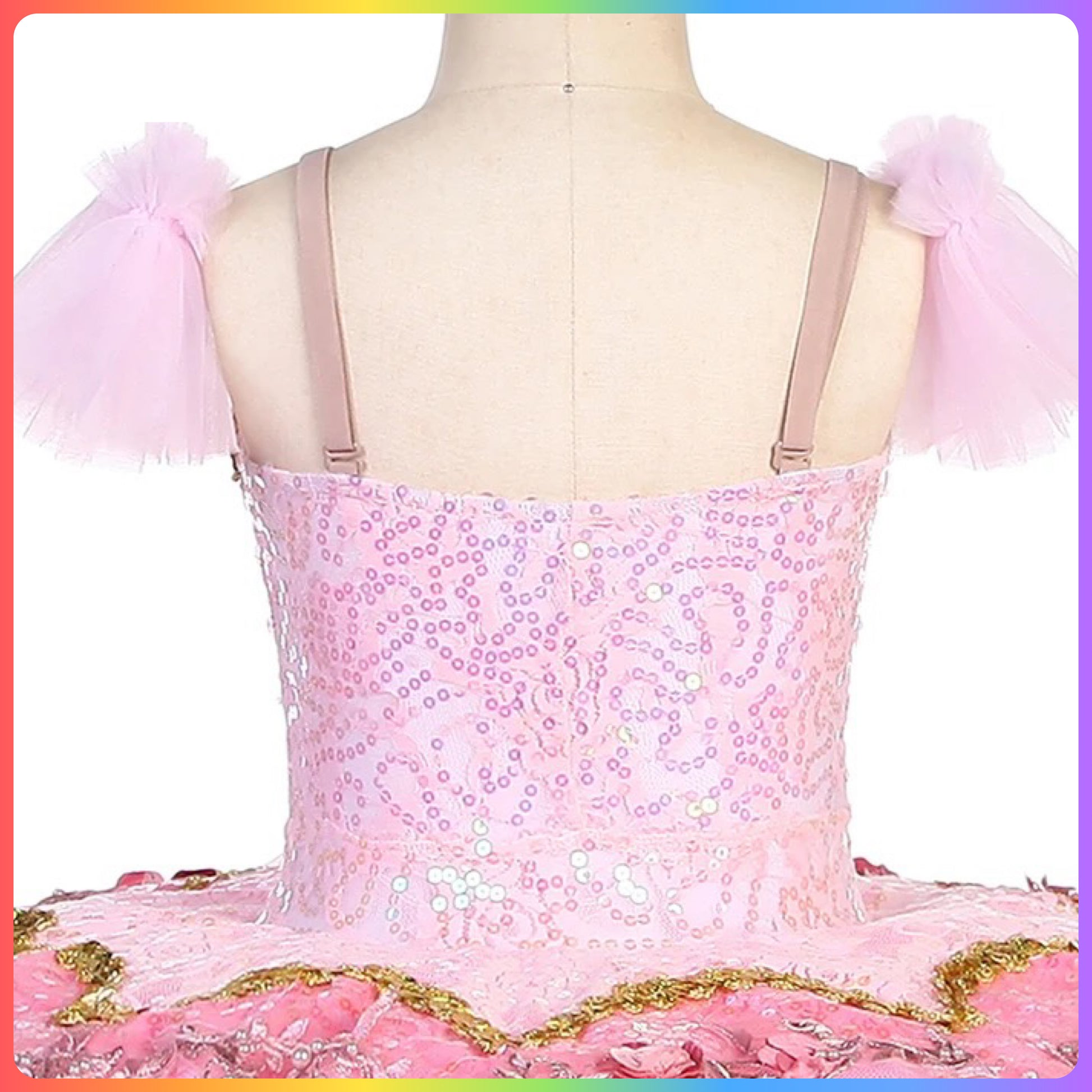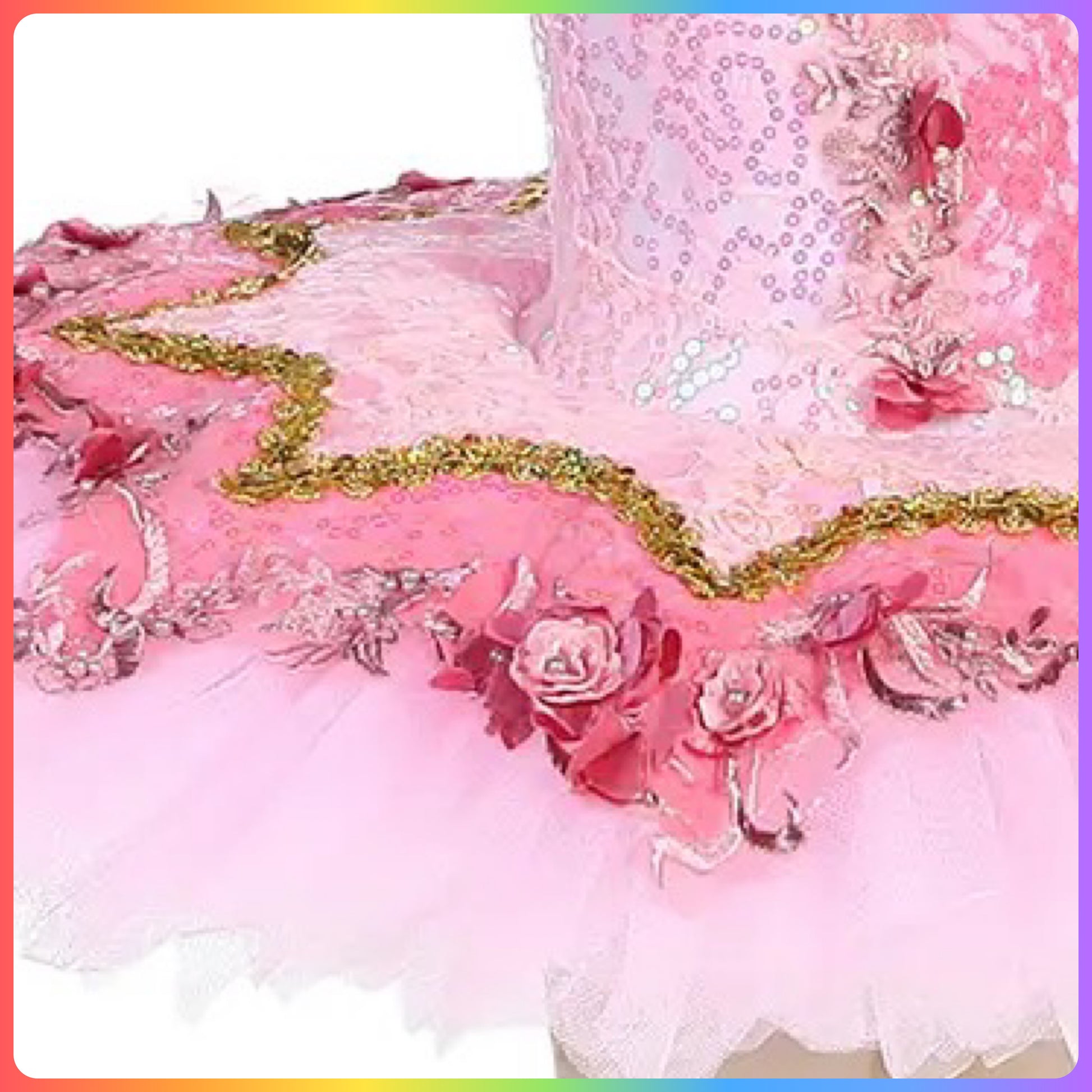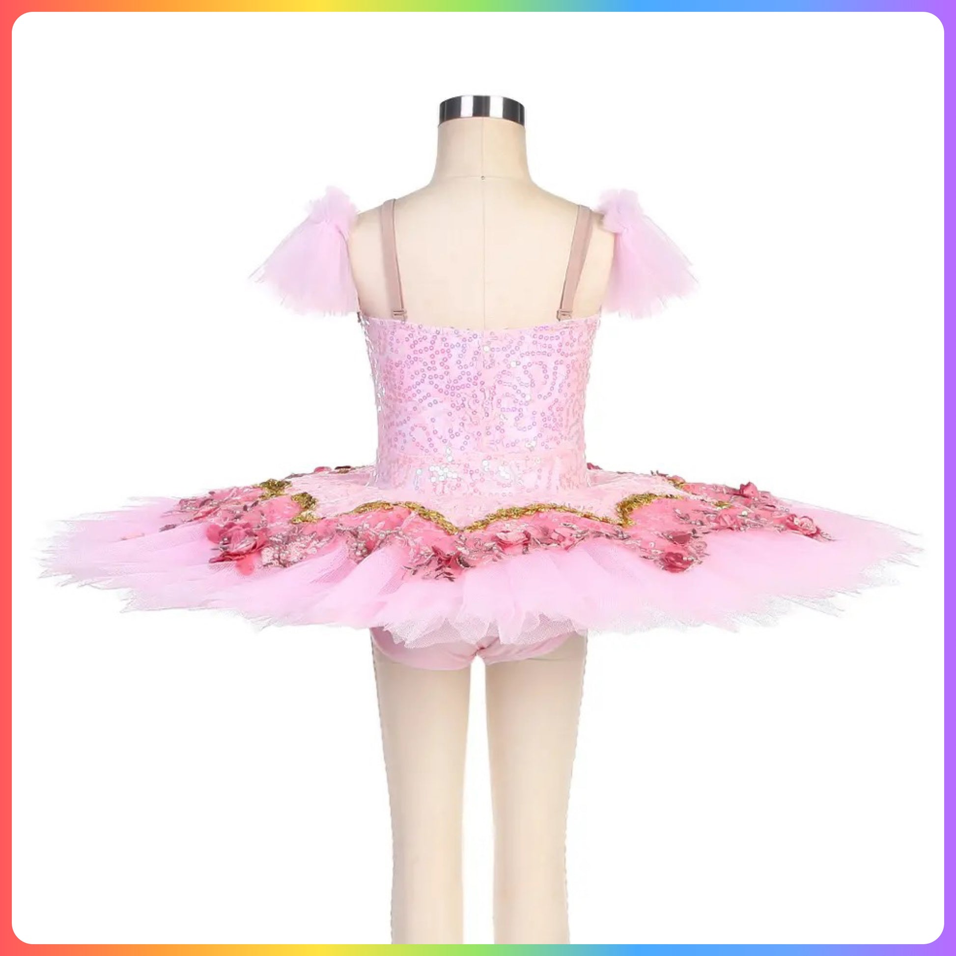 Stretch Pink Sequin bodice with gold trim, floral appliques and nude 'V' neckline, graduated layers of pleated ballet net to create a stunning pancake tutu with decorated top plate.