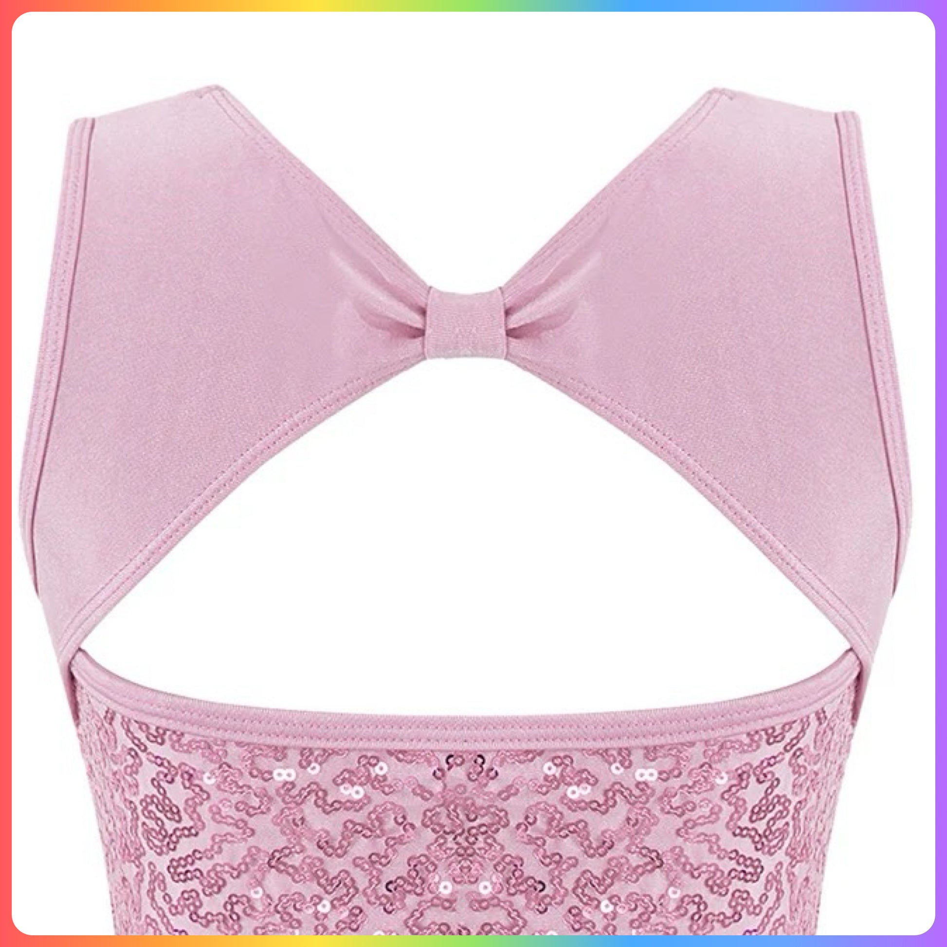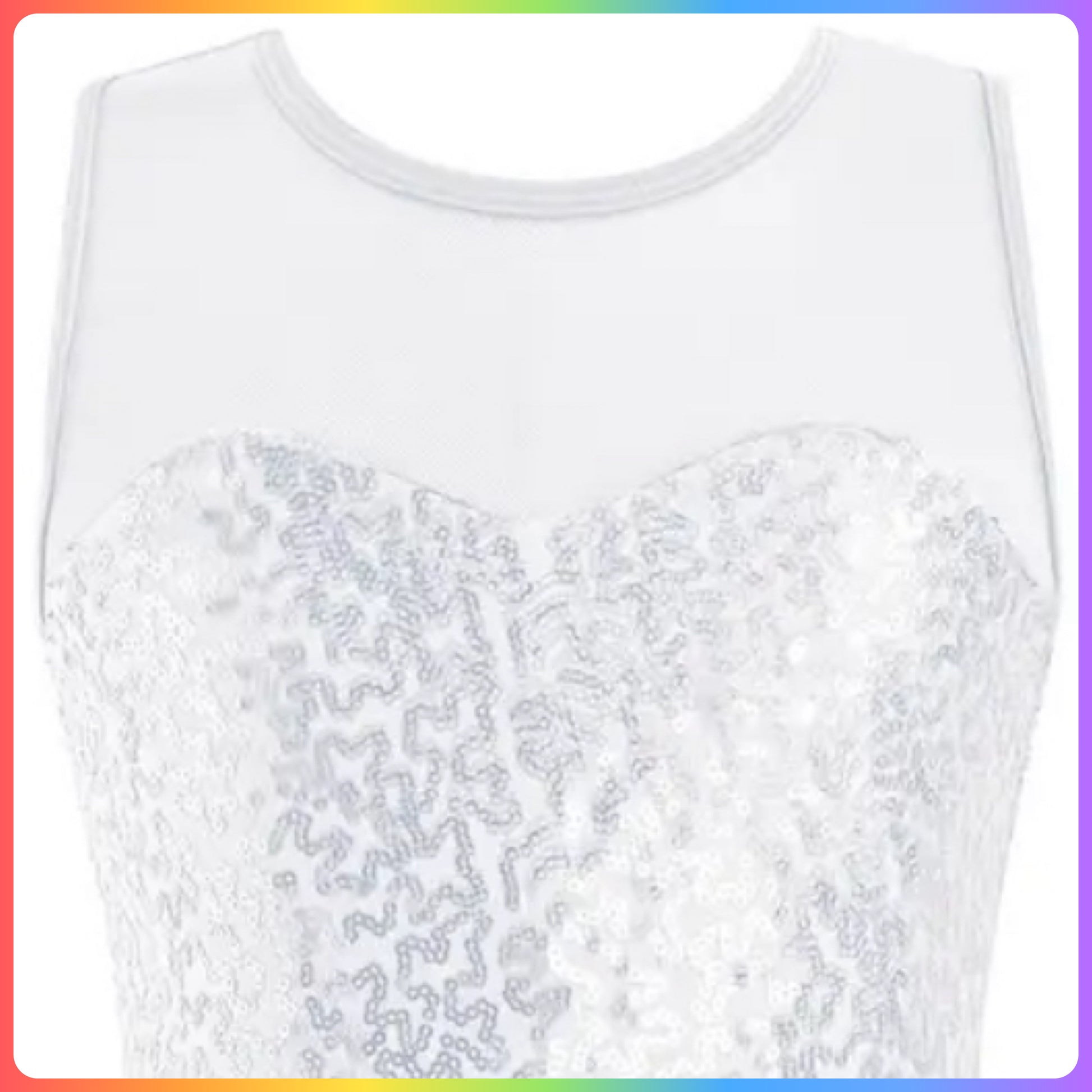 - Sleeveless, round neck, short leg unitard with attached split side sequin skirt and bow.