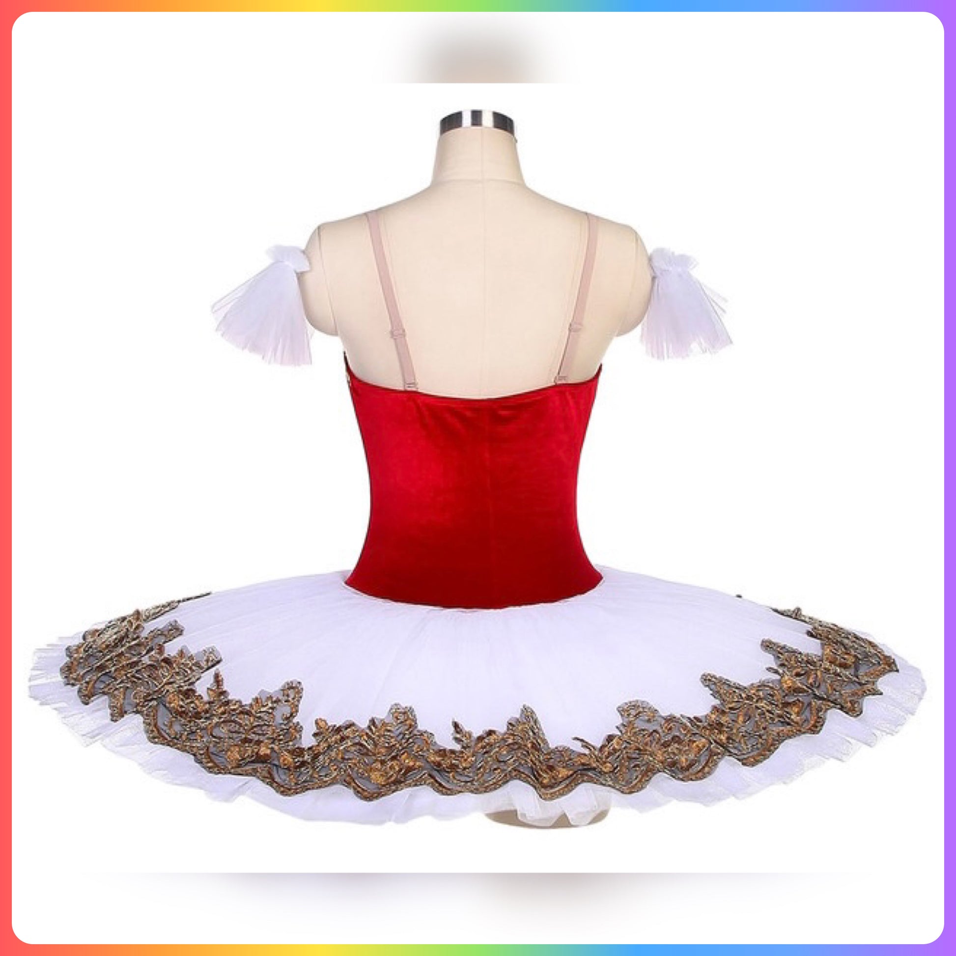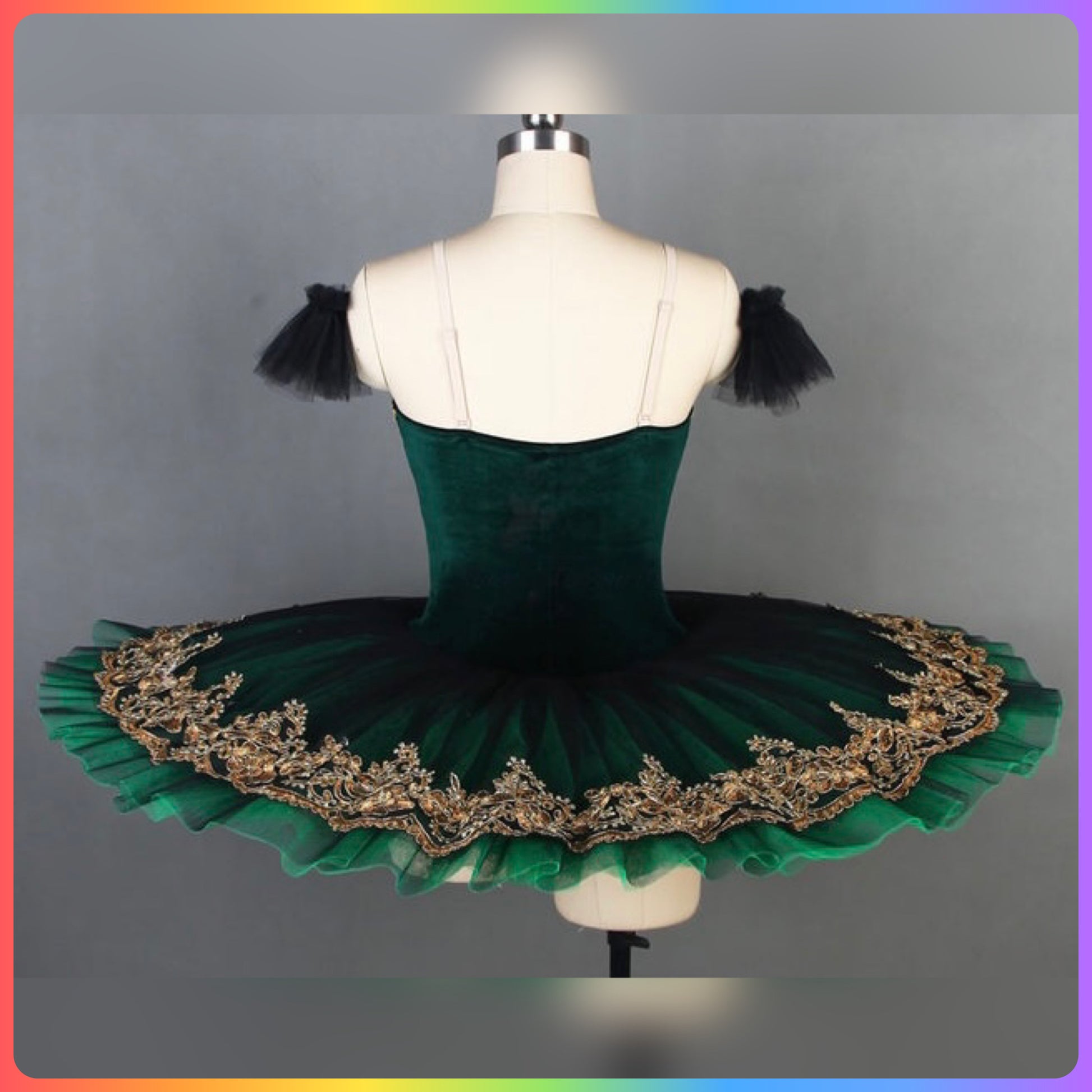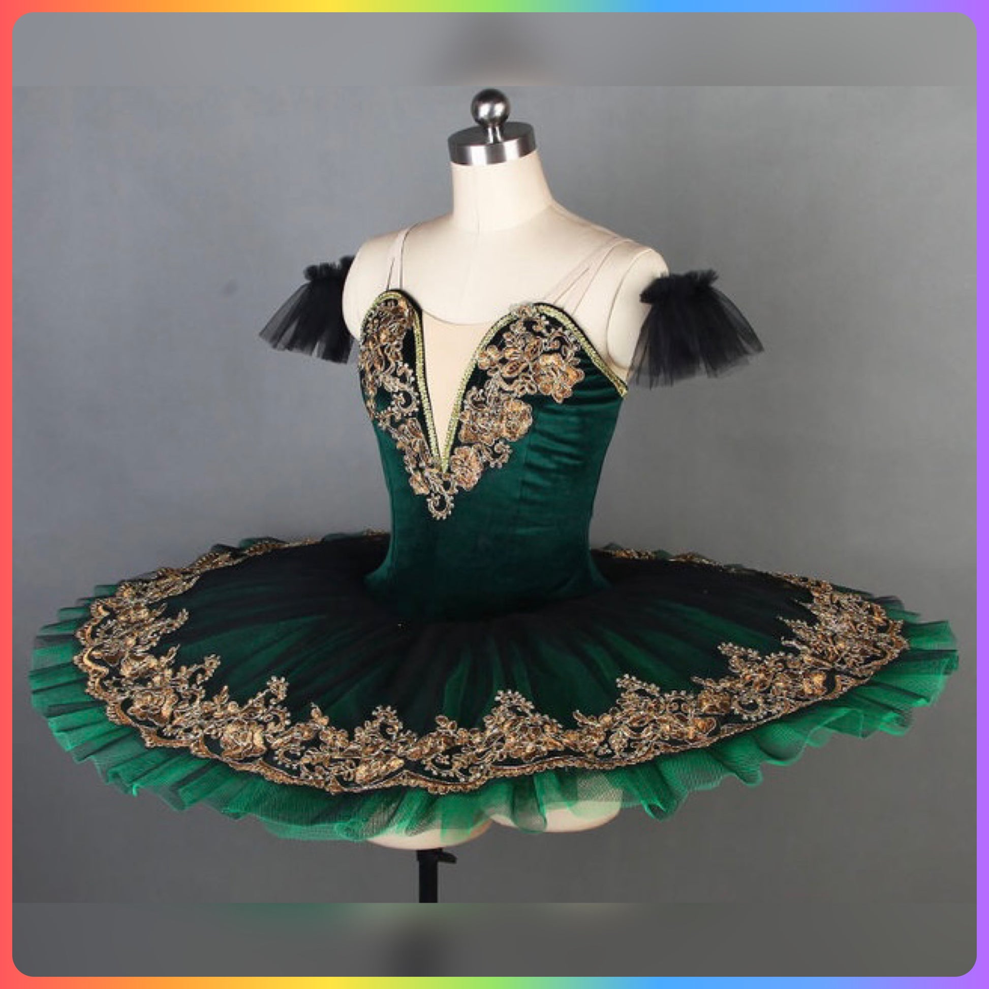 Stretch Velvet bodice with gold sequin trim, graduated layers of pleated ballet net to create a stunning pancake tutu with decorated top plate.