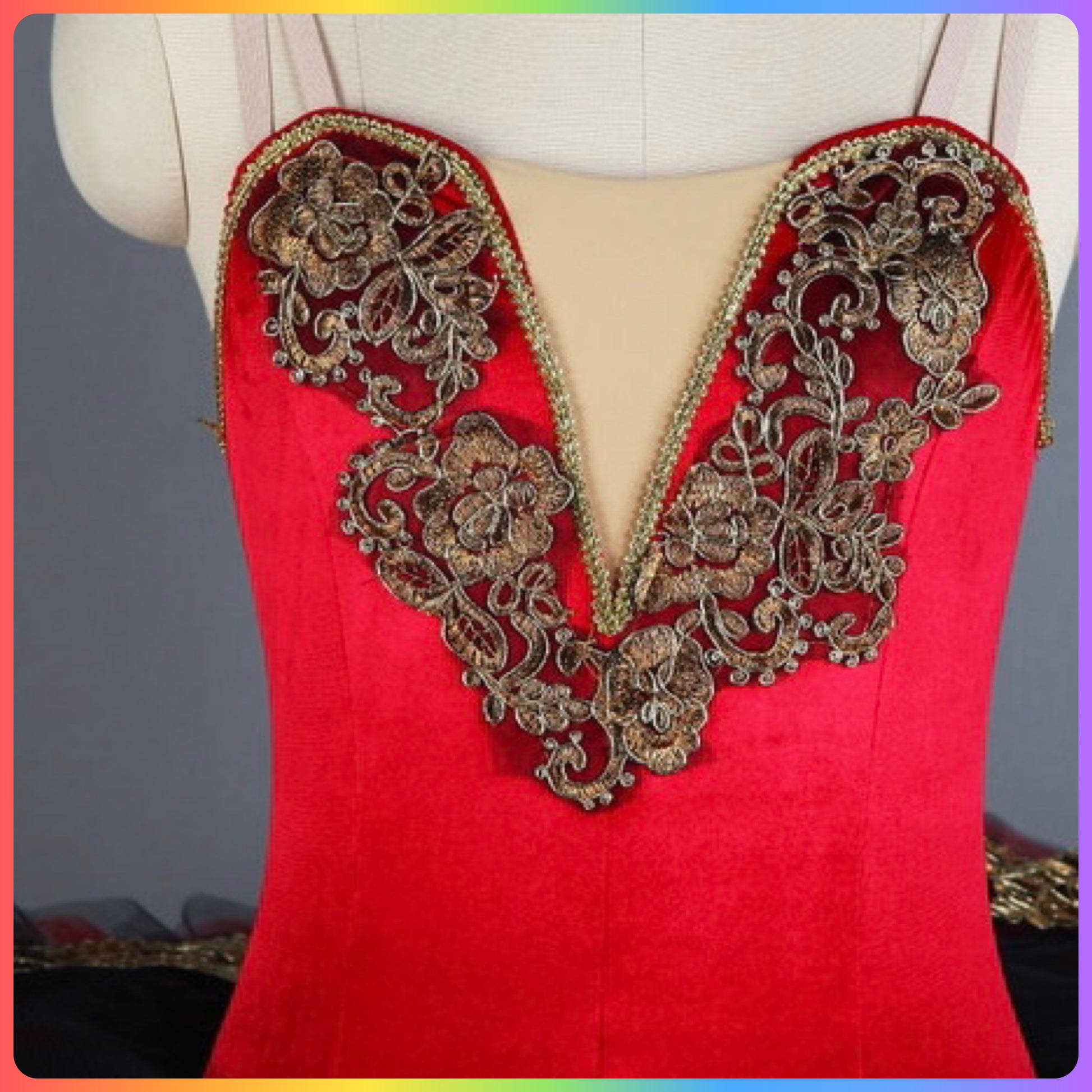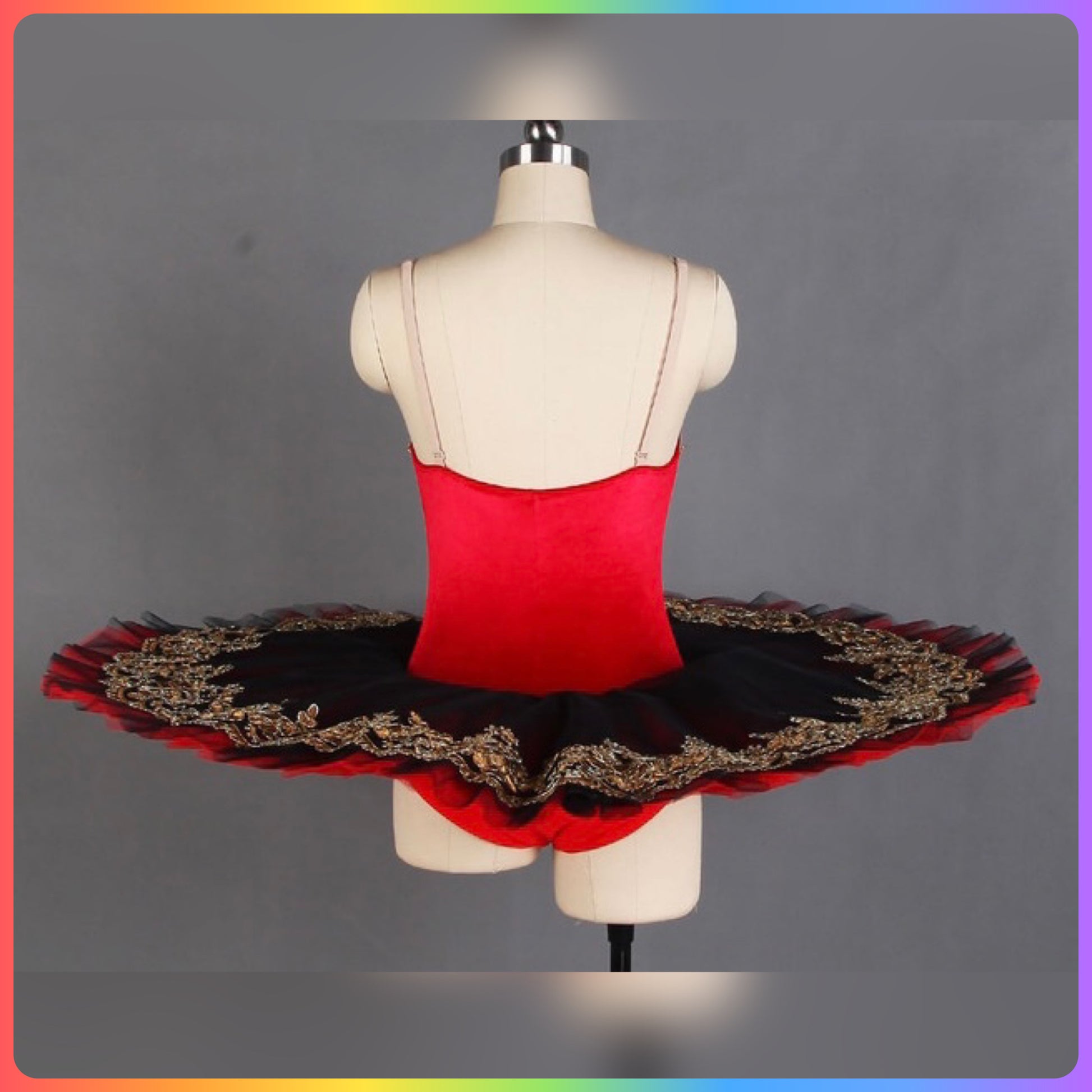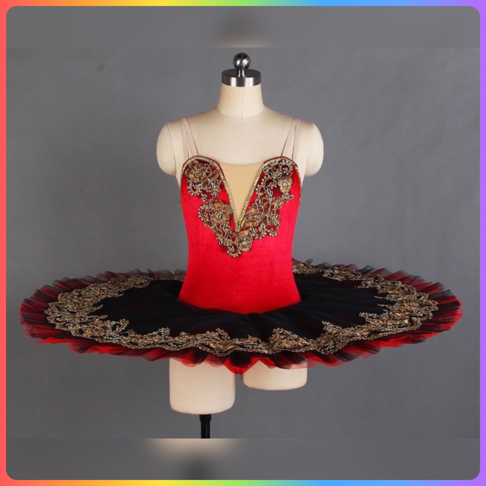 Stretch Velvet bodice with gold sequin trim, graduated layers of pleated ballet net to create a stunning pancake tutu with decorated top plate.