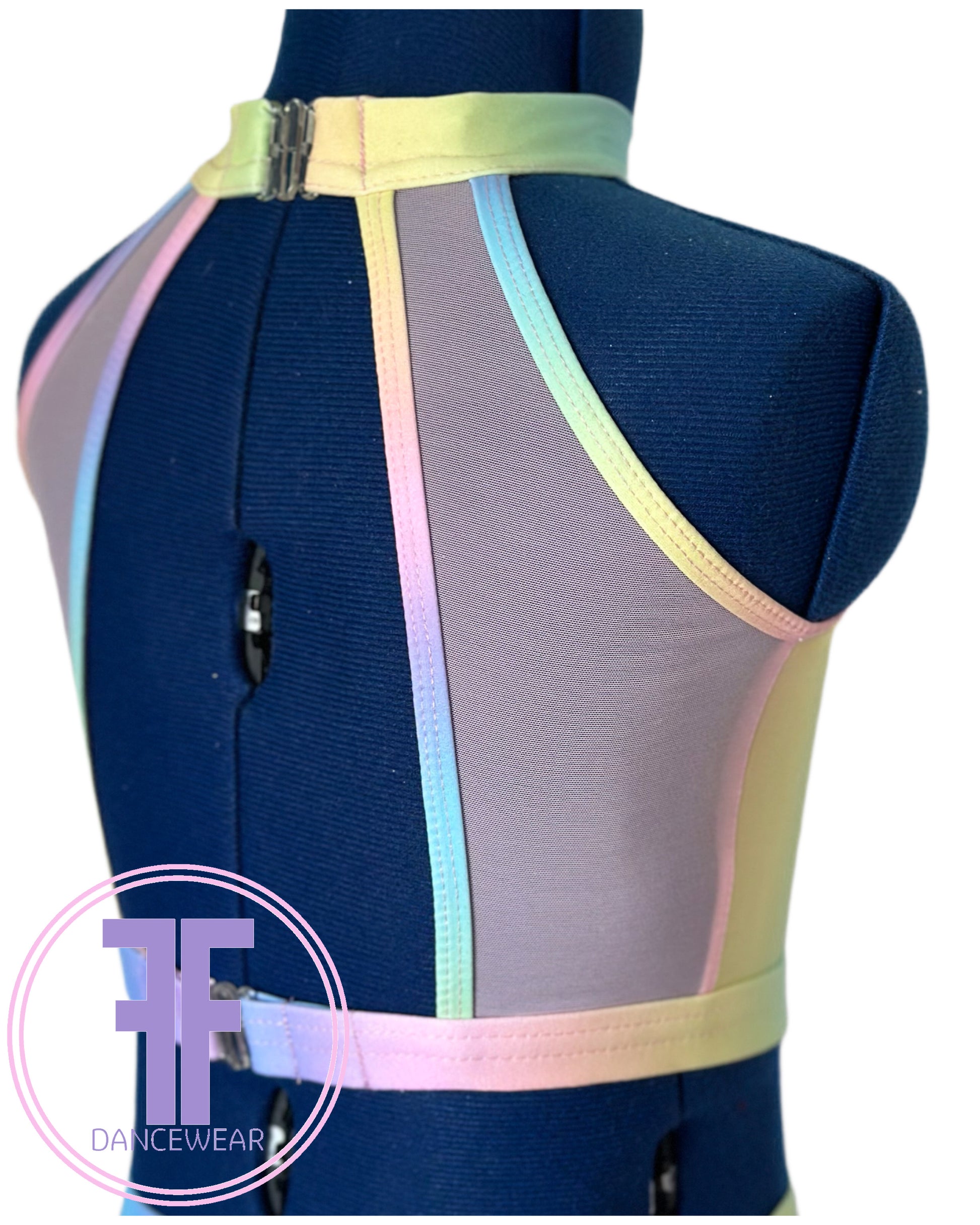 Open back crop top with sweetheart bustline in pastel rainbow printed Lycra and pink mesh.