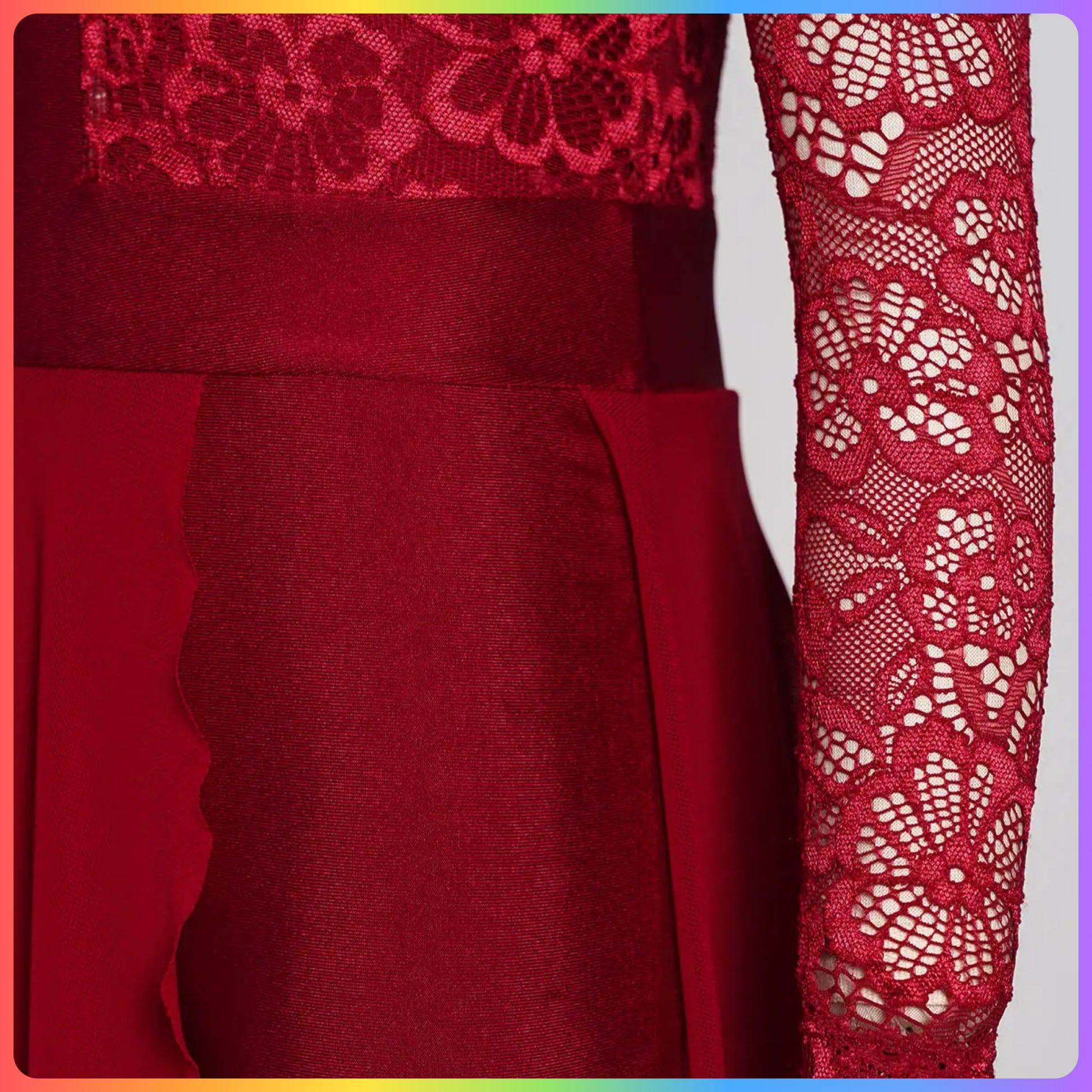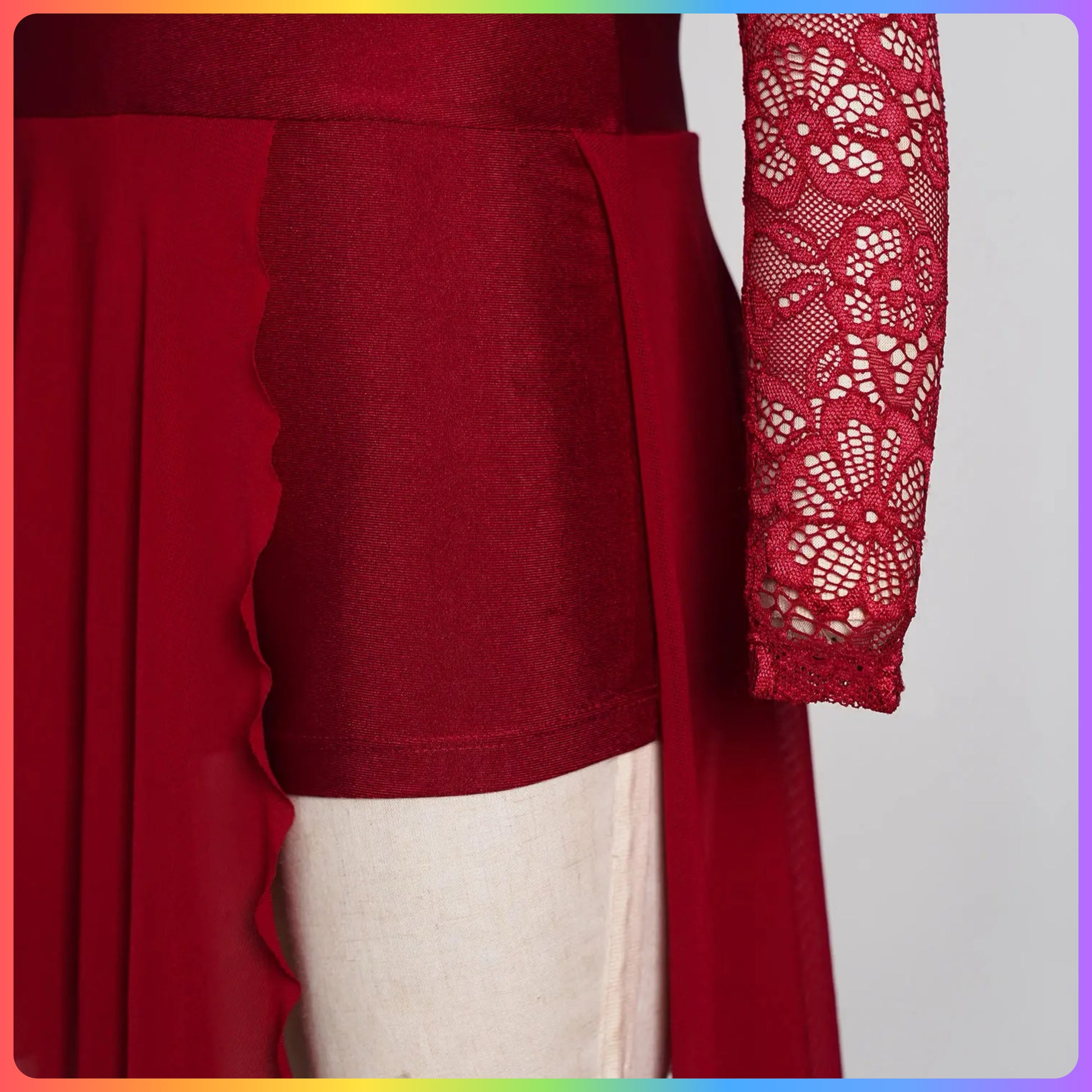 - One piece, short leg unitard with detachable straps, one long sleeve in stretch lace and attached open split skirt in stretch mesh.