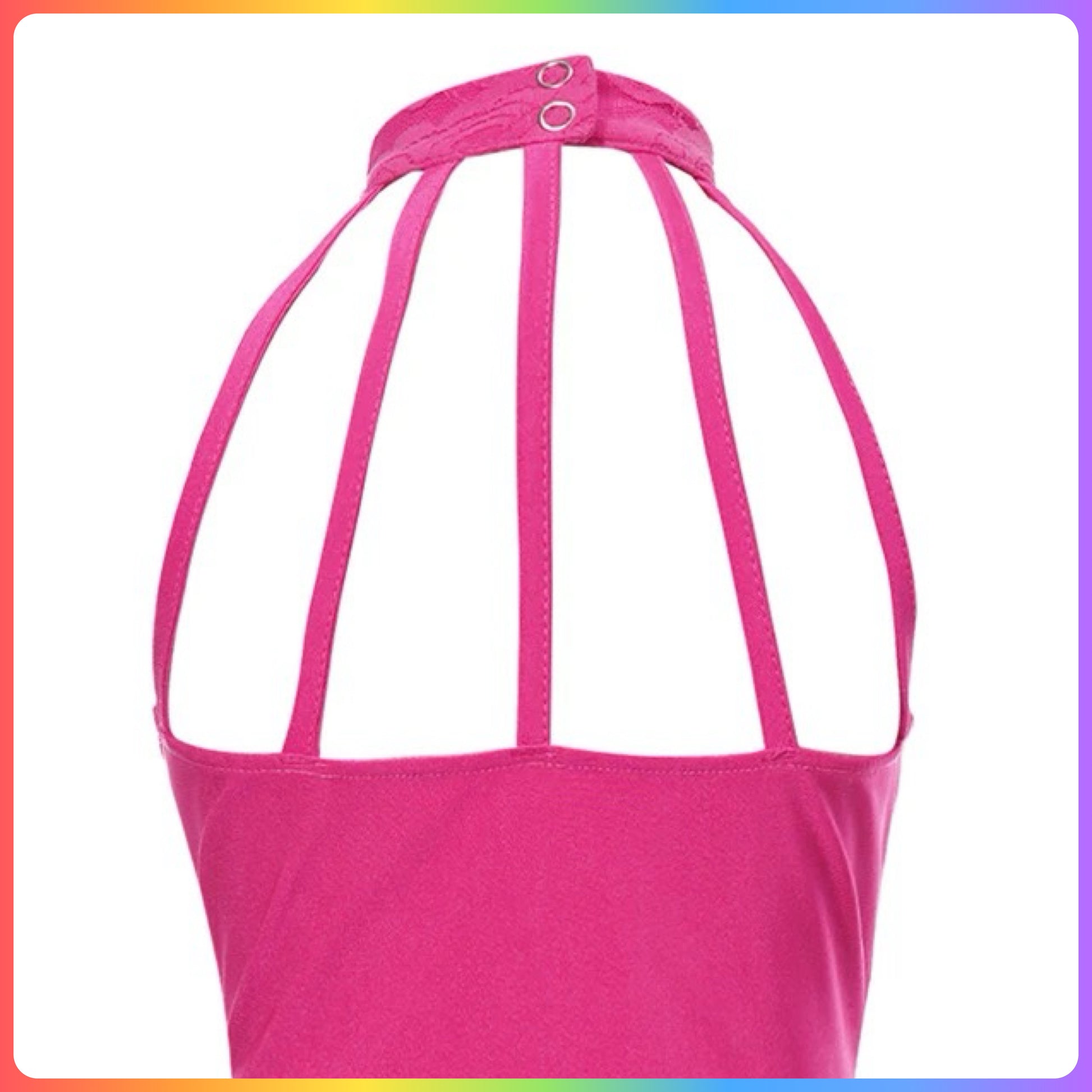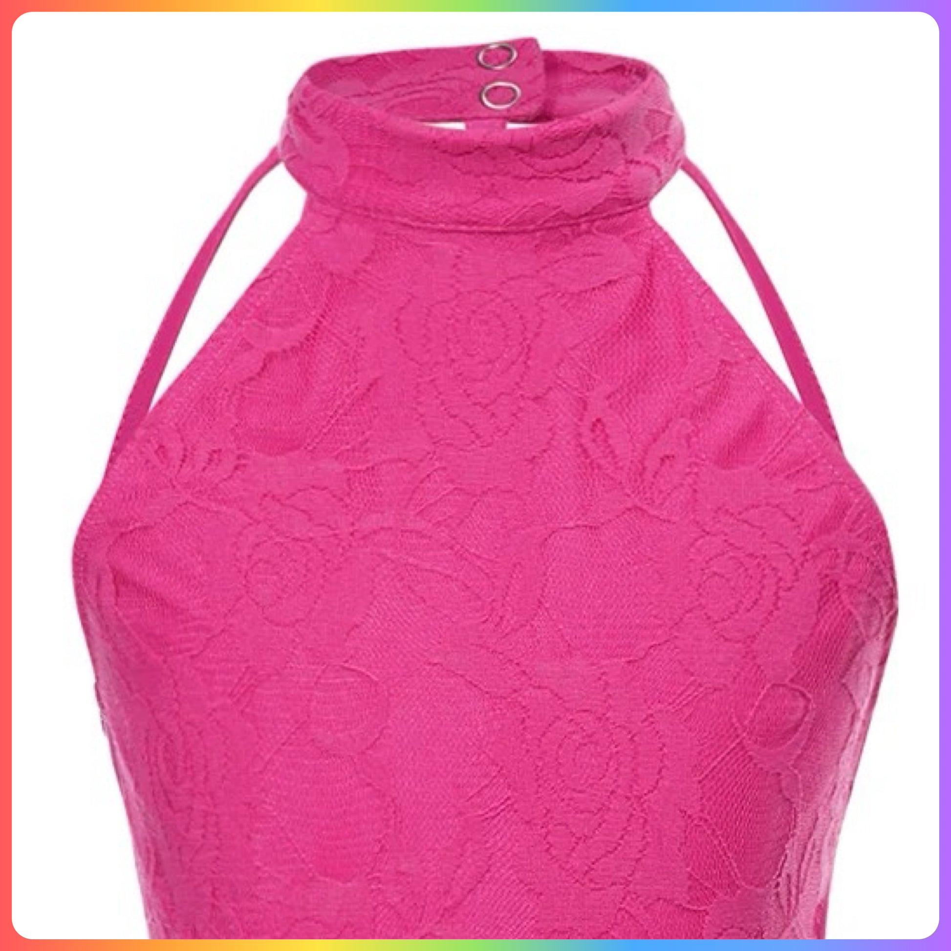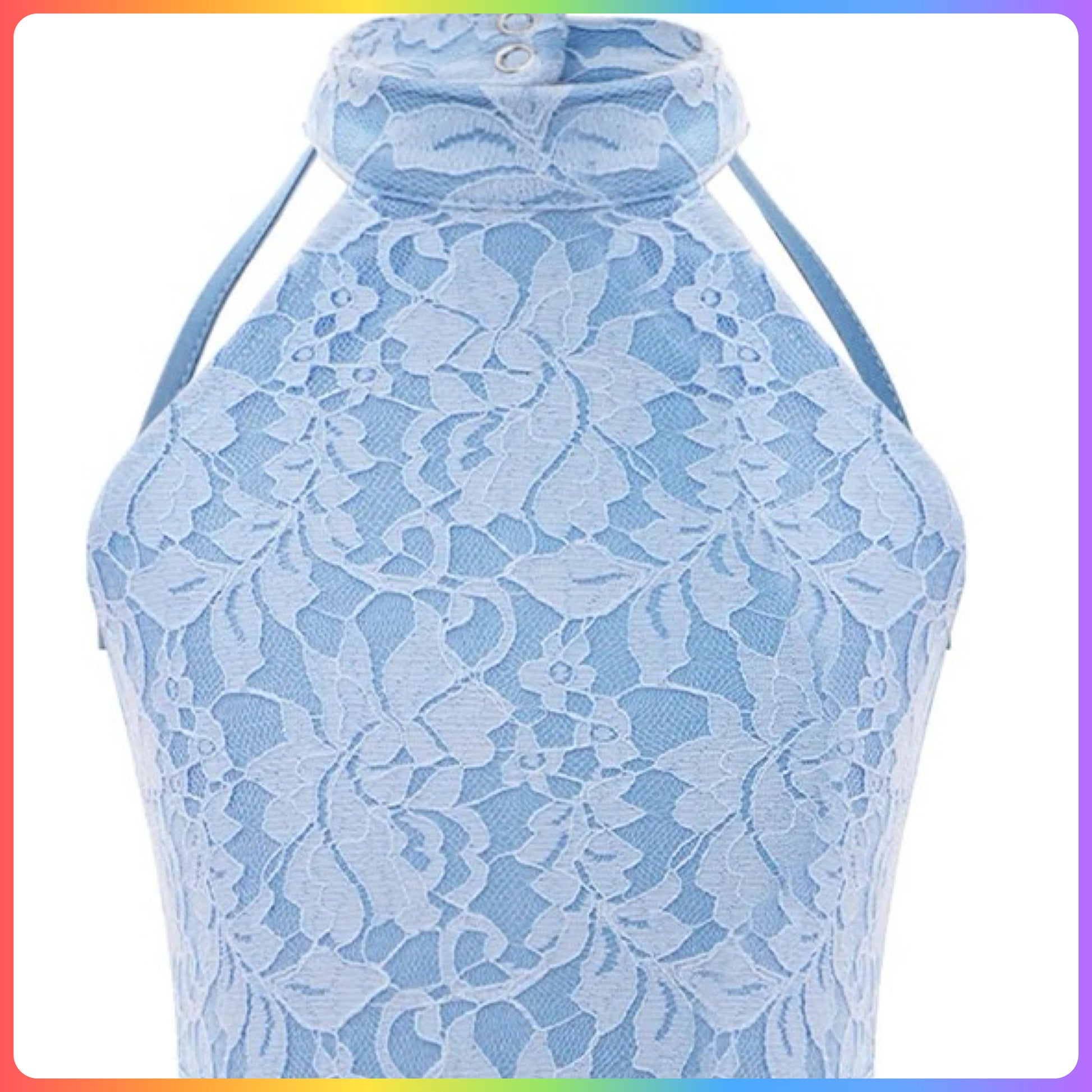 - Sleeveless leotard, collar with a button closure, and back straps. The front features beautiful stretch floral lace