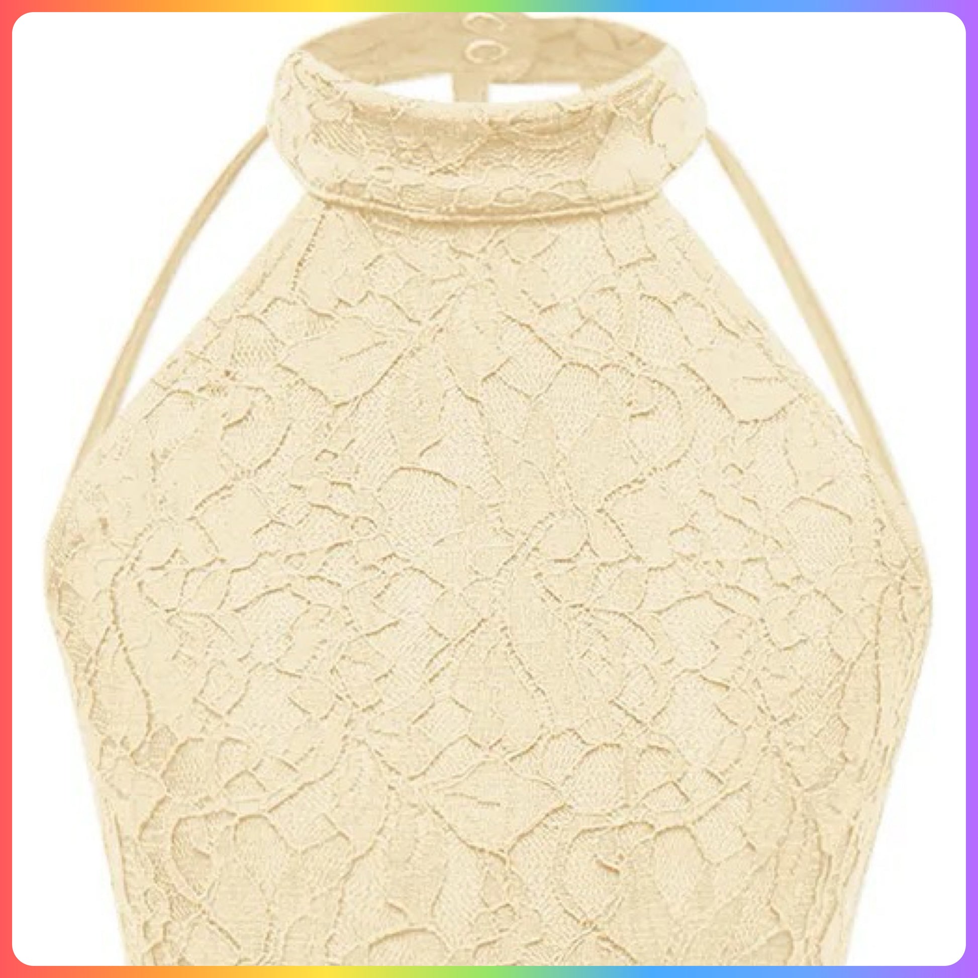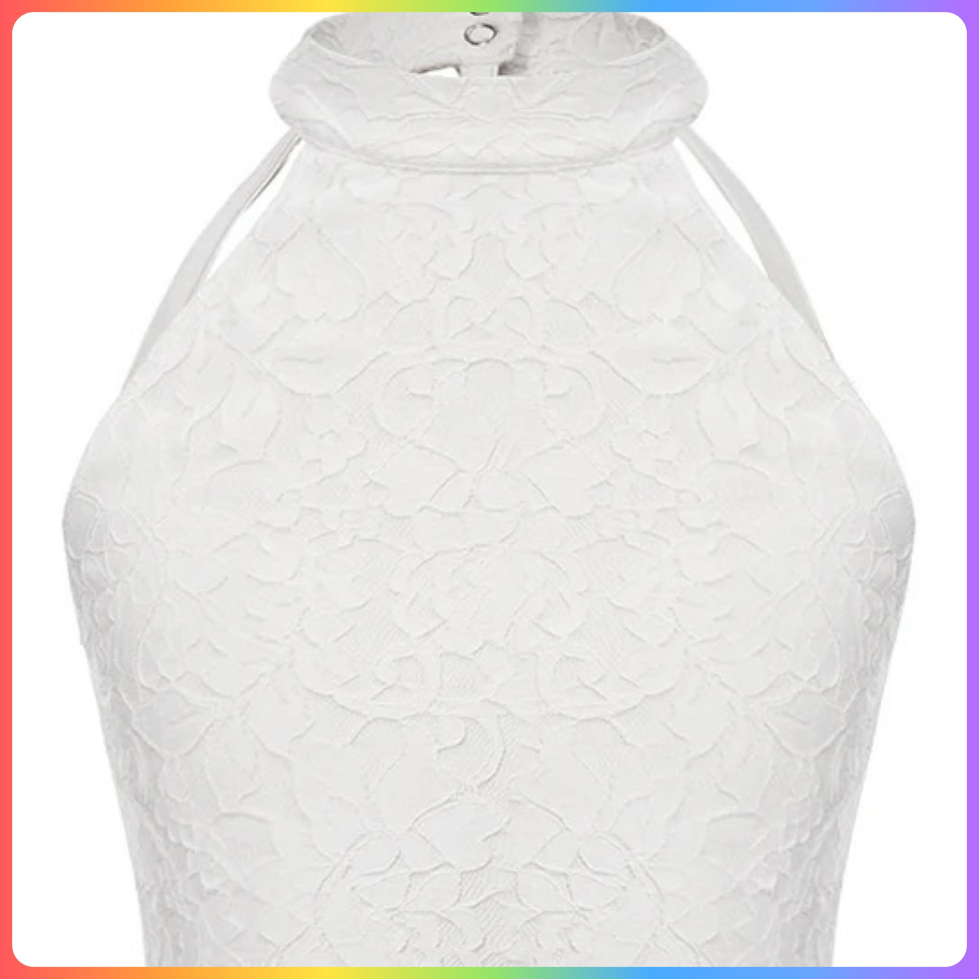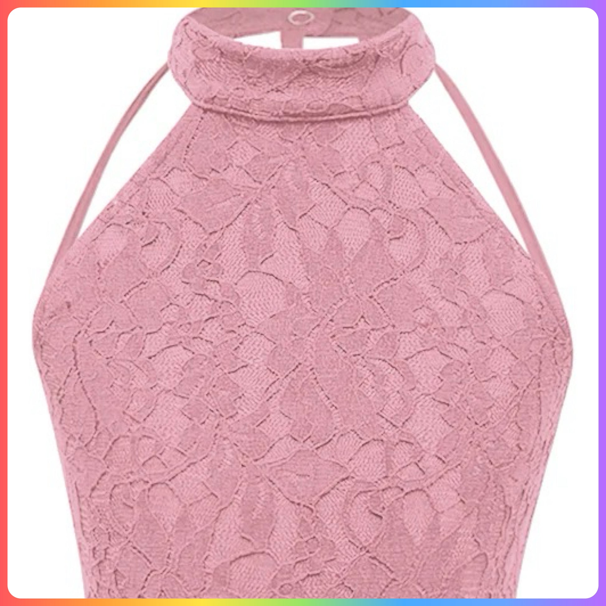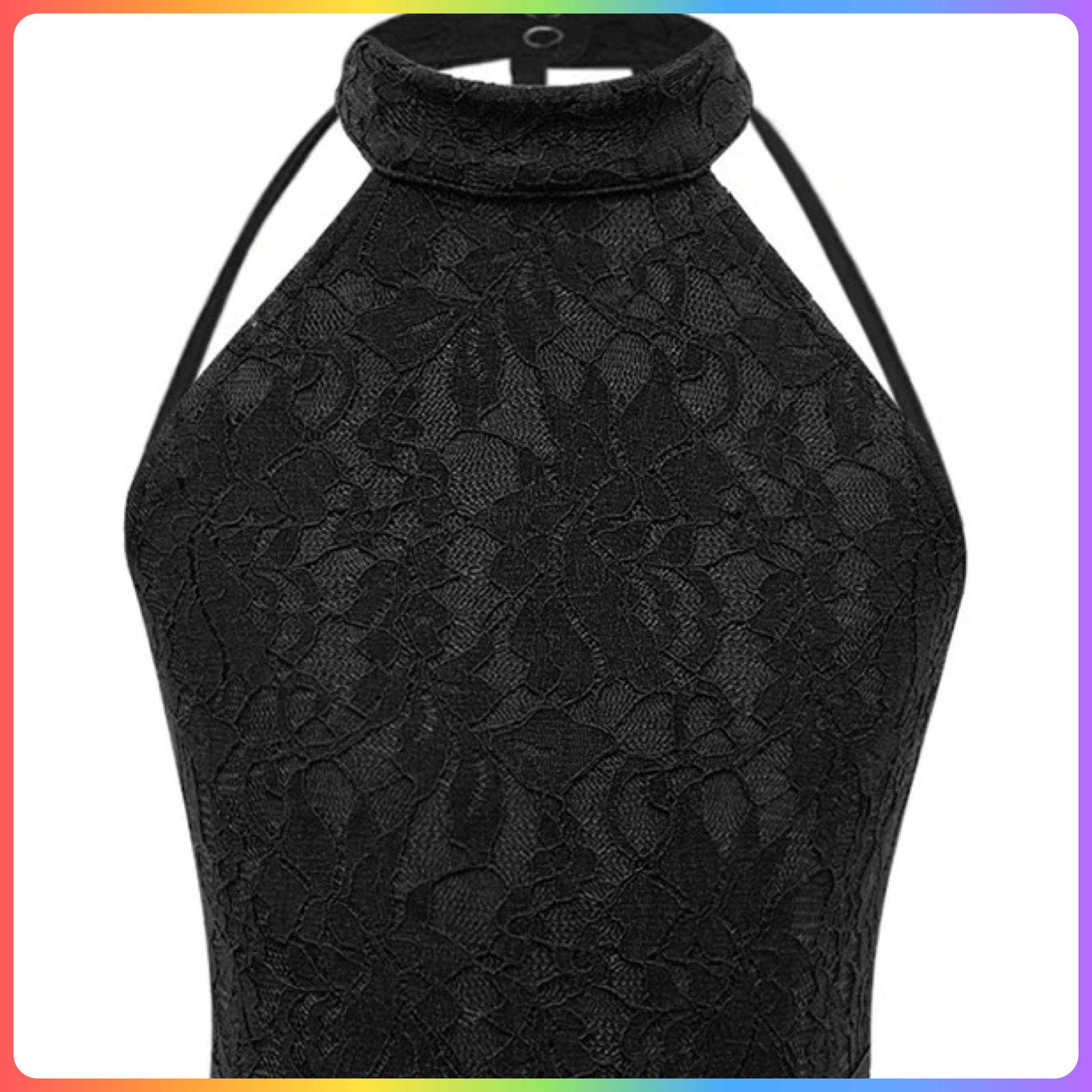 - Sleeveless leotard, collar with a button closure, and back straps. The front features beautiful stretch floral lace