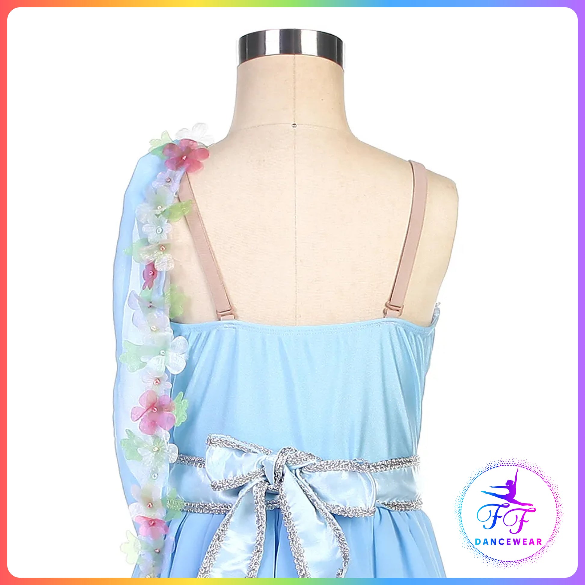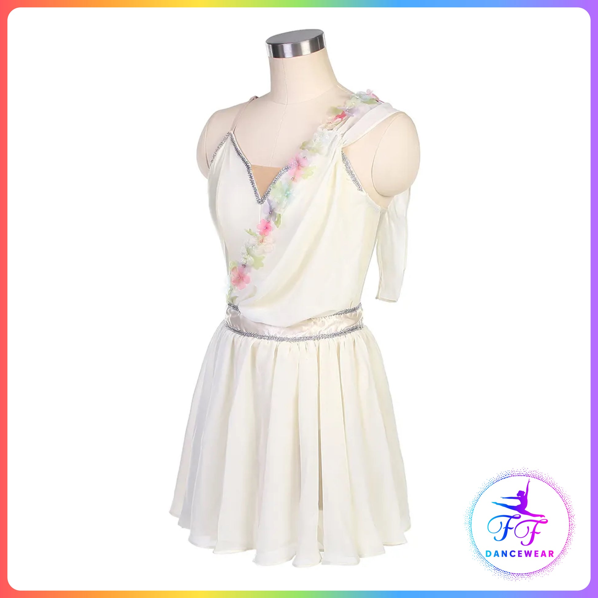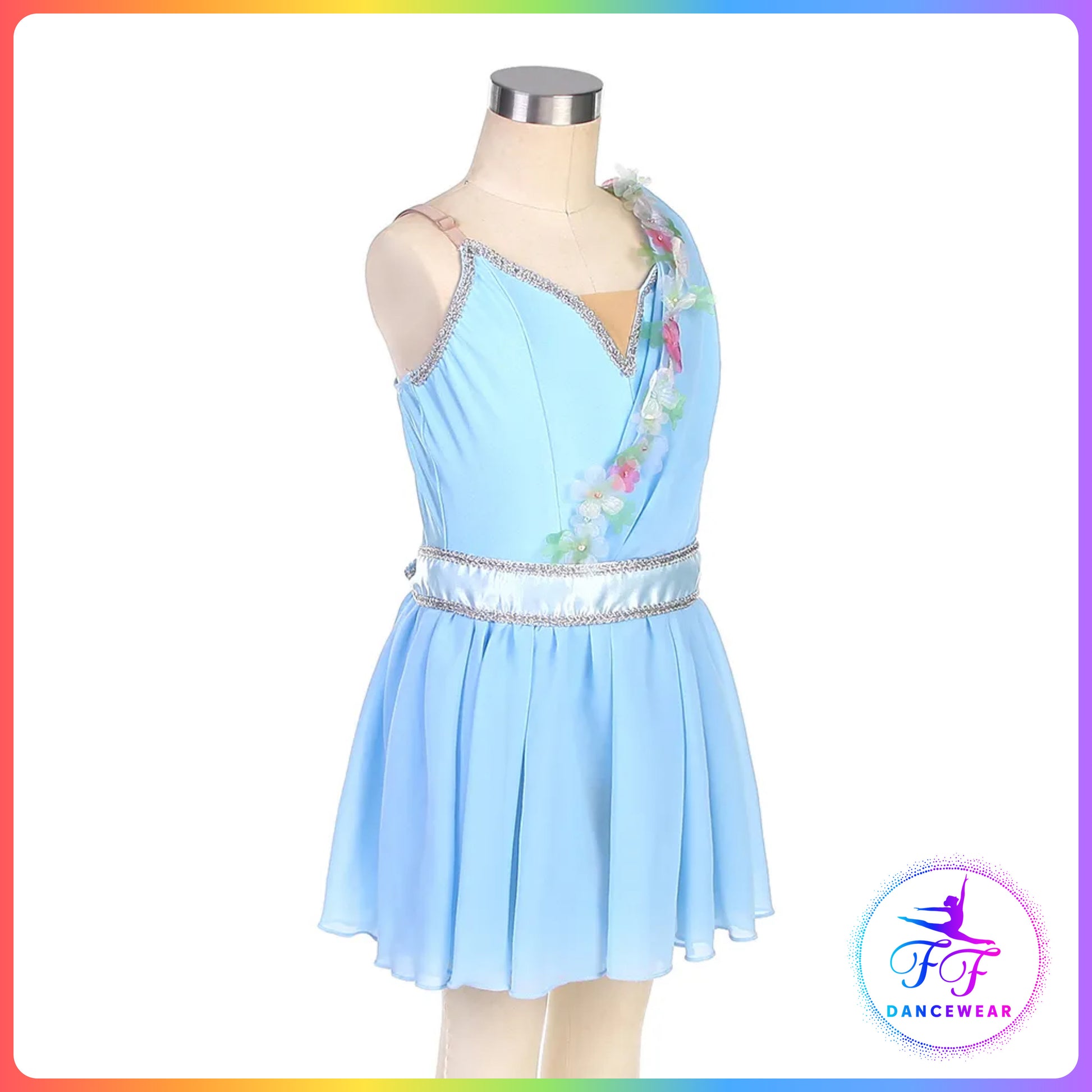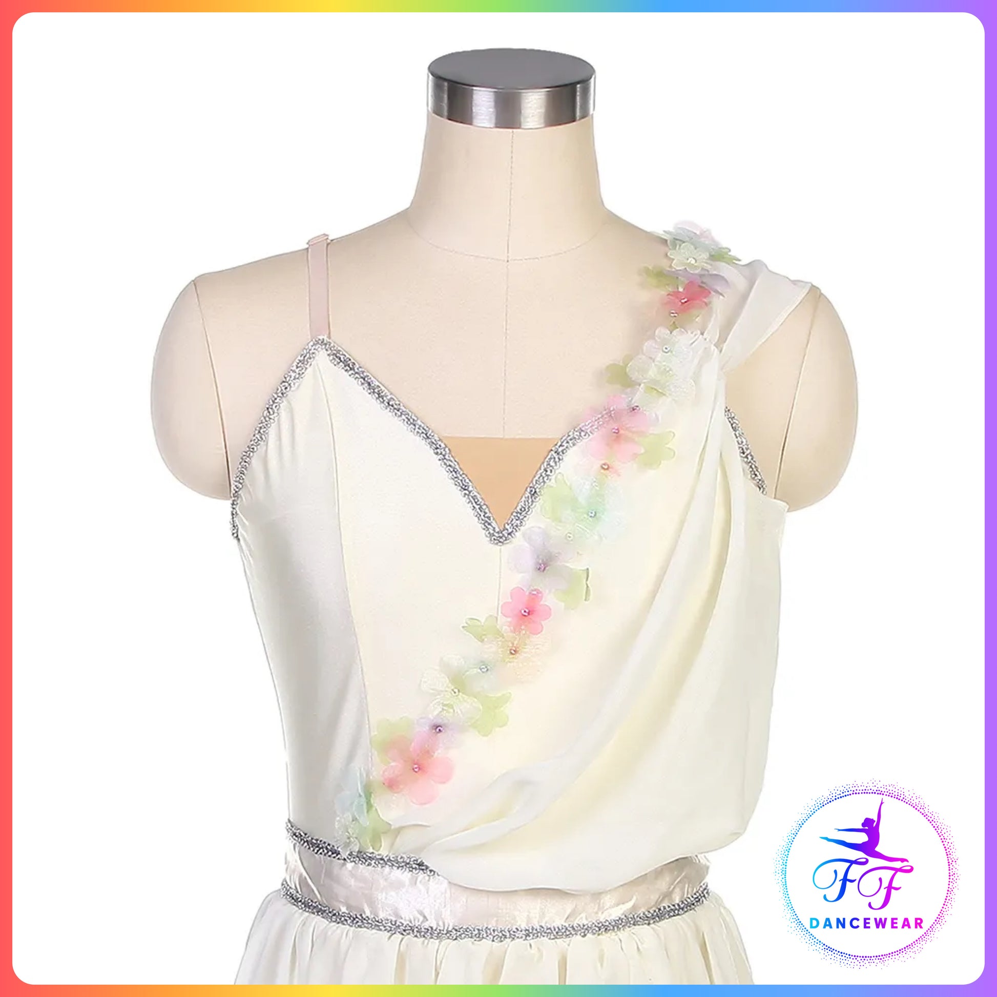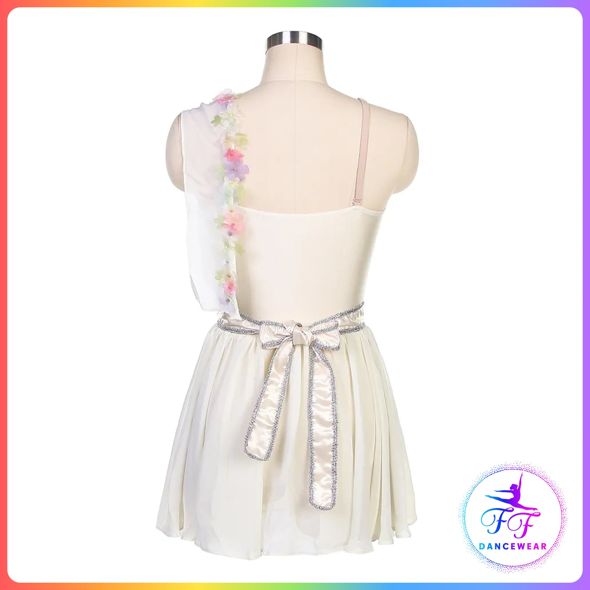 Spandex bodice with soft tulle drape and attached flowers, and tulle skirt. Available in Ivory, Pink or Blue.