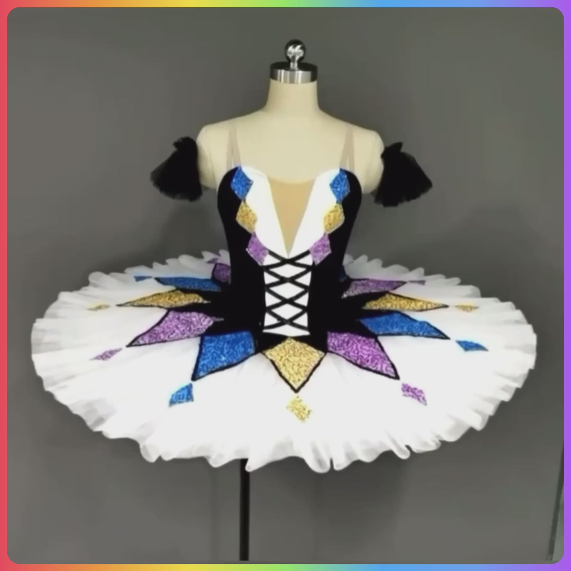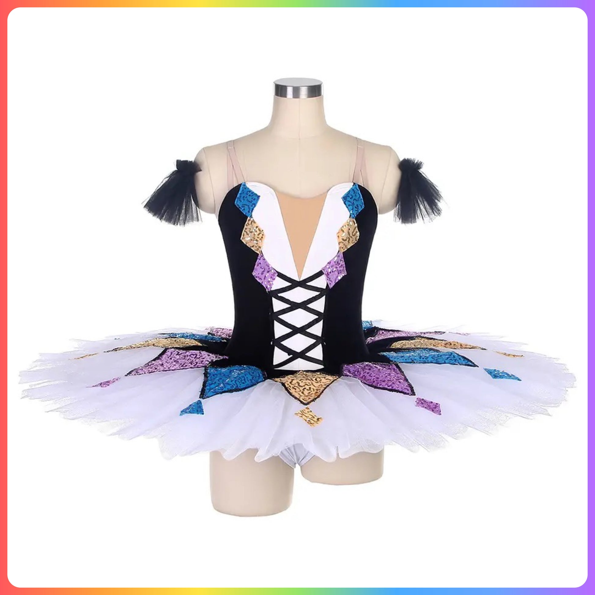 Black velvet stretch bodice with white and nude panel, decorated with sequin harlequin pattern, graduated layers of pleated ballet net to create a stunning pancake tutu with decorated top plate.