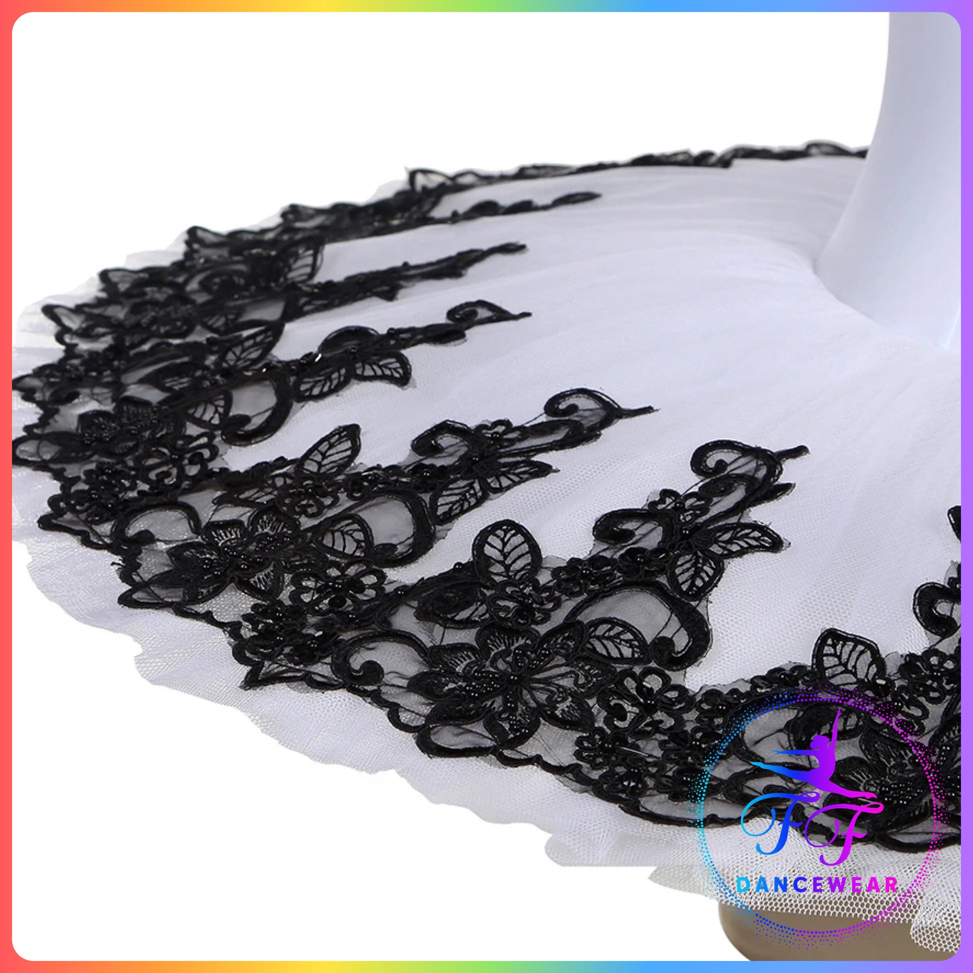 Spandex leotard bodice with black applique trim in the front, attached layers of stiff tulle pancake tutu skirt with black applique trim edge.
