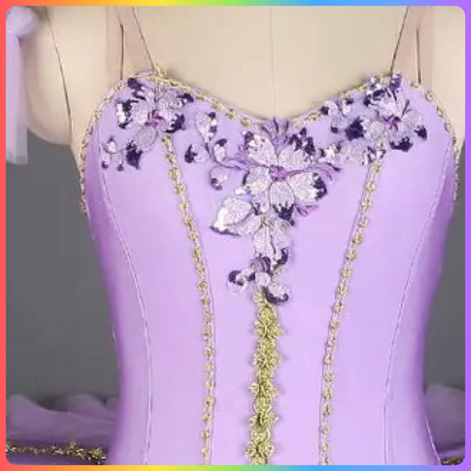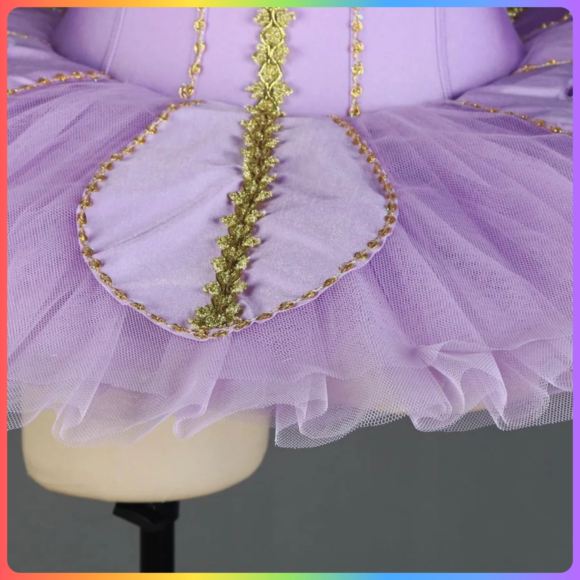 Stretch spandex bodice with gold trim and purple appliques, graduated layers of pleated ballet net to create a stunning pancake tutu with decorated top plate.