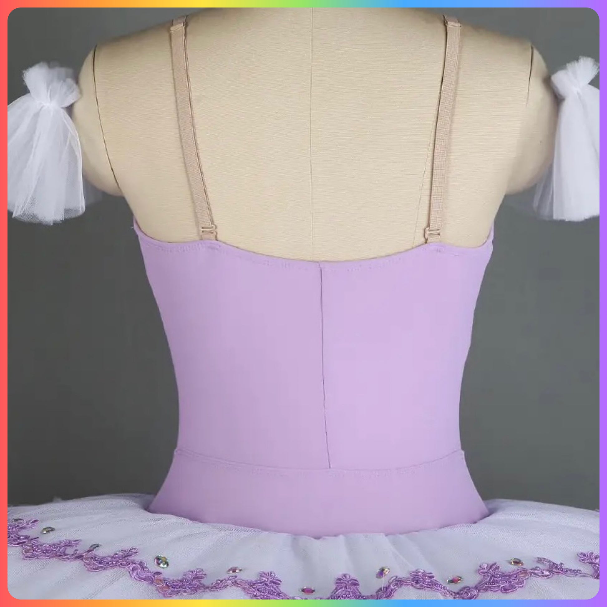 Stretch spandex bodice with lilac trim, graduated layers of pleated ballet net to create a stunning pancake tutu with decorated sequin top plate.