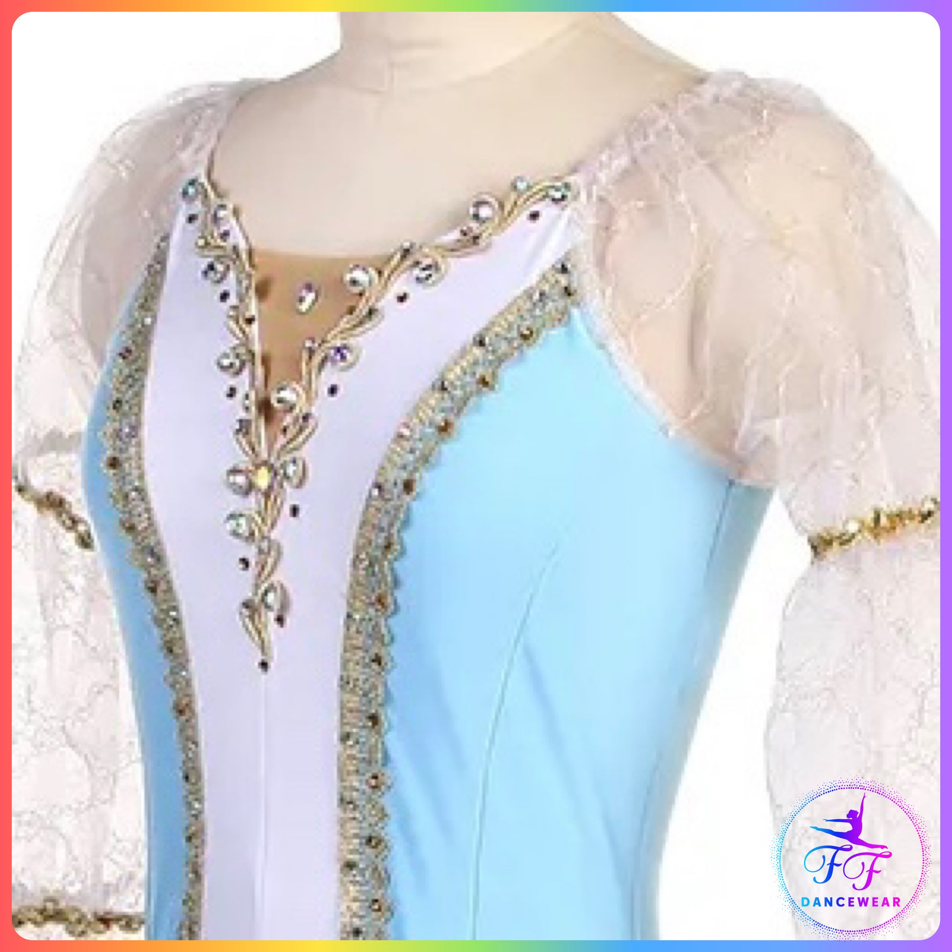 Spandex long sleeved bodice with nude 'v' neckline and gold trim, attached layers of romantic tutu skirt.