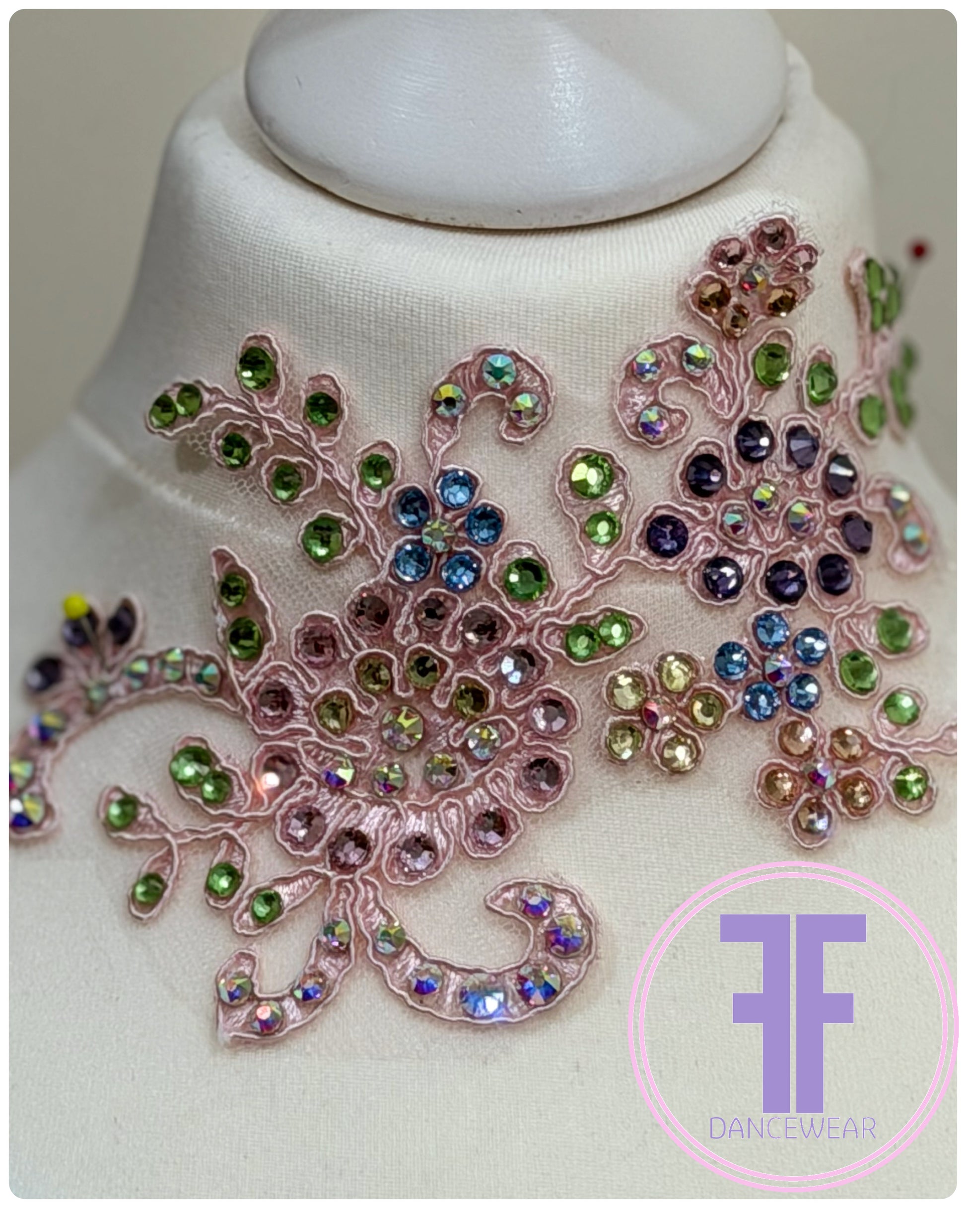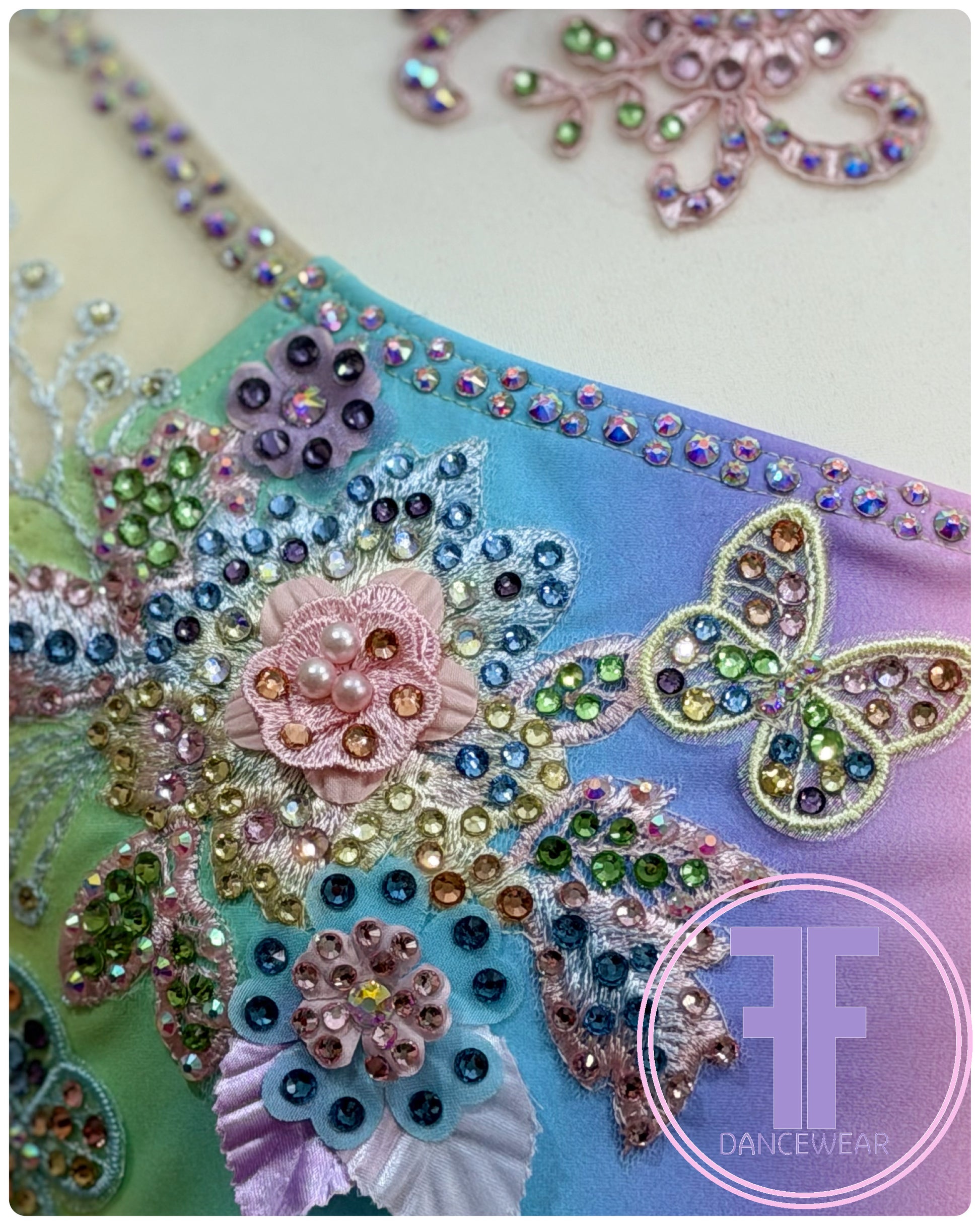 Decorated with floral and butterfly appliqués with superior quality crystals in AB, Tanzanite, Light Sapphire, Jonquil, Champagne, Peridot, Light Pink and Moonlight.