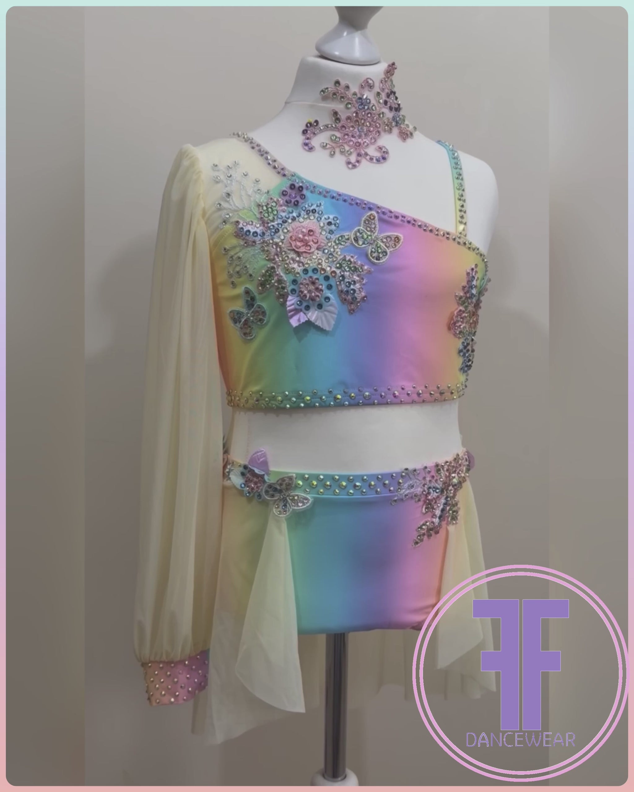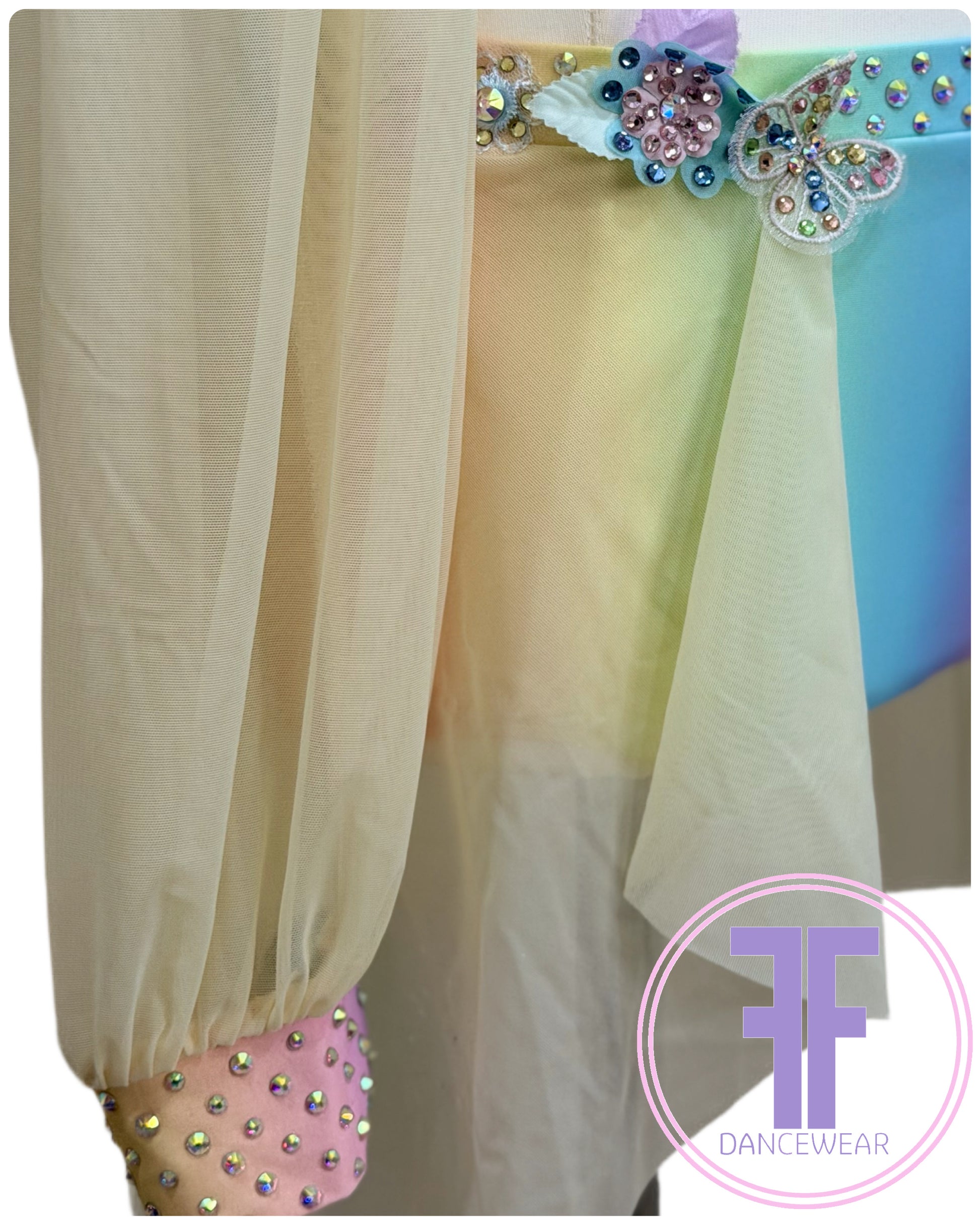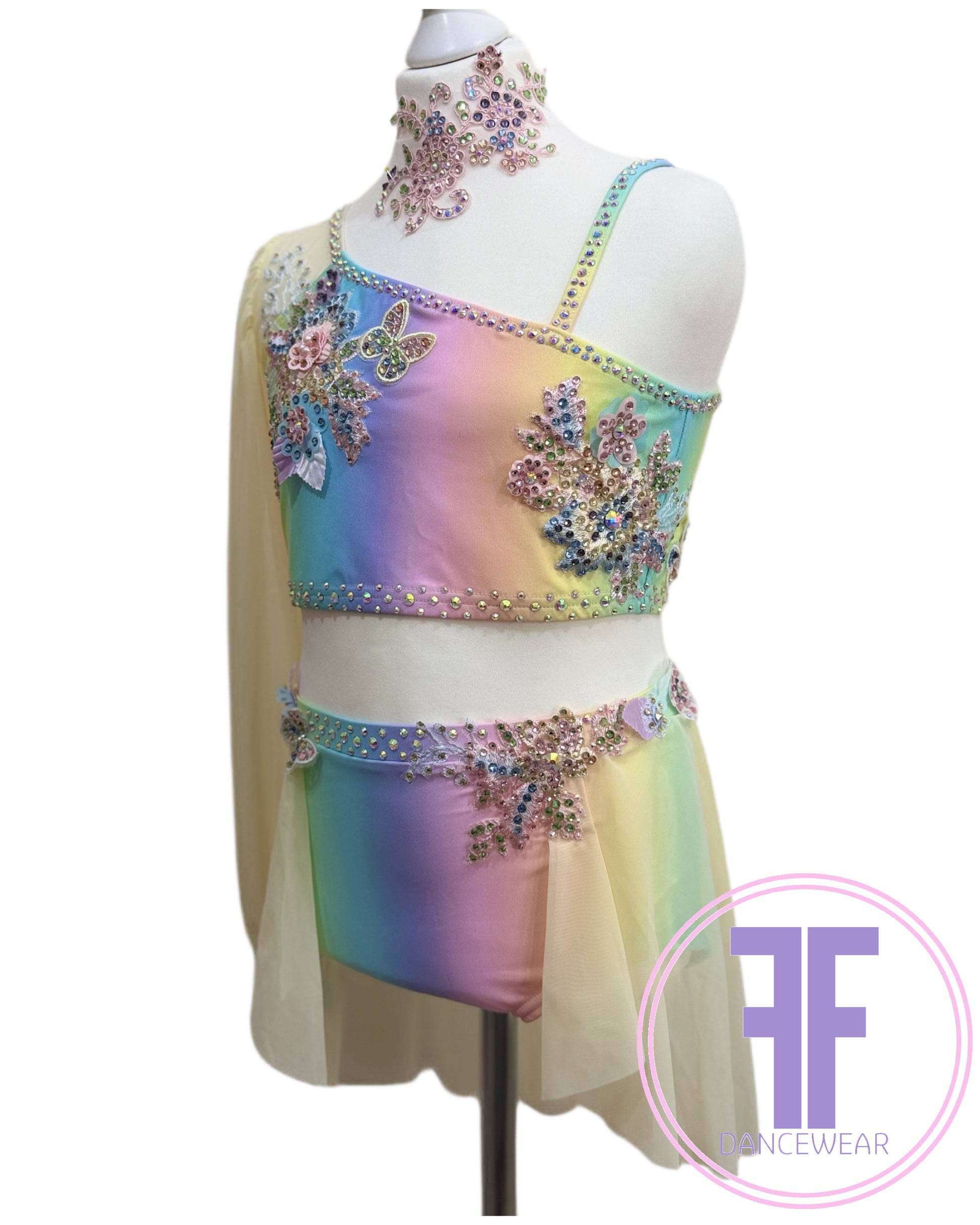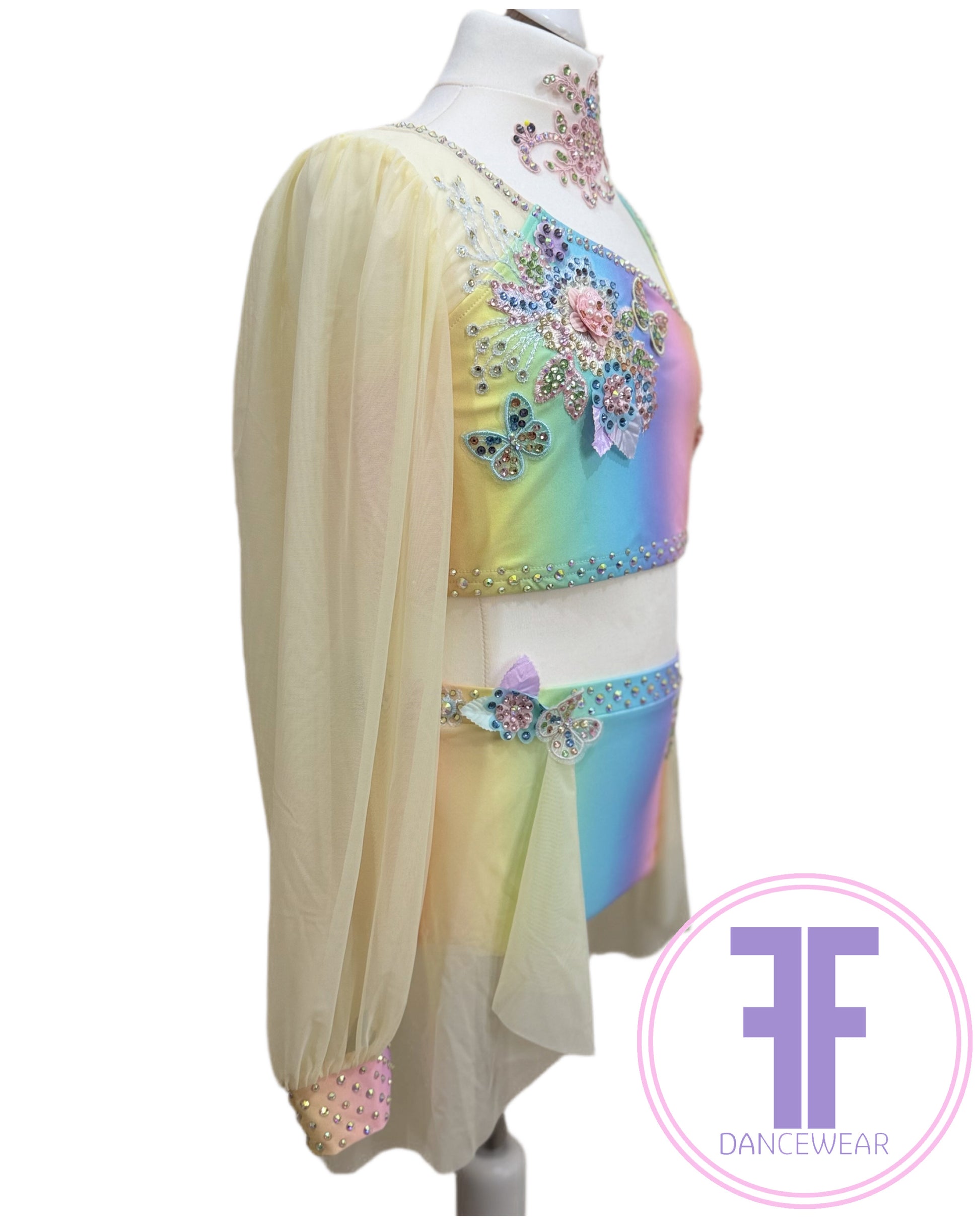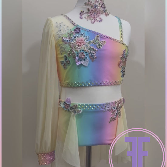 Pastel Rainbow Lycra and Lemon Powermesh One oversize sleeve crop top with asymmetrical neckline in pastel rainbow printed Lycra, and matching pants with attached half skirt in Powermesh. (Front of bodice and pants lined with white stretch lining).