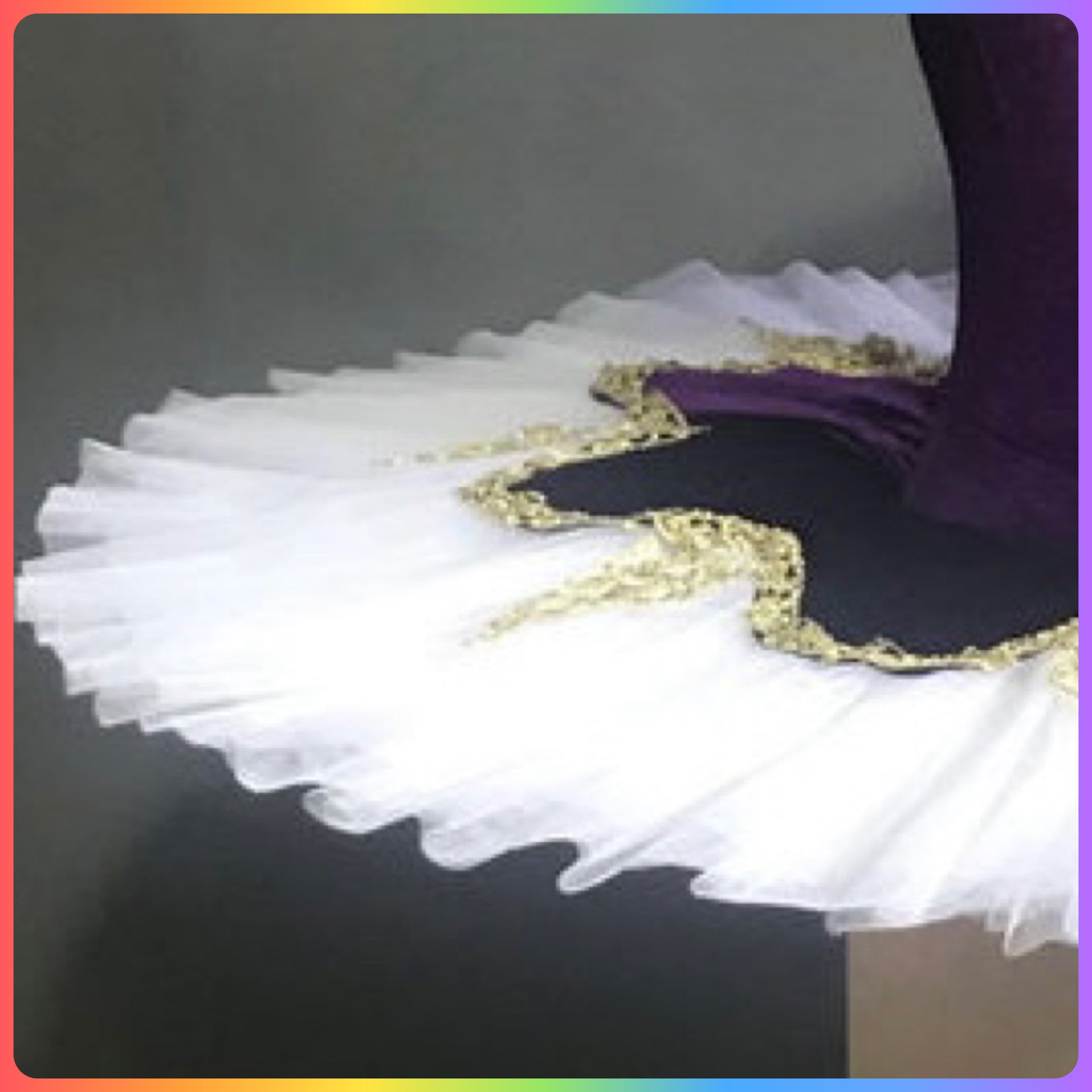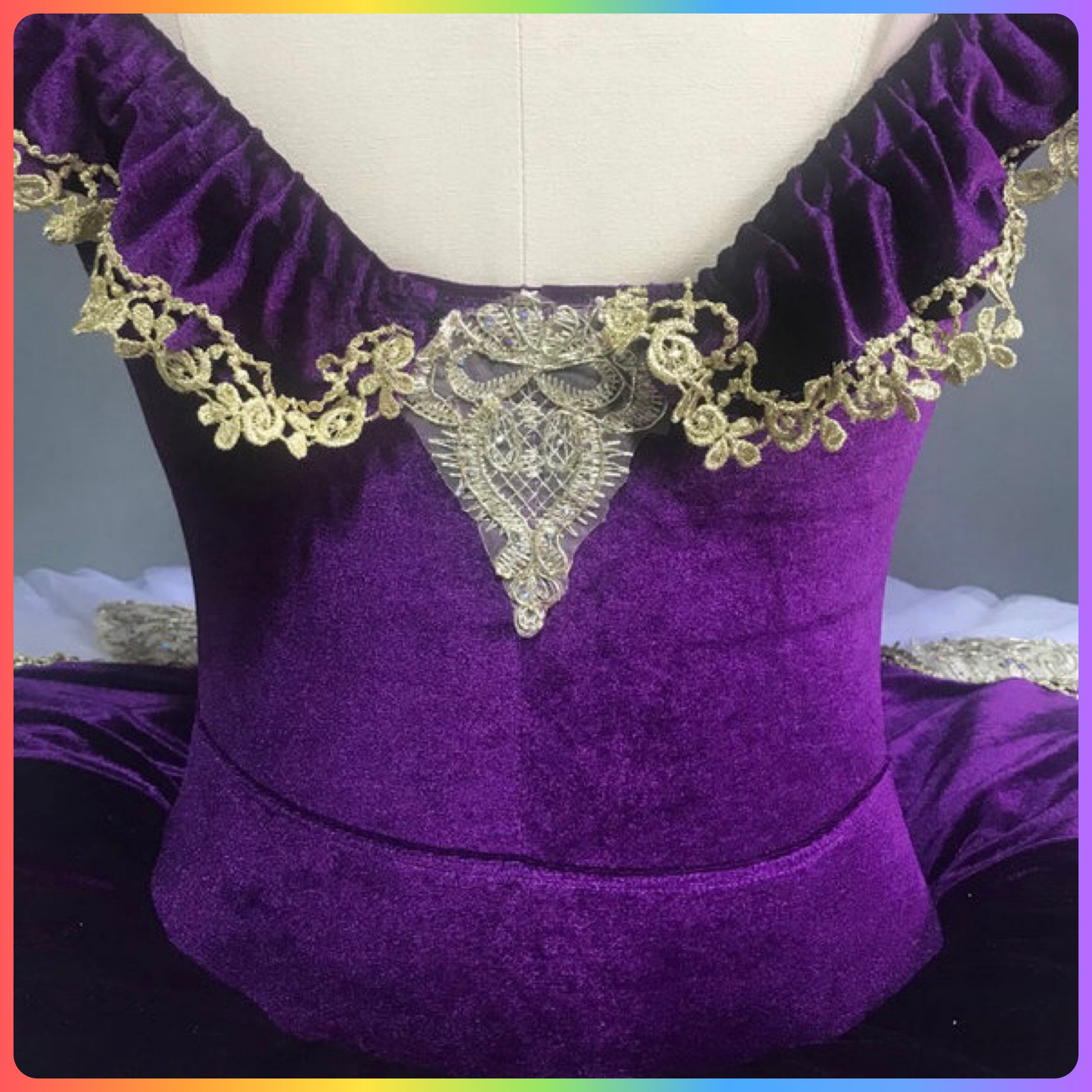 Stretch velvet bodice with gold trim and nude 'v' insert, graduated layers of pleated ballet net to create a stunning pancake tutu with decorated sequin top plate.
