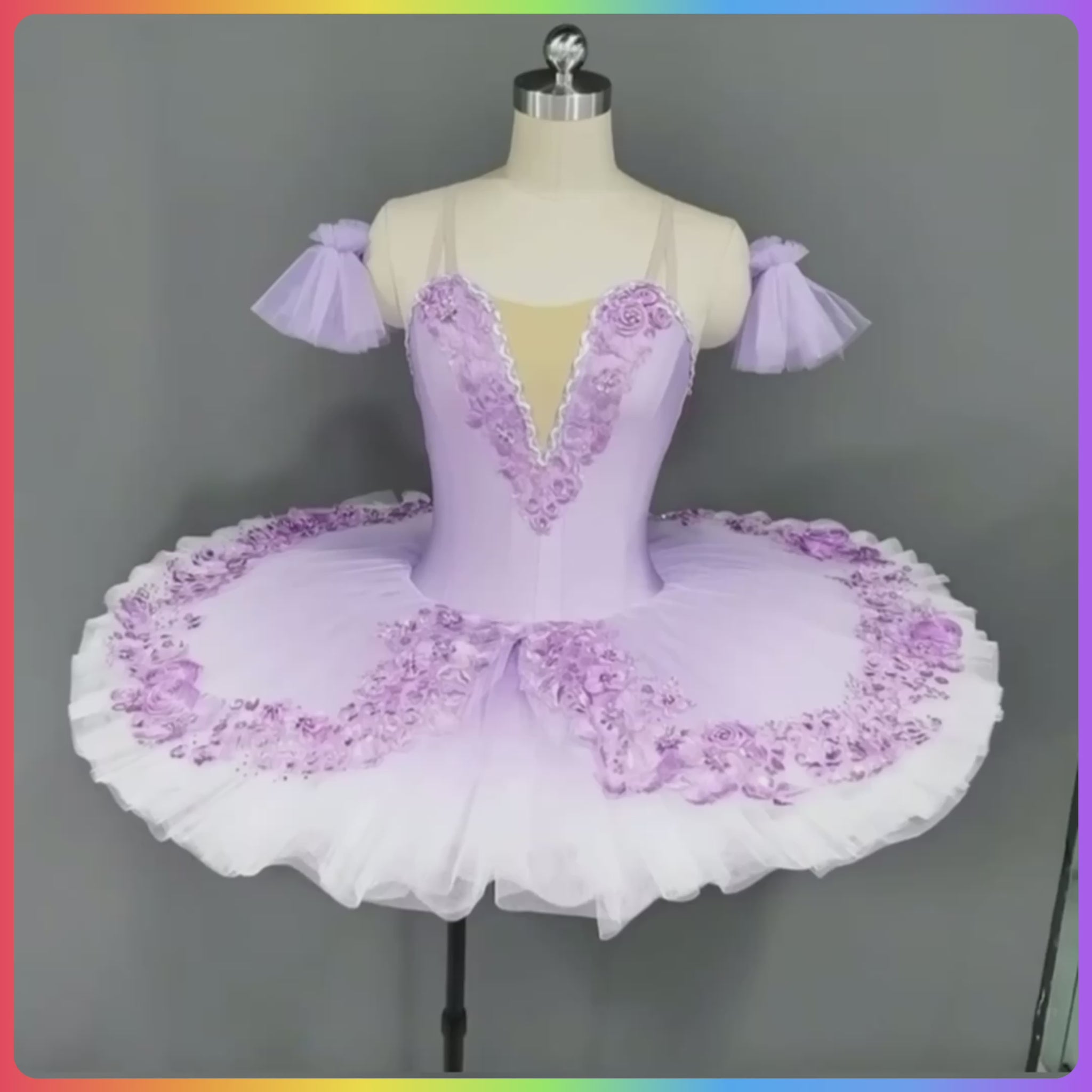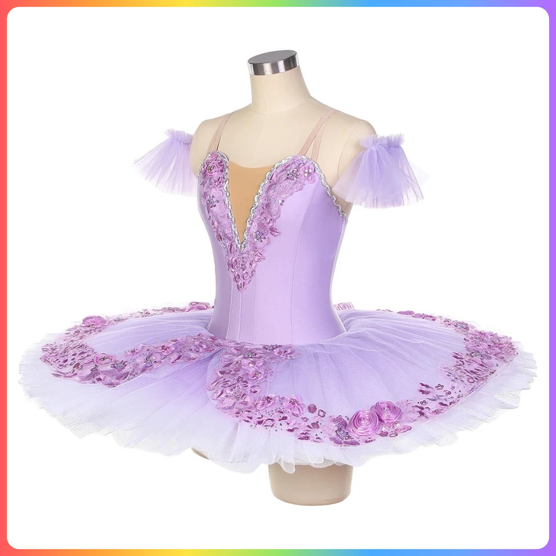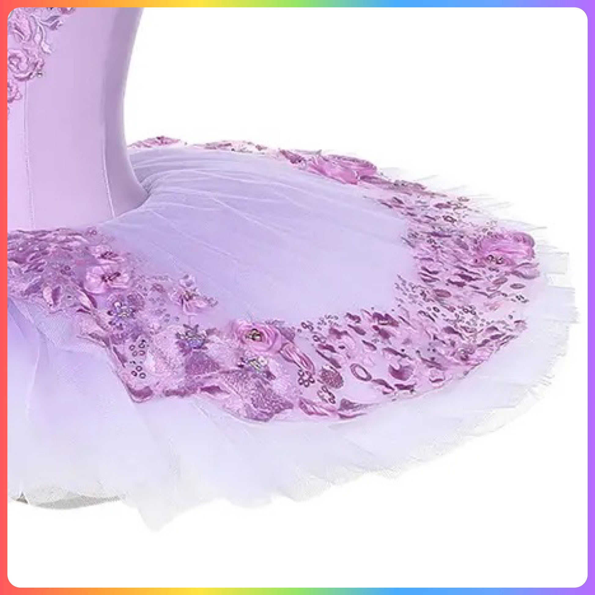 Ombre Purple Stretch Spandex bodice with purple floral trim and nude 'V' neckline, graduated layers of pleated ballet net to create a stunning pancake tutu with decorated top plate.