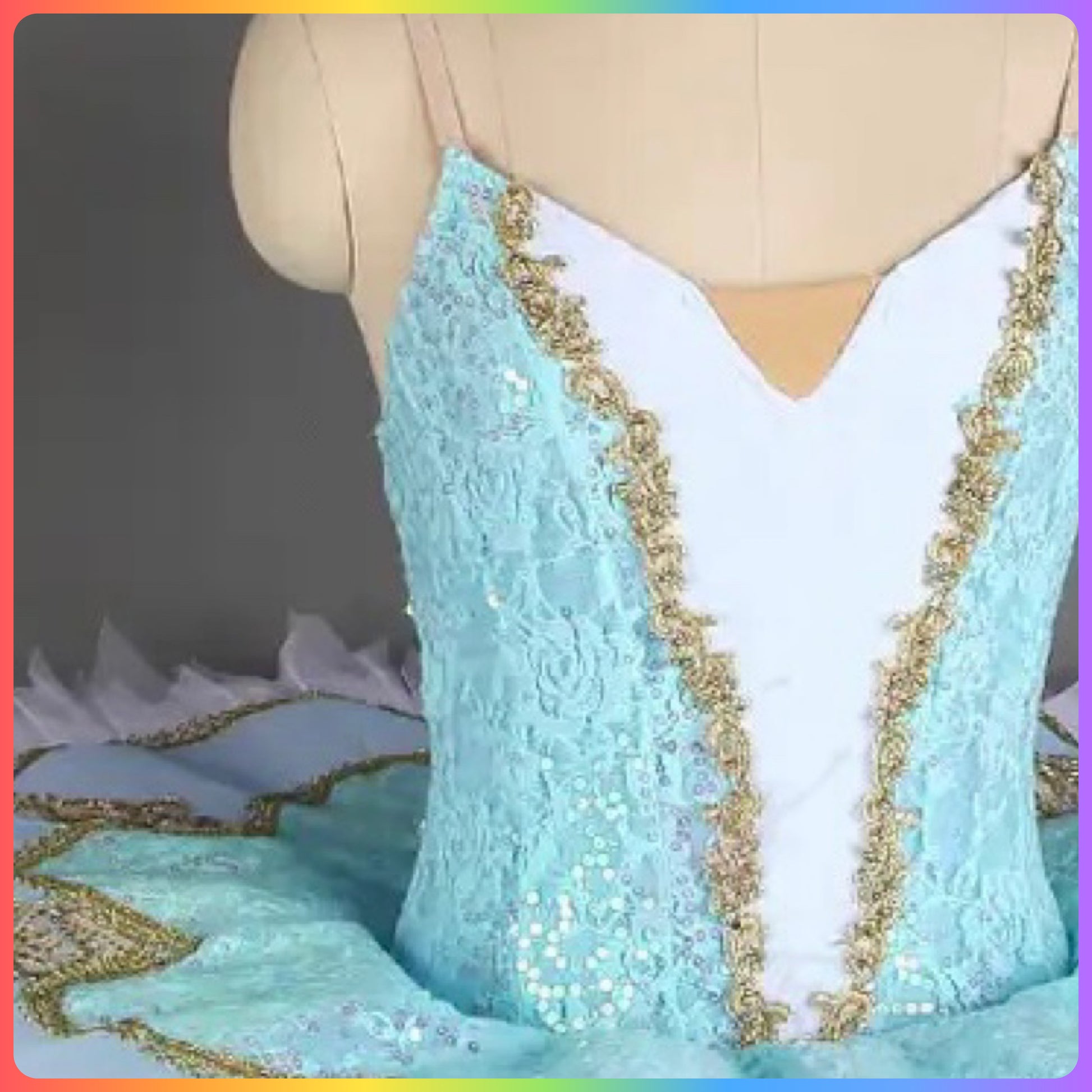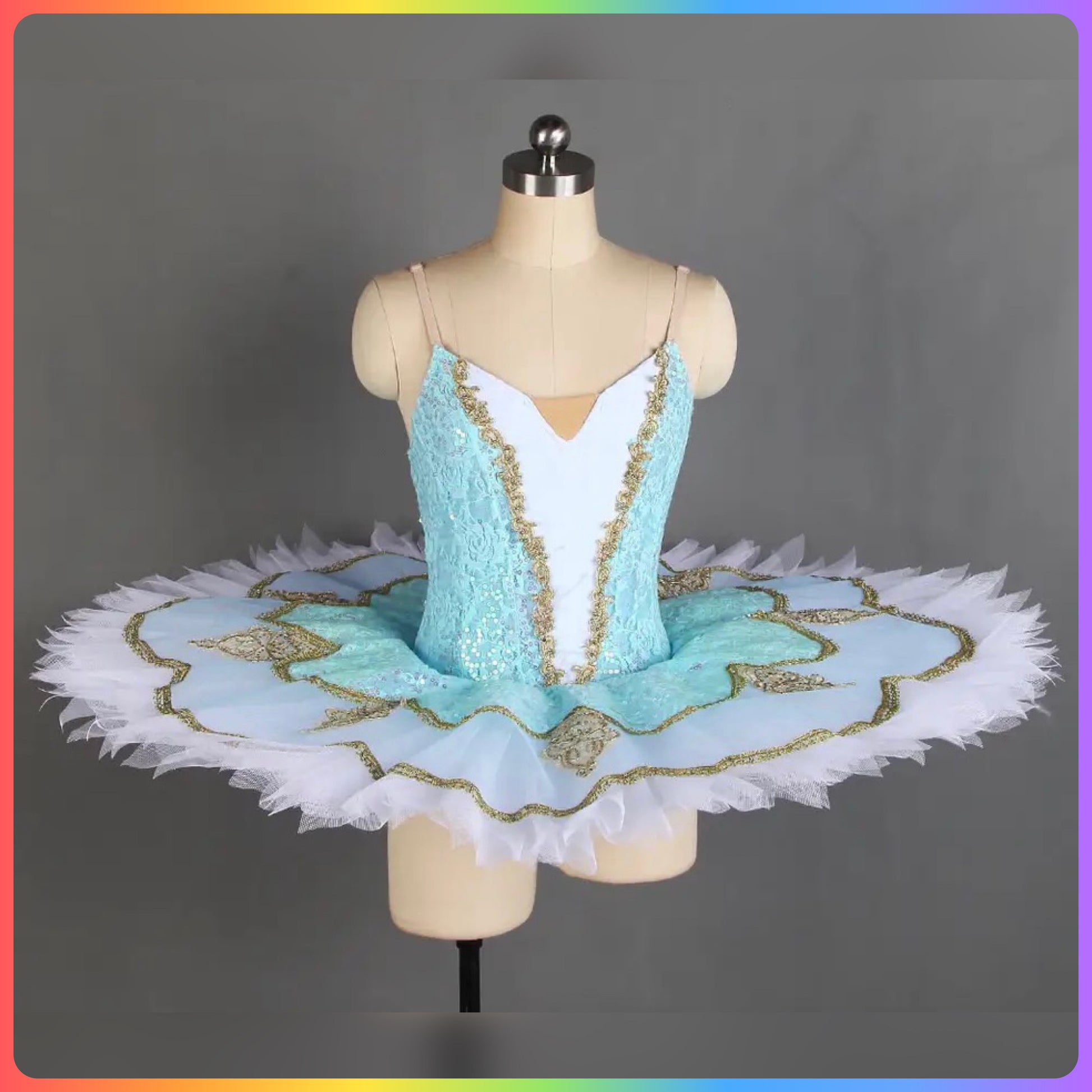 Stretch sequin lace and spandex bodice with gold trim and nude 'v' panel, graduated layers of pleated ballet net to create a stunning pancake tutu with decorated sequin top plate.