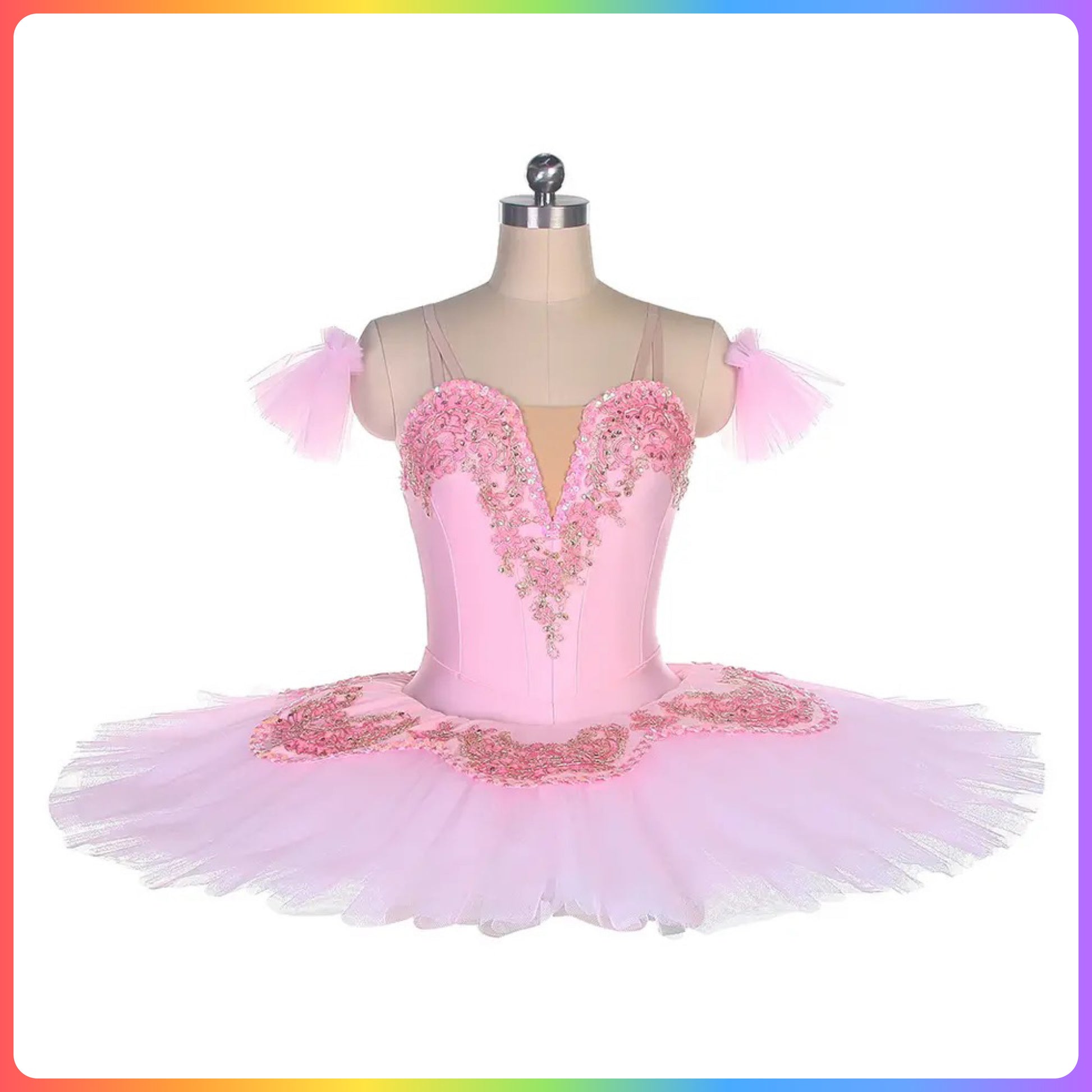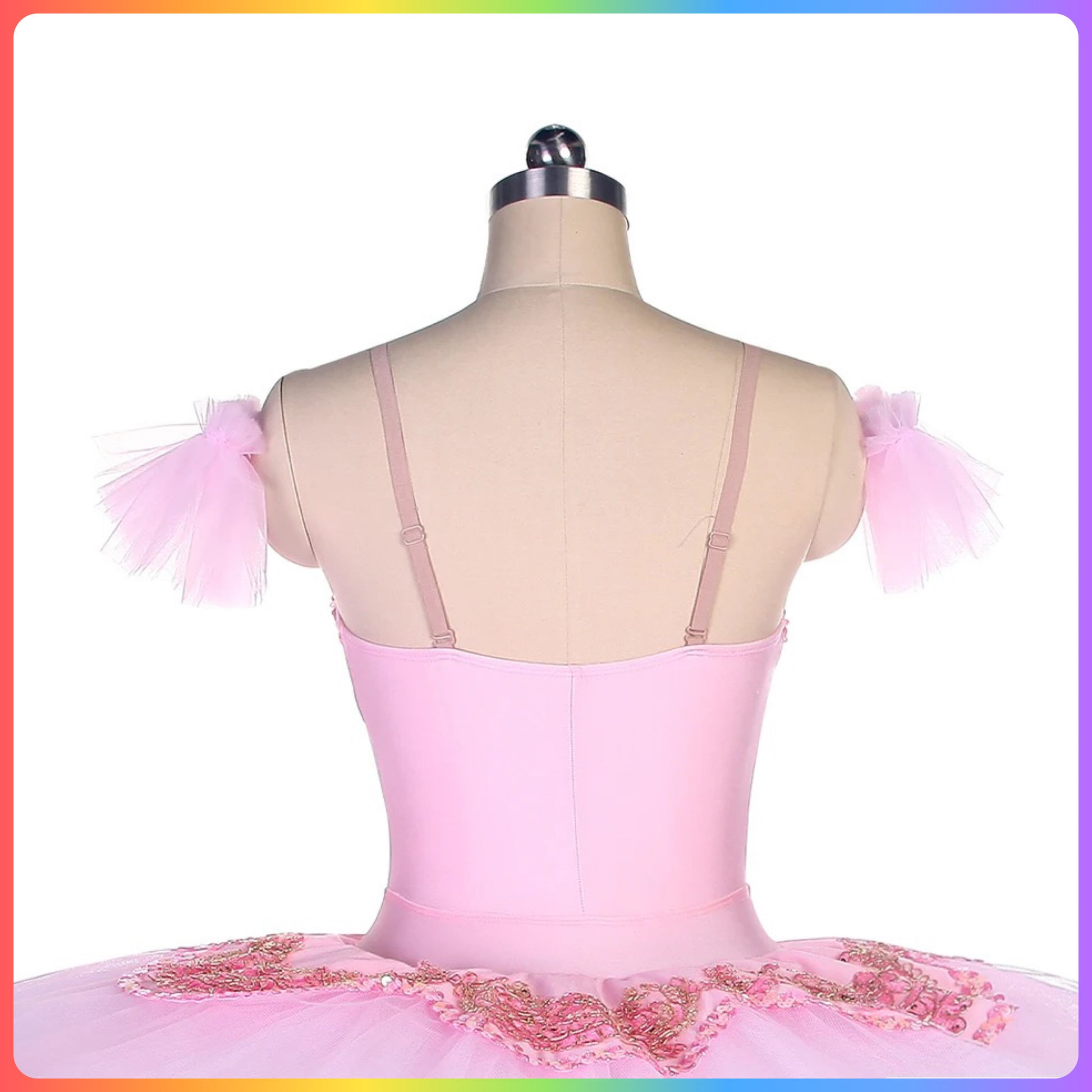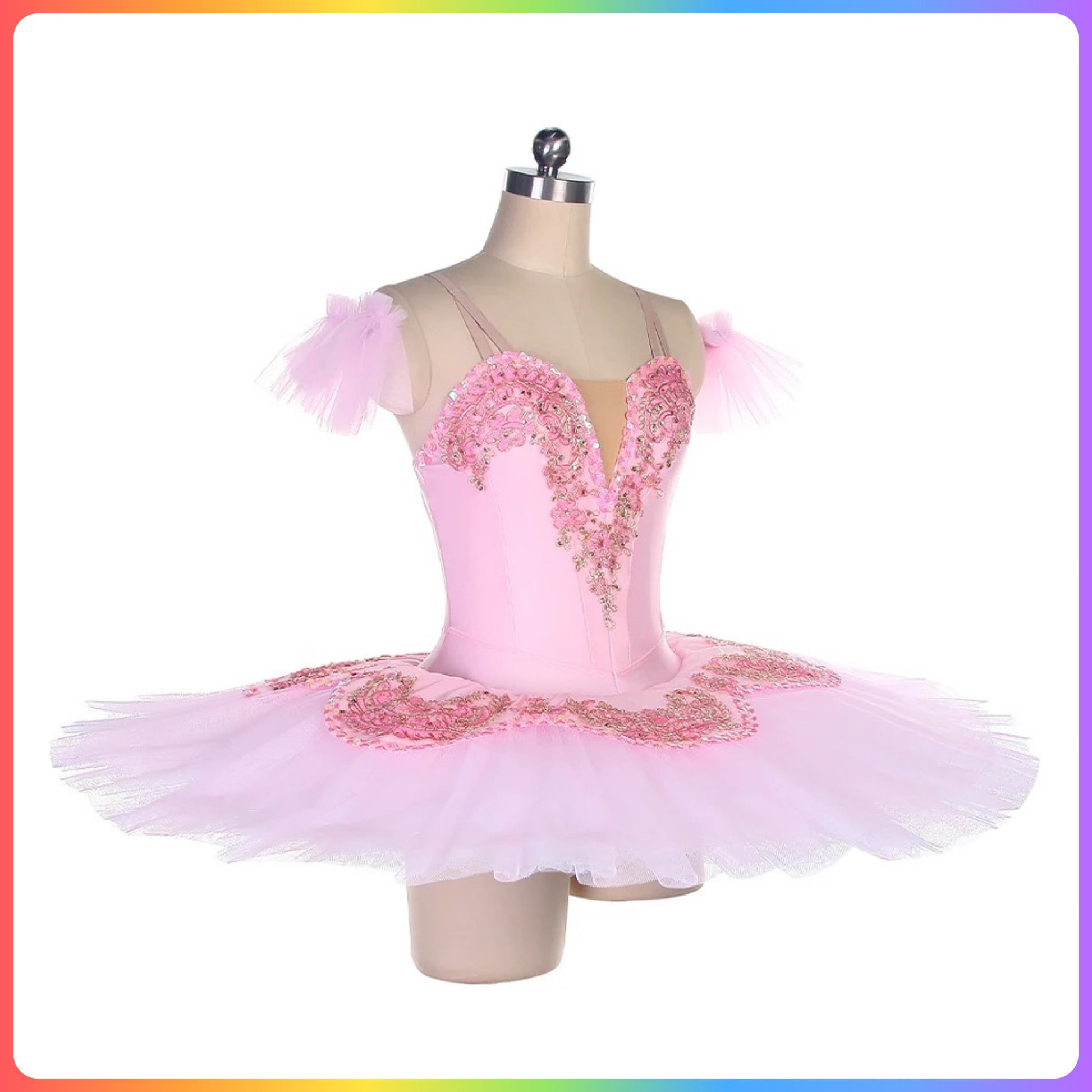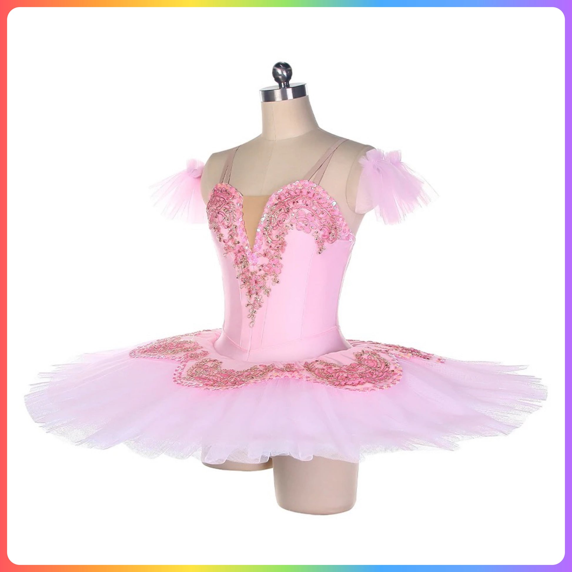 Stretch spandex bodice with pink applique trim and nude 'v' panel, graduated layers of pleated ballet net to create a stunning pancake tutu with decorated sequin top plate.