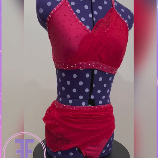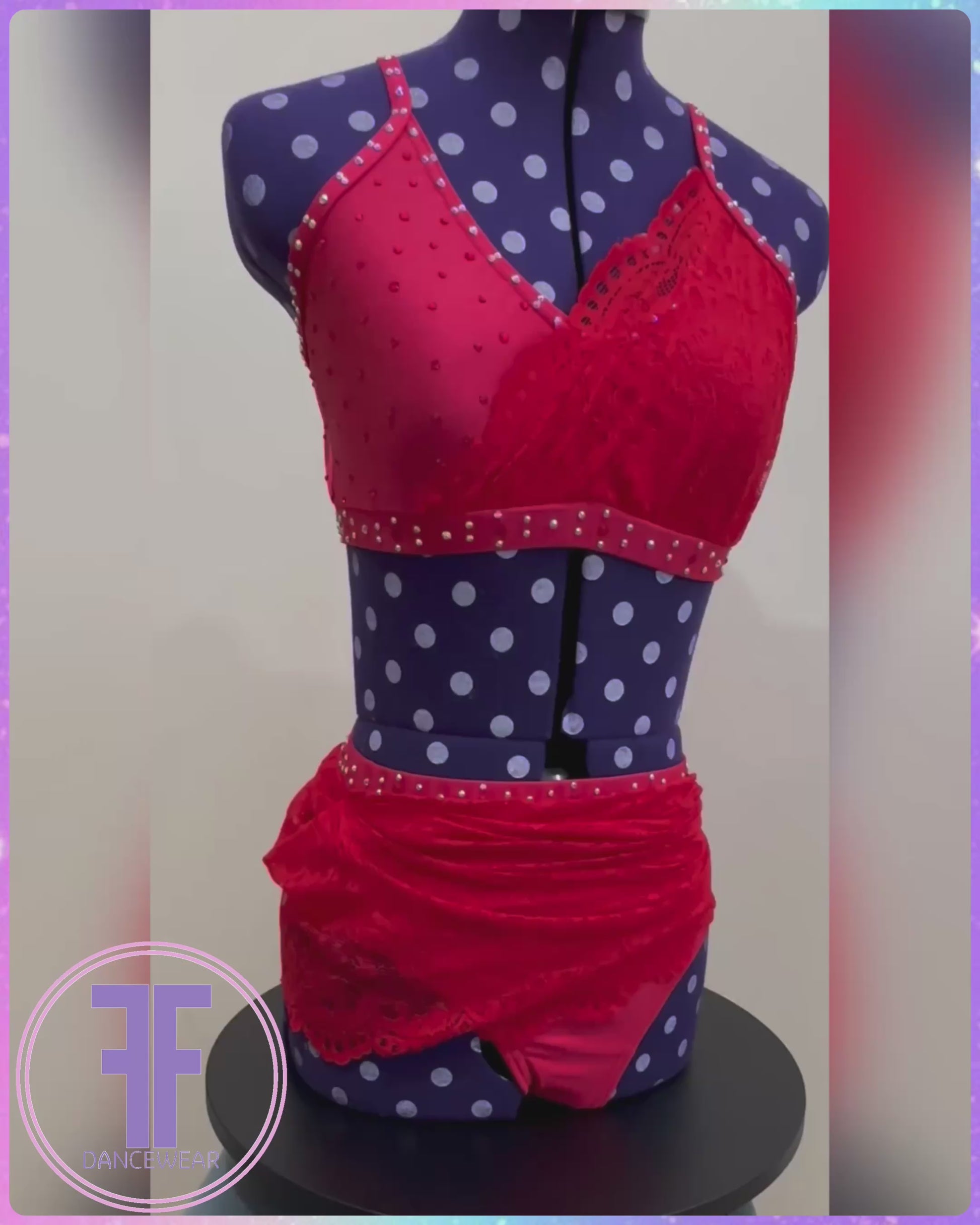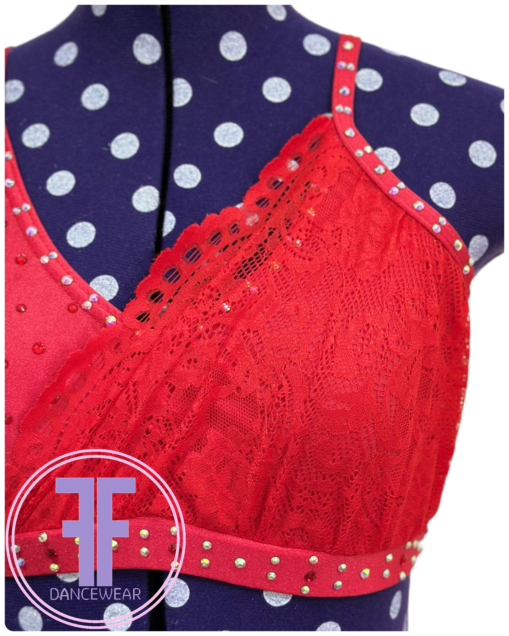 Elevate your lyrical and contemporary performances with this stunning pre-loved bespoke costume. Crafted from luxurious red Lycra, the crop top features an elegant stretch lace drape that moves beautifully with your body, paired with matching pants adorned in coordinating lace detailing.