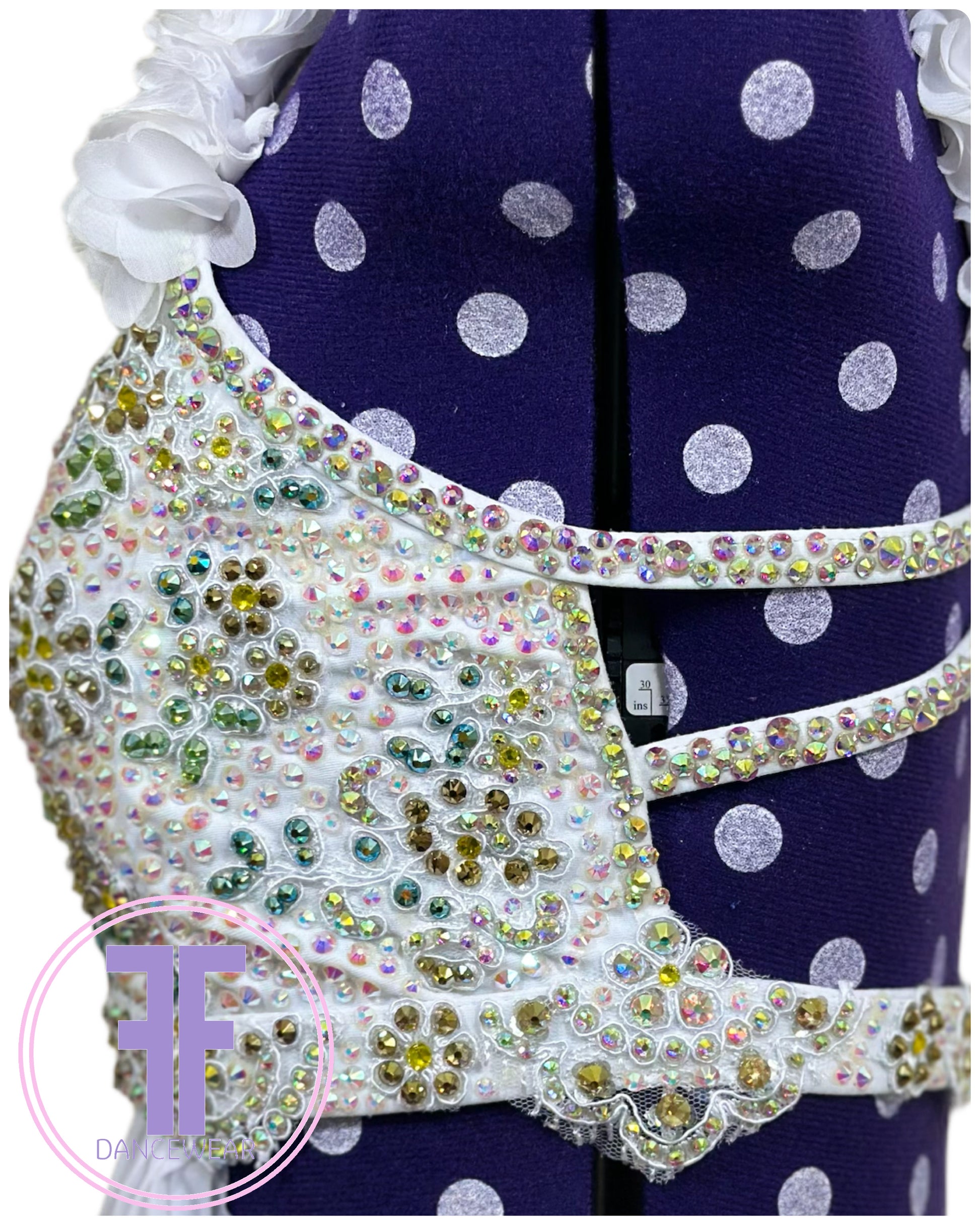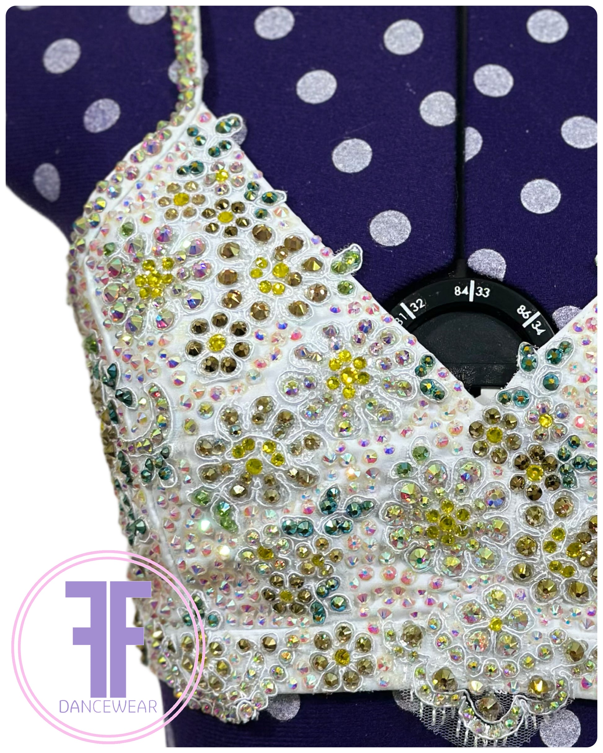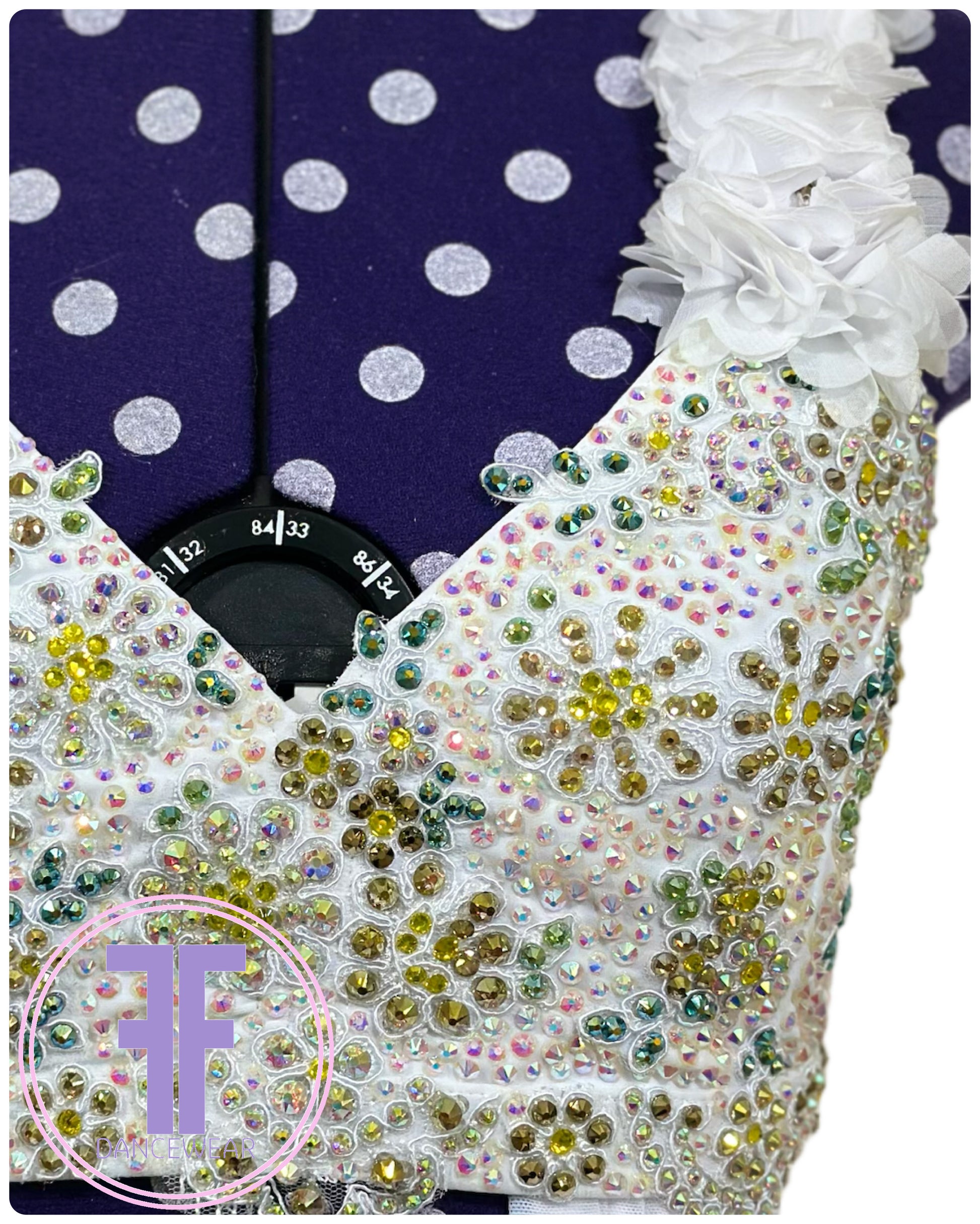 Decorated with white chiffon flowers, white appliqués and superior quality 2088 star cut crystals in AB, Transparent AB, Citrine, Emerald AB, Gold AB, Peridot and Peridot AB.
