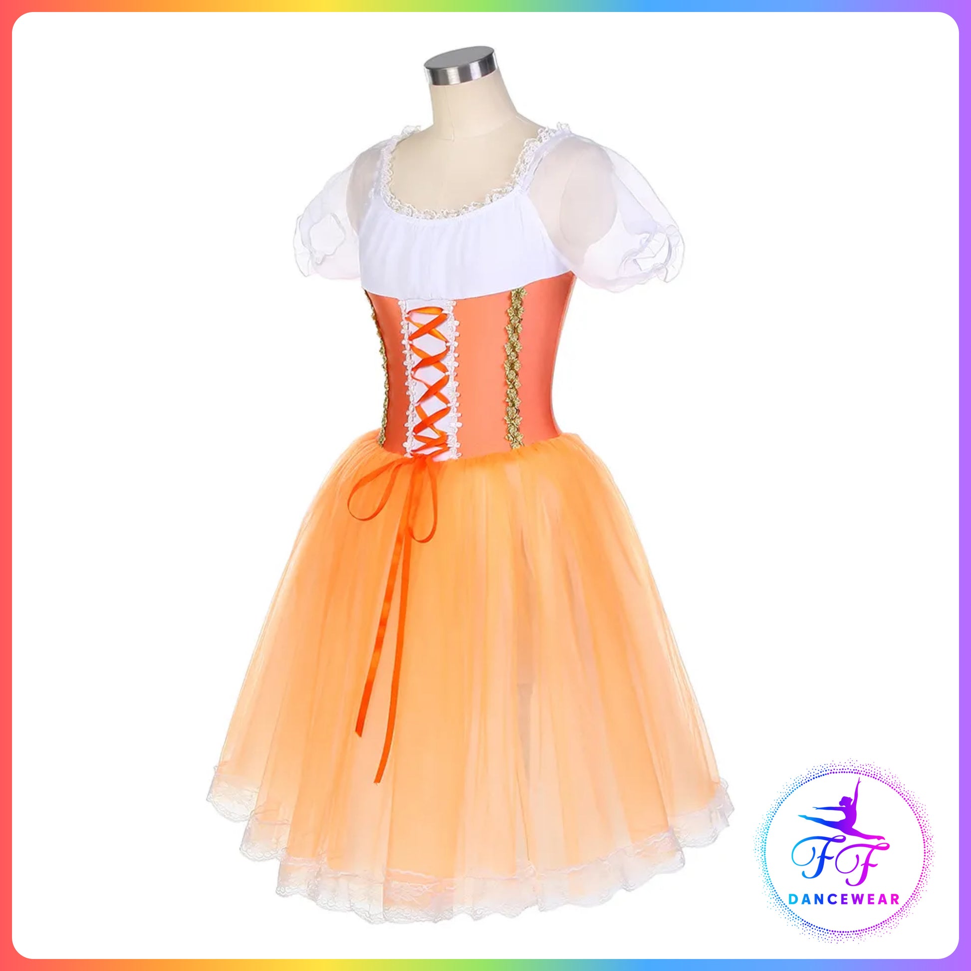 Spandex bodice with lace up design, short puff sleeves, and tulle skirt. Available in Aqua, Green, Orange, Pale Pink, Purple, Yellow or Hot Pink.