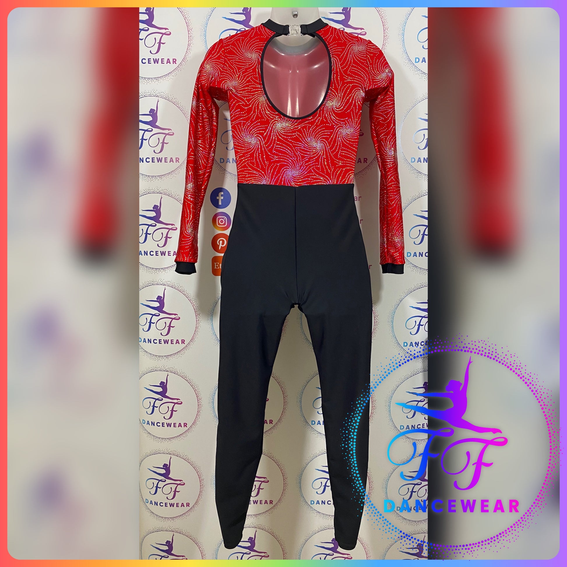 Red and silver holographic print Lycra long sleeve bodice with keyhole back and long leg unitard in Matt black Lycra.