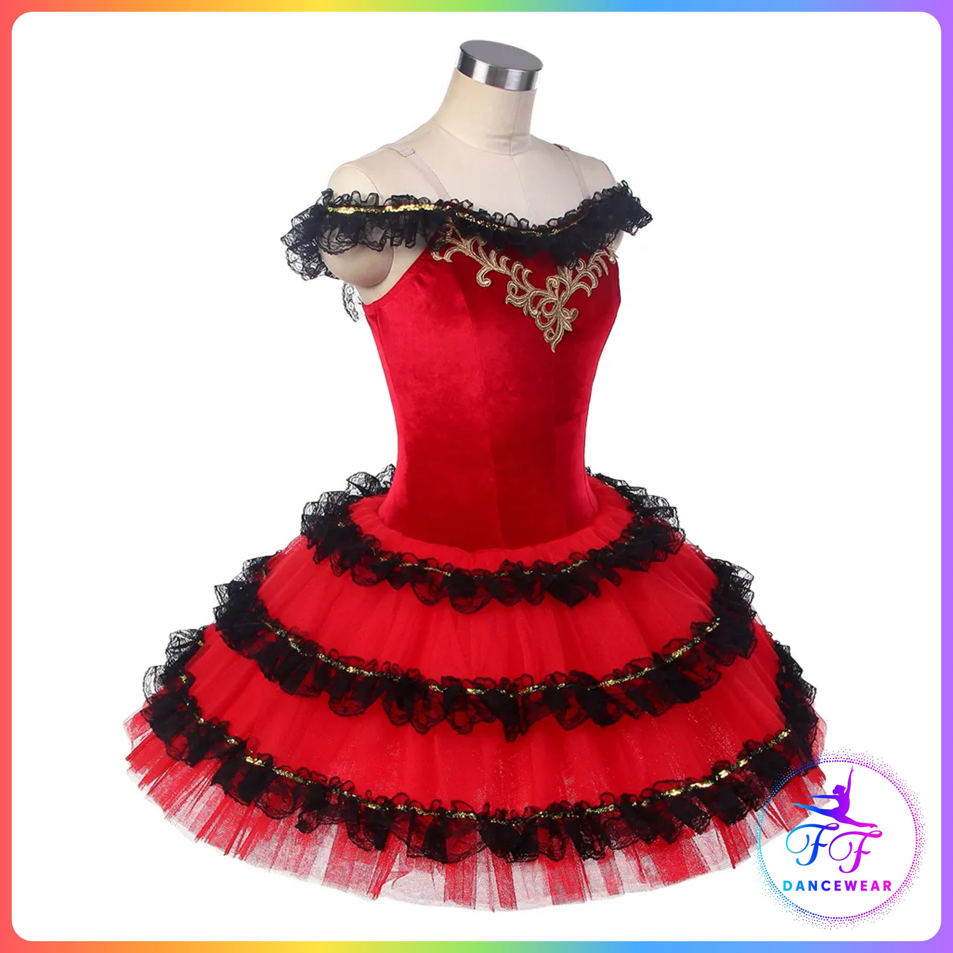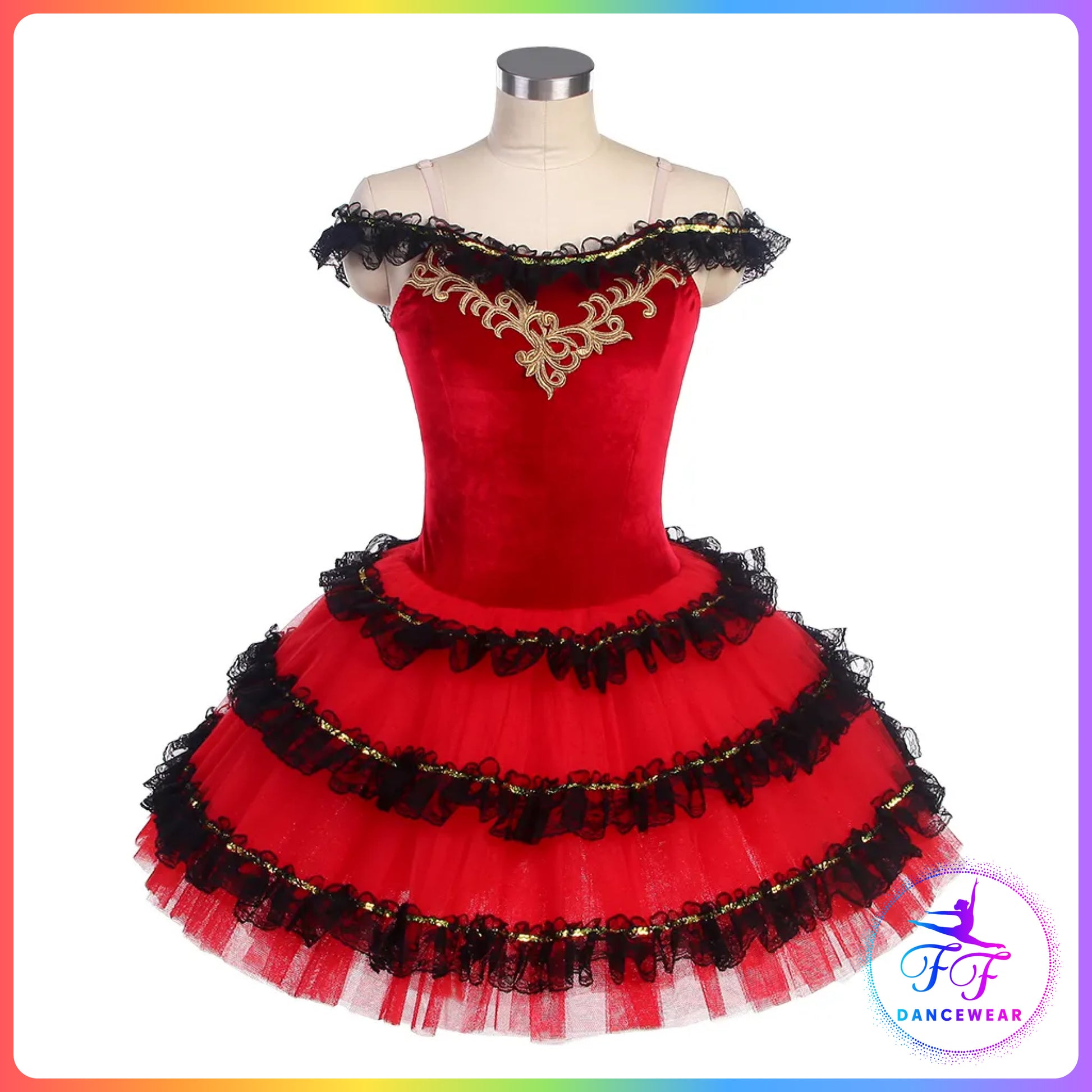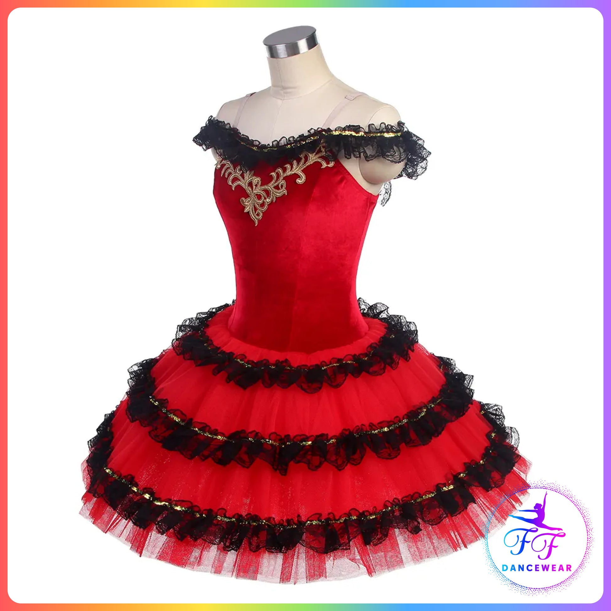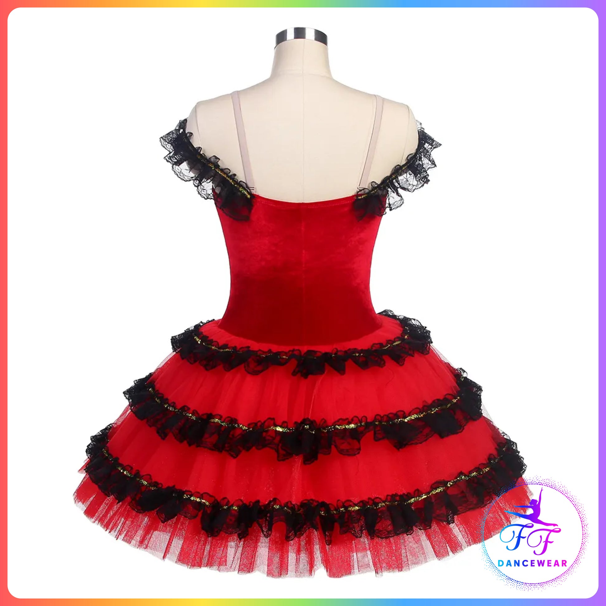 Off the shoulder Spanish style ballet dance tutu dress. Red stretch velvet bodice with black trim. Child size XSC, SC, MC with graduated 5 layers of pleated tulle, and child size LC, XLC, XXLC with graduated 6 layers of pleated tulle, while adult size graduated 7 layers of pleated tulle.
