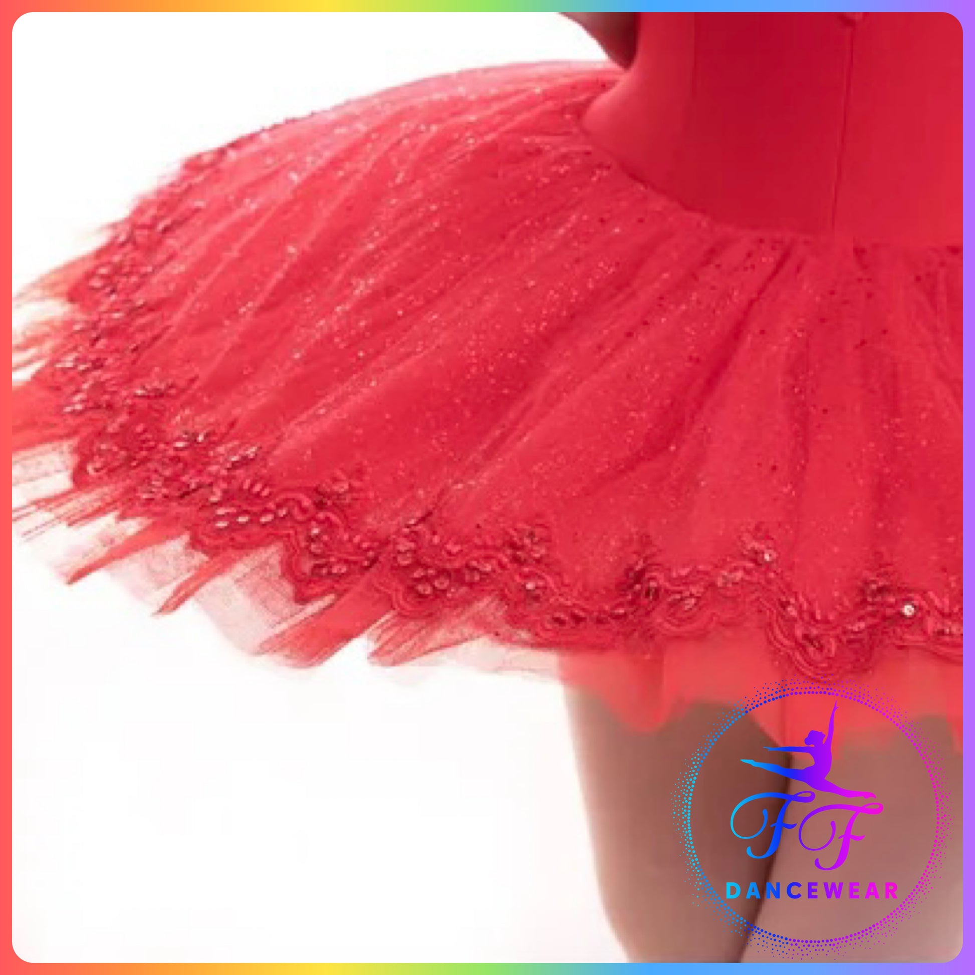 Red spandex stretch bodice with nude 'v' neck, graduated layers of pleated ballet net to create a stunning pancake tutu with a decorated sparkle top plate.