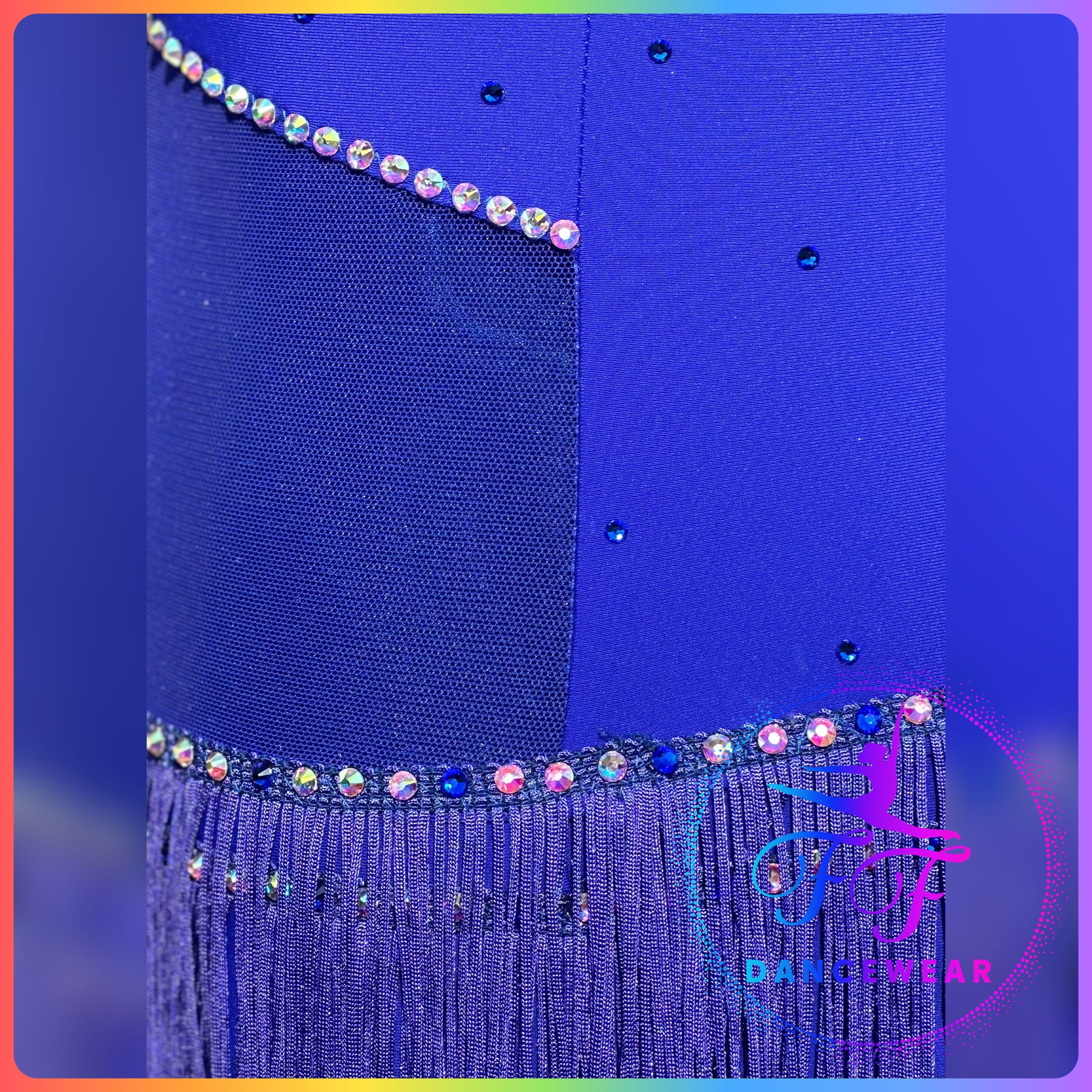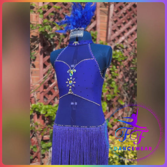 Sapphire Matt Lycra and matching mesh leotard with attached two layers of 30cm sapphire blue stretch fringe.