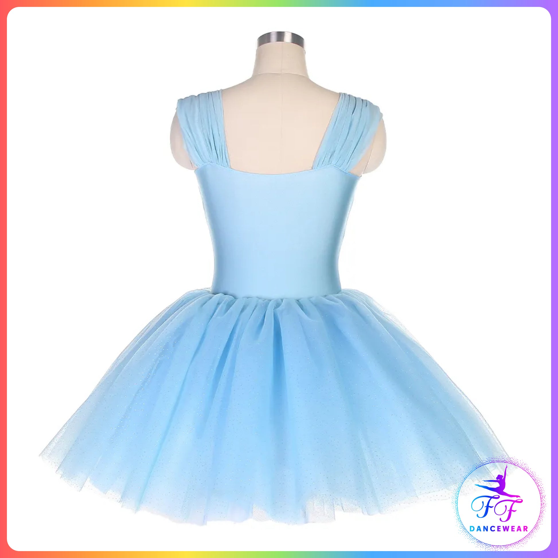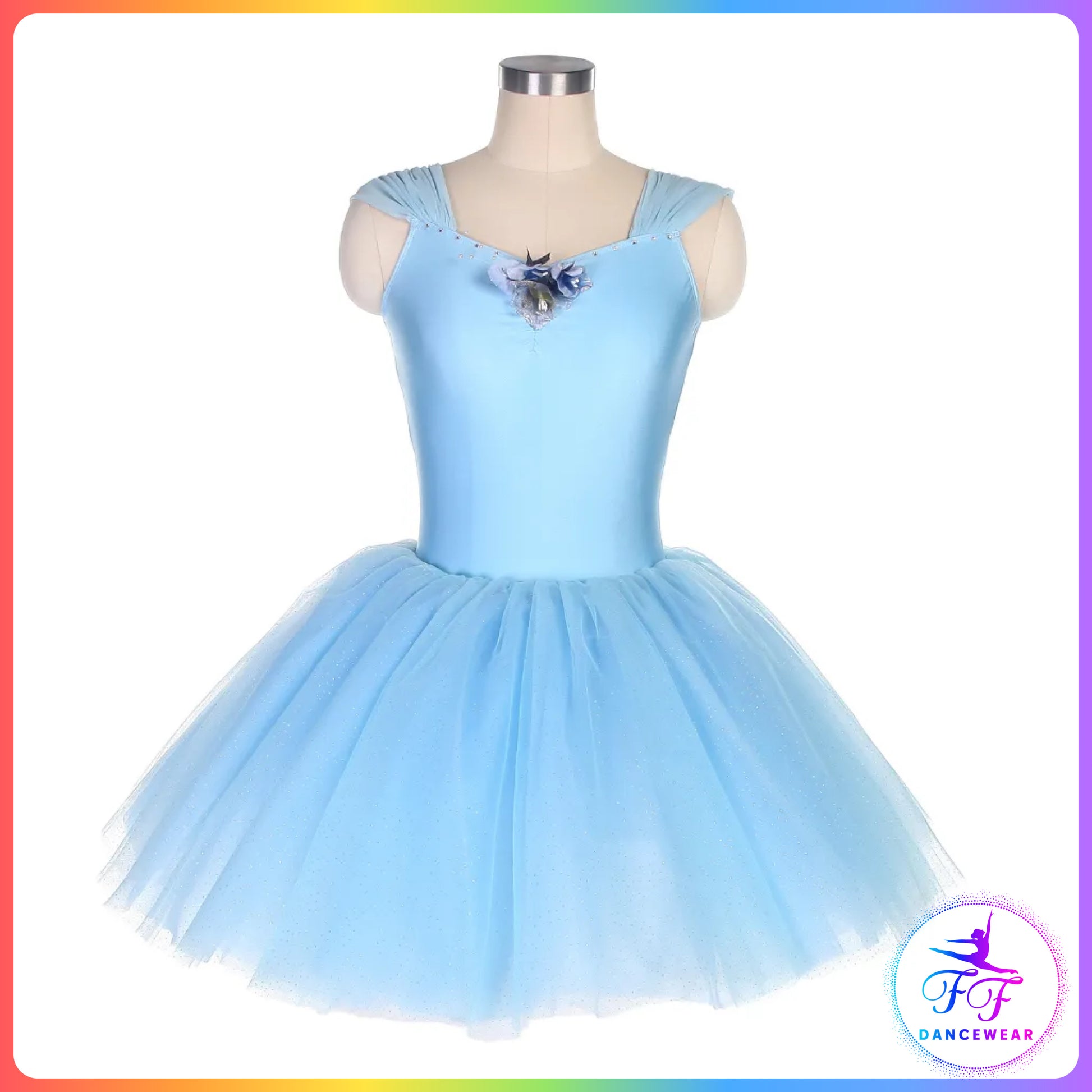 Stretch light blue spandex bodice with flower, and attached tulle bell shaped tutu skirt.