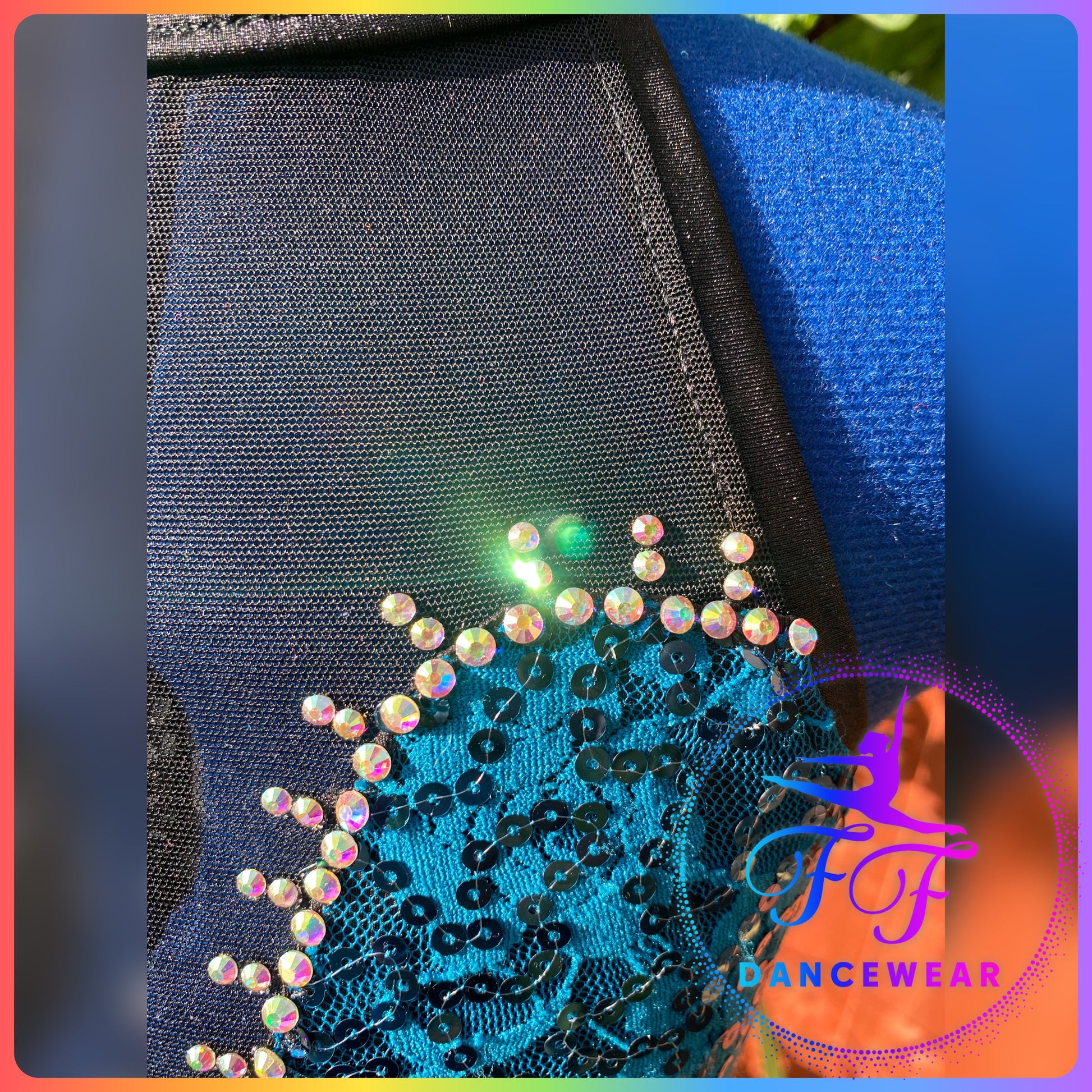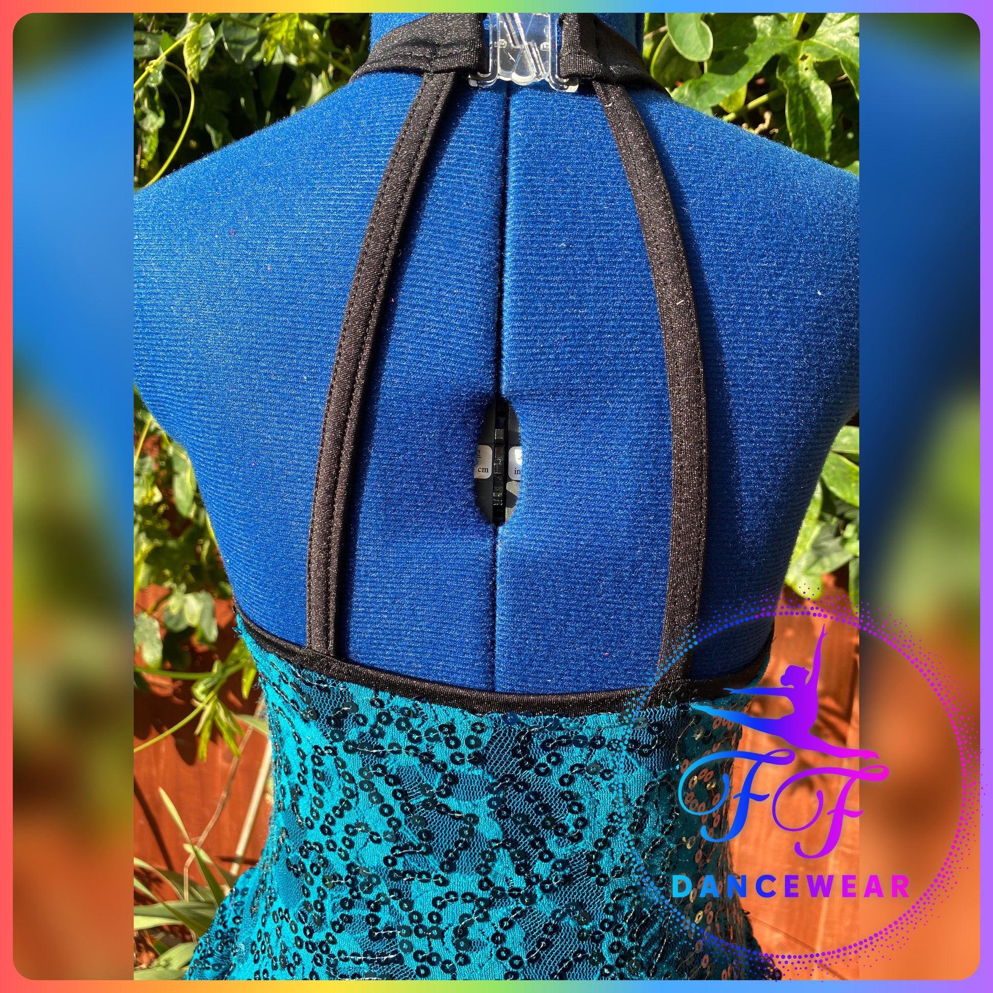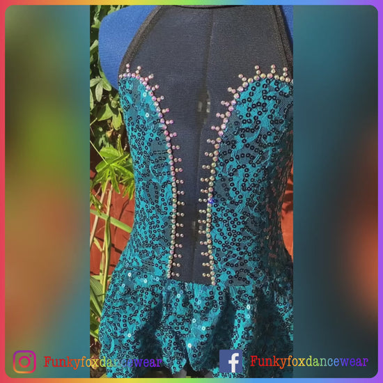 Stretch Teal Sequin Lace (lined with black Lycra) and black mesh halterneck leotard with attached two layer open skirt in black stretch mesh and teal lace.