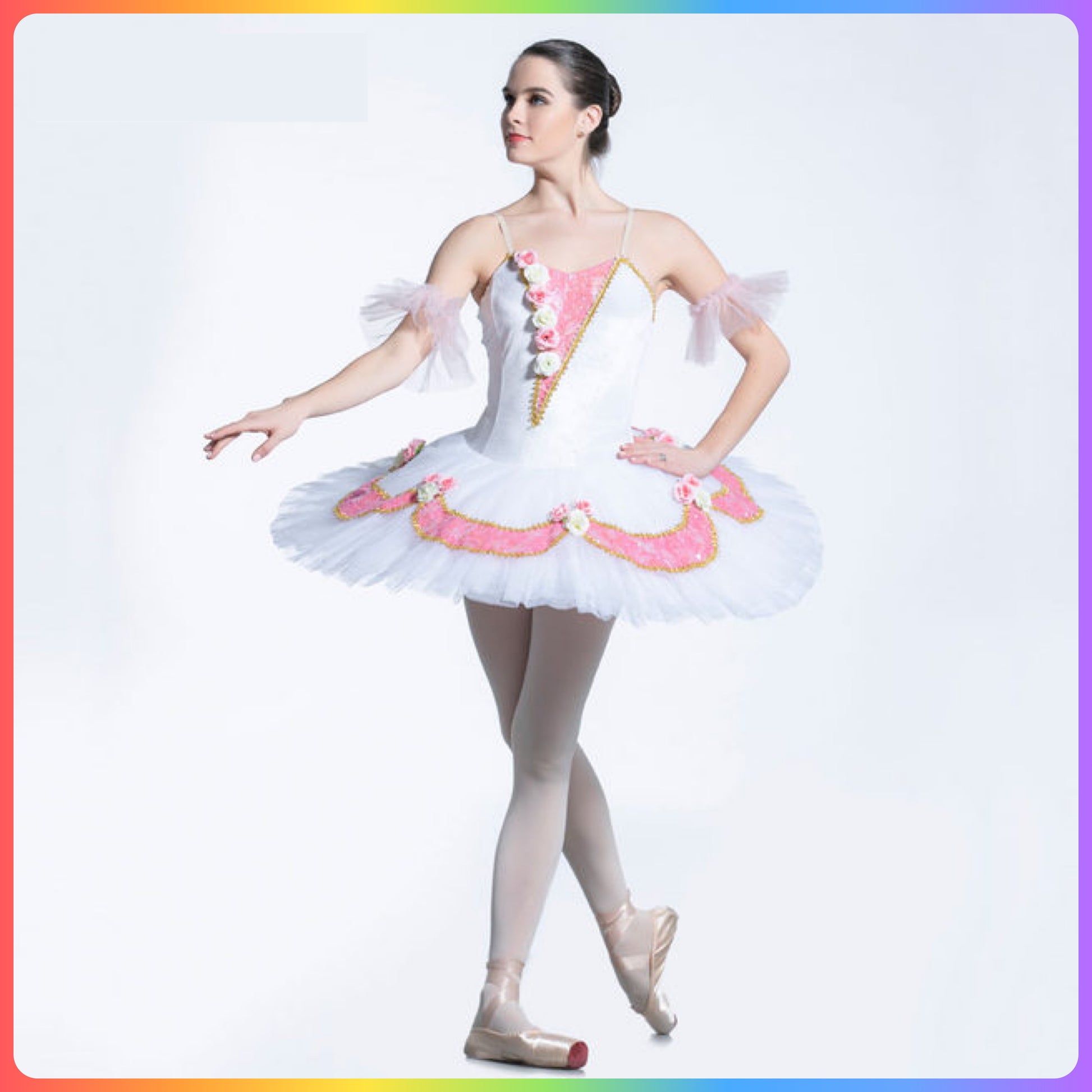 Stretch velvet bodice with sequin insert and flowers, graduated layers of pleated ballet net to create a stunning pancake tutu with decorated sequin top plate.
