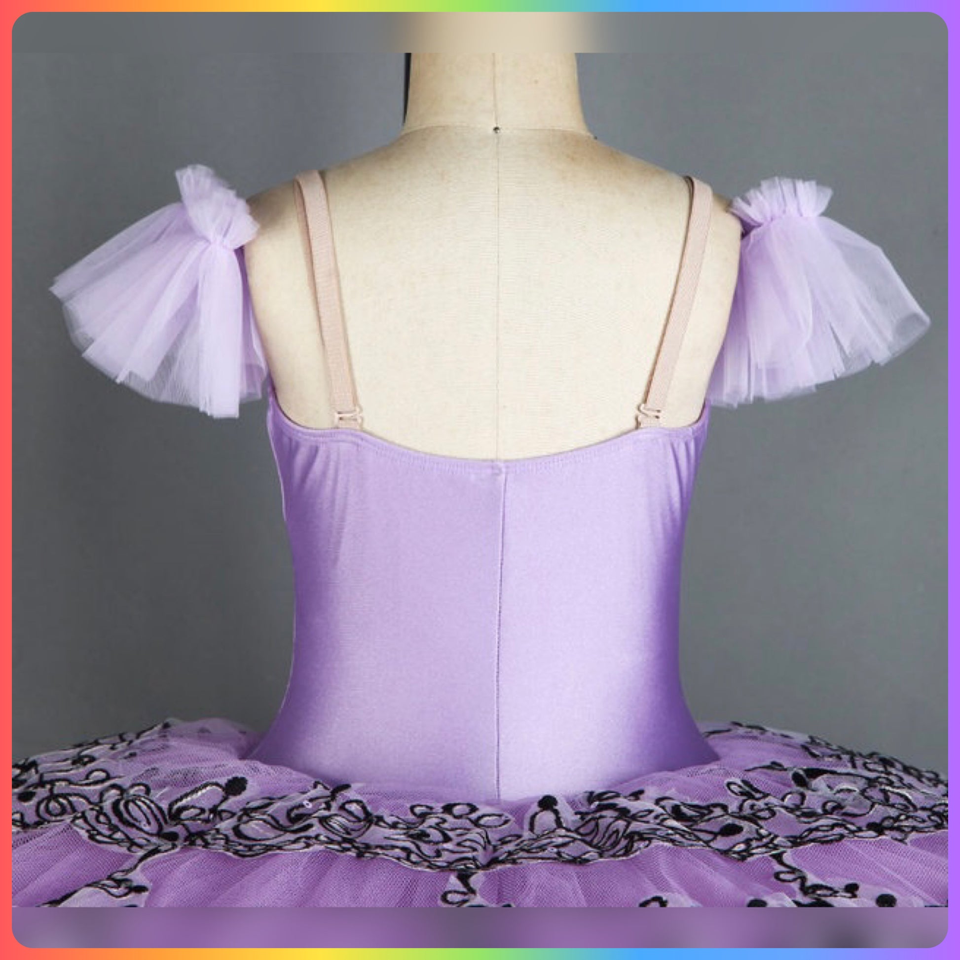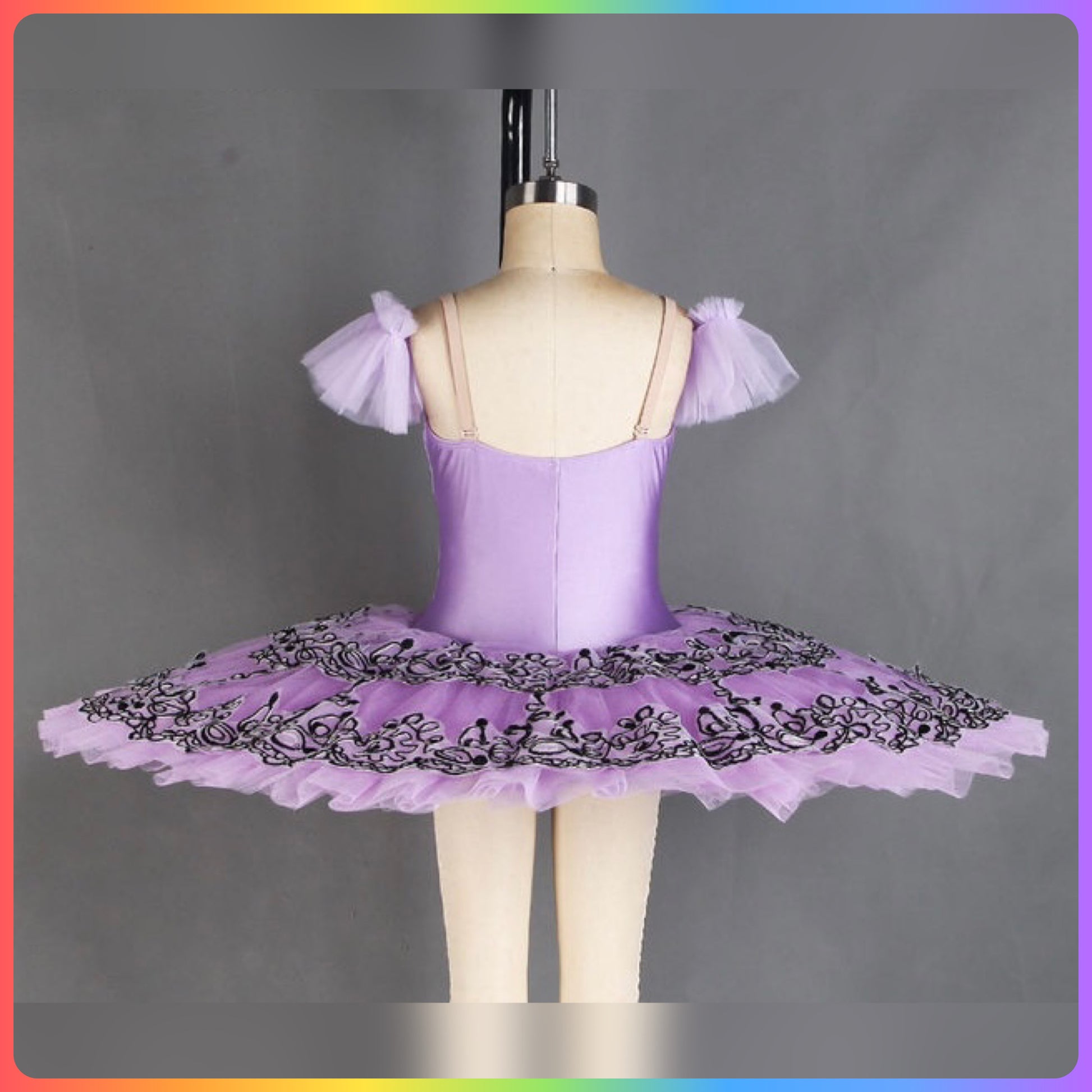 Spandex bodice with black applique trim and nude 'v' panel, tulle arm bands, graduated layers of pleated ballet net to create a stunning pancake tutu with decorated sequin top plate.