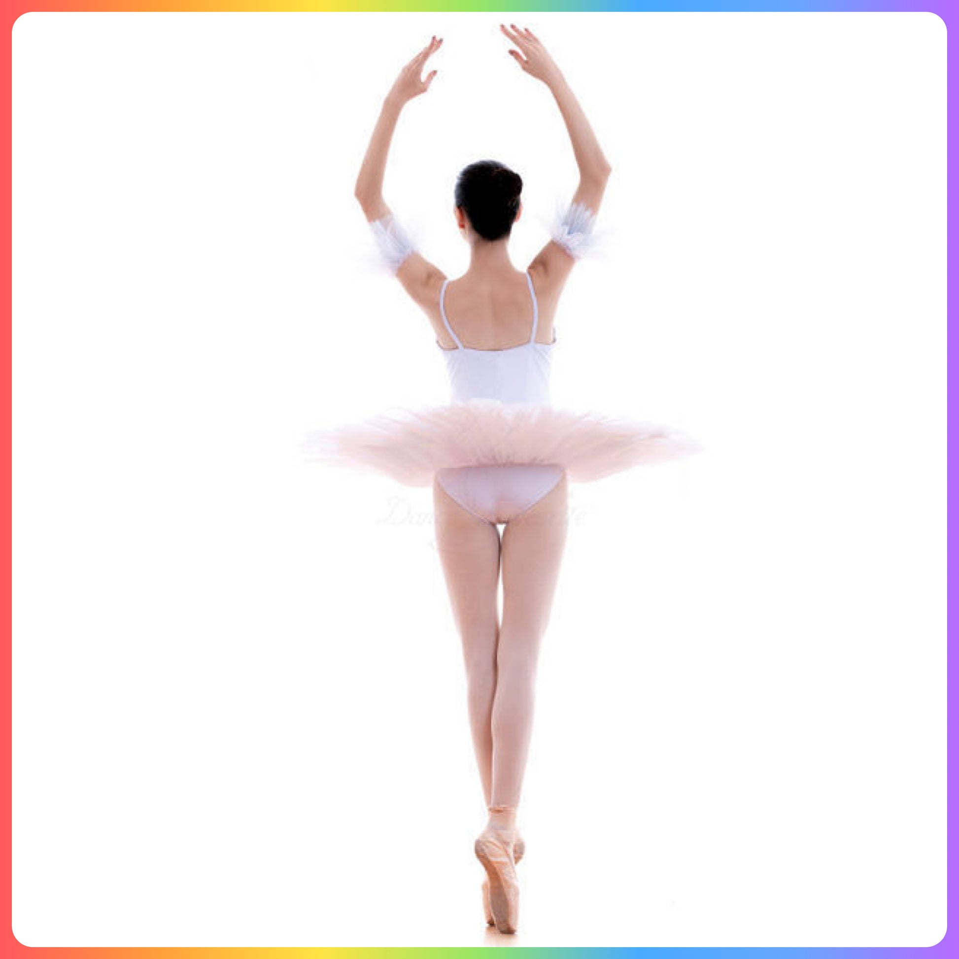 Stretch bodice with floral appliqués, graduated layers of pleated ballet net to create a stunning pancake tutu with decorated top plate.